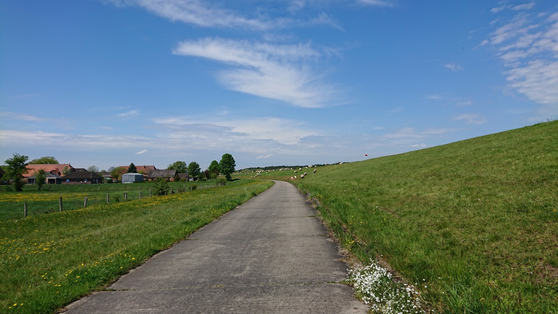 Die nächsten km ist der Deich der Weg. Nur selten kommt uns ein Radfahrer oder Fußgänger entgegen, nur ein oder zwei Mal überholen wir andere. Wir haben den Deich für uns – na ja, der Wind hat ihn auch und bläst uns entgegen und frischt dabei immer mehr auf. Macht nichts oder nur wenig, den wir fahren ein gutes Tempo.