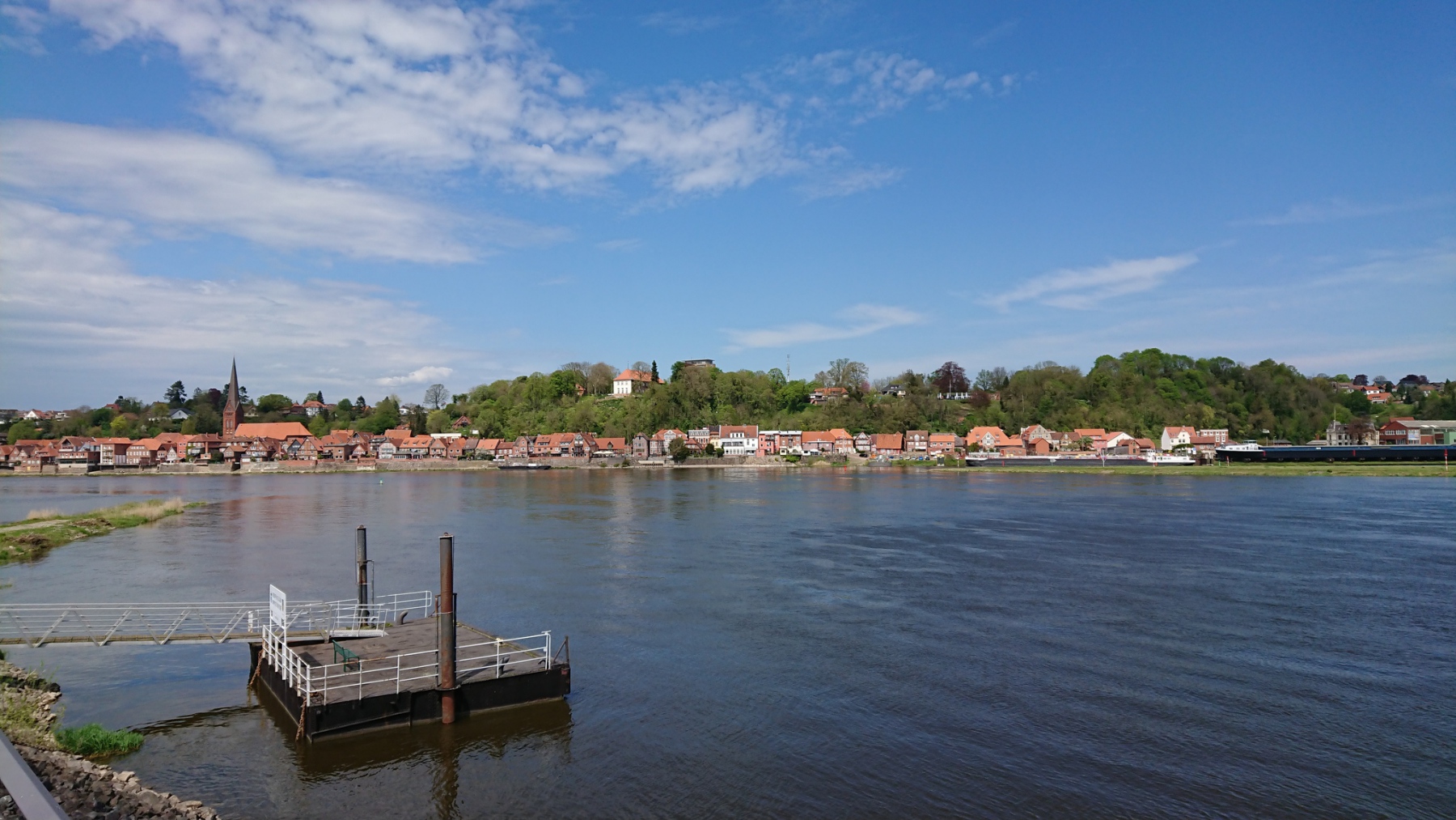 Ein kurzer Stop für den noch vorhandenen Apfel in Hohnstorf gegenüber und mit Blick auf Lauenburg am anderen Elbufer.