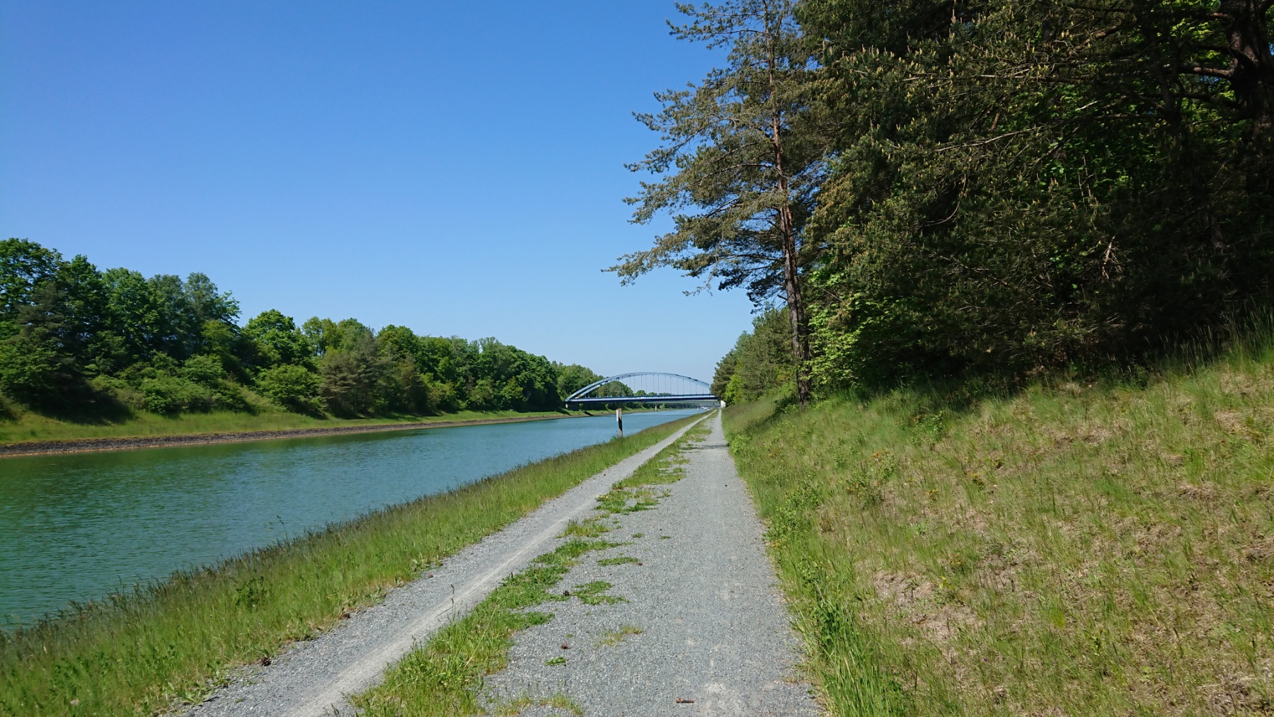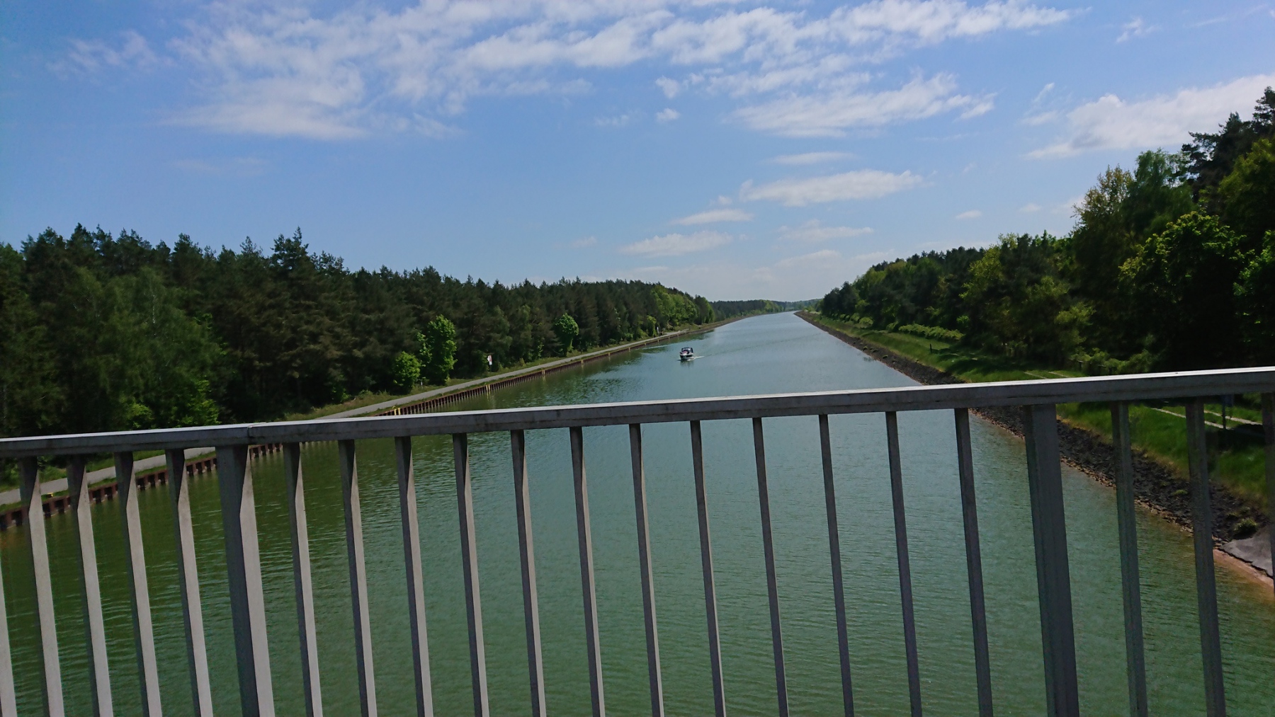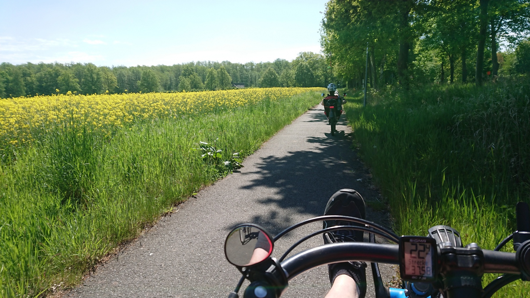 Weiter geht es auf kleinen meist an diesem Sonntag Morgen nur wenig befahrenen Straßen bis an den Elbe-Seiten-Kanal bei Bienenbüttel. Unsere Mittagspause am Kanal ist recht eintönig. Hin und wieder mal ein Radfahrer auf unserer oder der anderen Seite, hin und wieder bellt irgendwo ein Hund und nur ein kleines Sportboot passiert uns auf dem Wasser. Ein Stückchen folgen wir dem Kanal, müssen dann eine Treppen zur Eisenbahnbrücke hoch schieben, fahren auf der Bücke über den Kanal und befinden uns dann auf einem Single-Trail neben einem Feld wieder