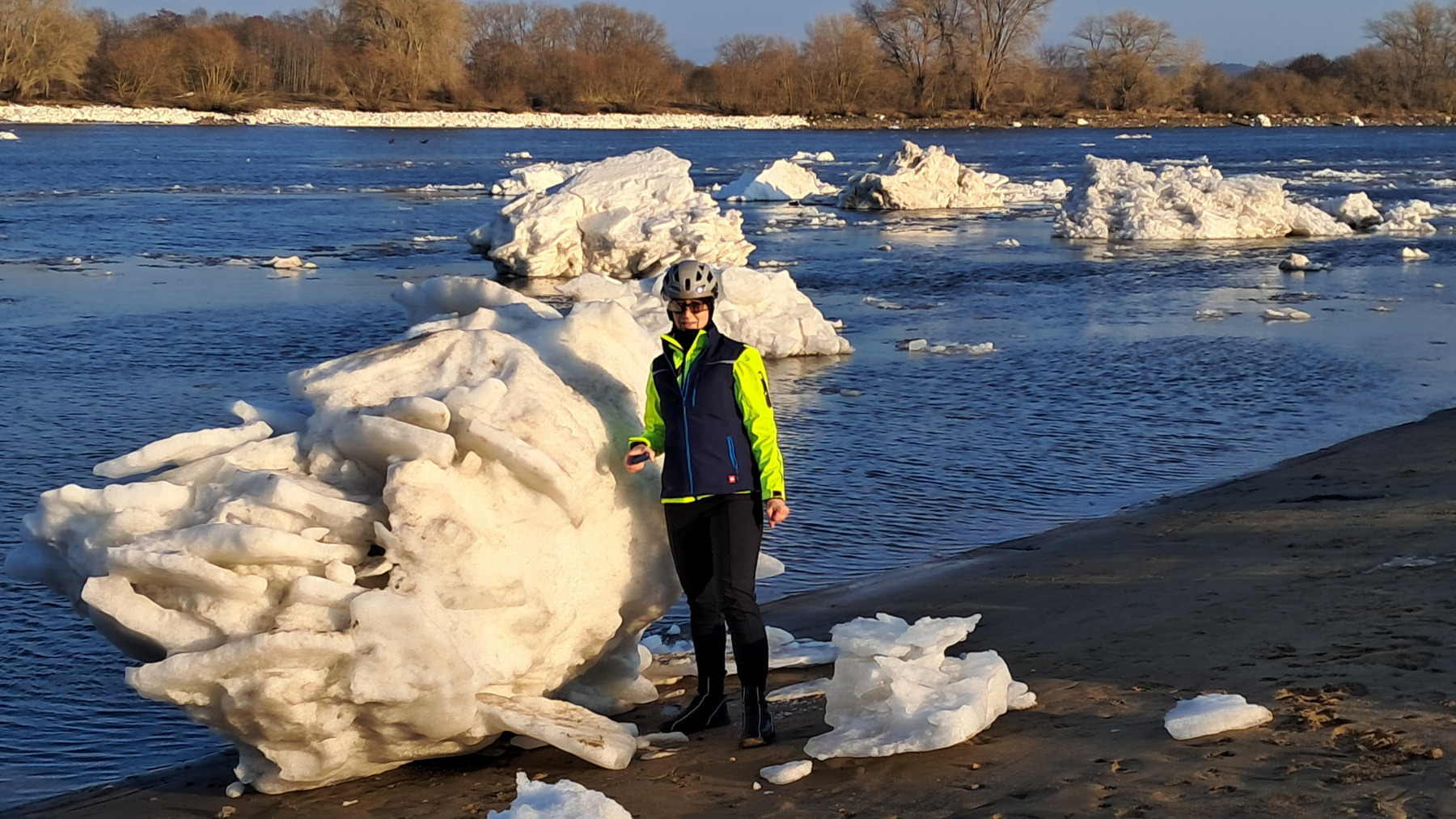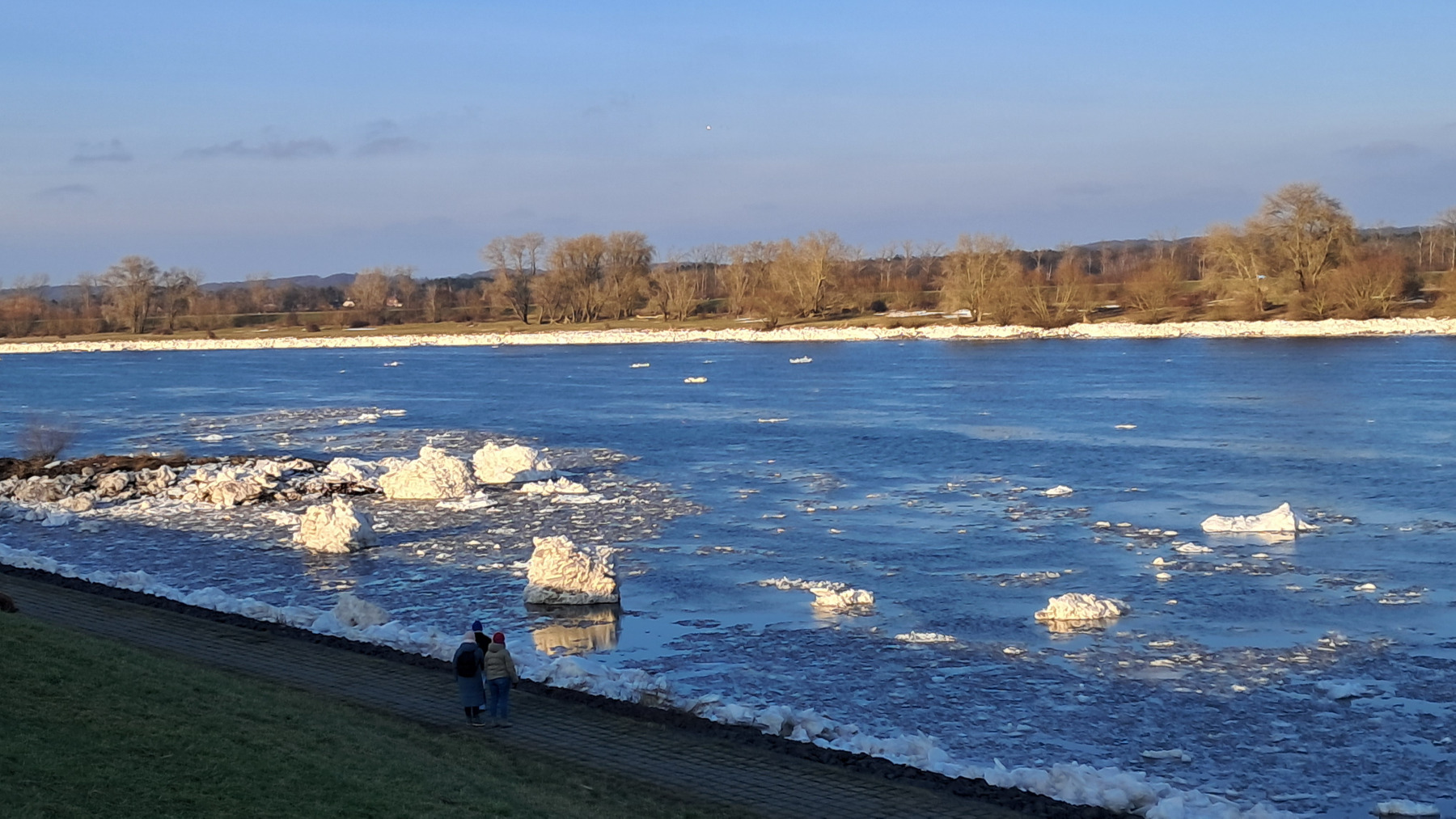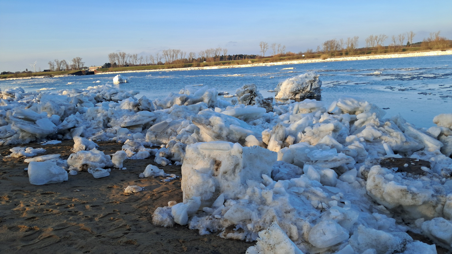 Ein Stück weiter flußabwärts am Stover Strand können wir am Wasser einige der “Eisberge” erreichen