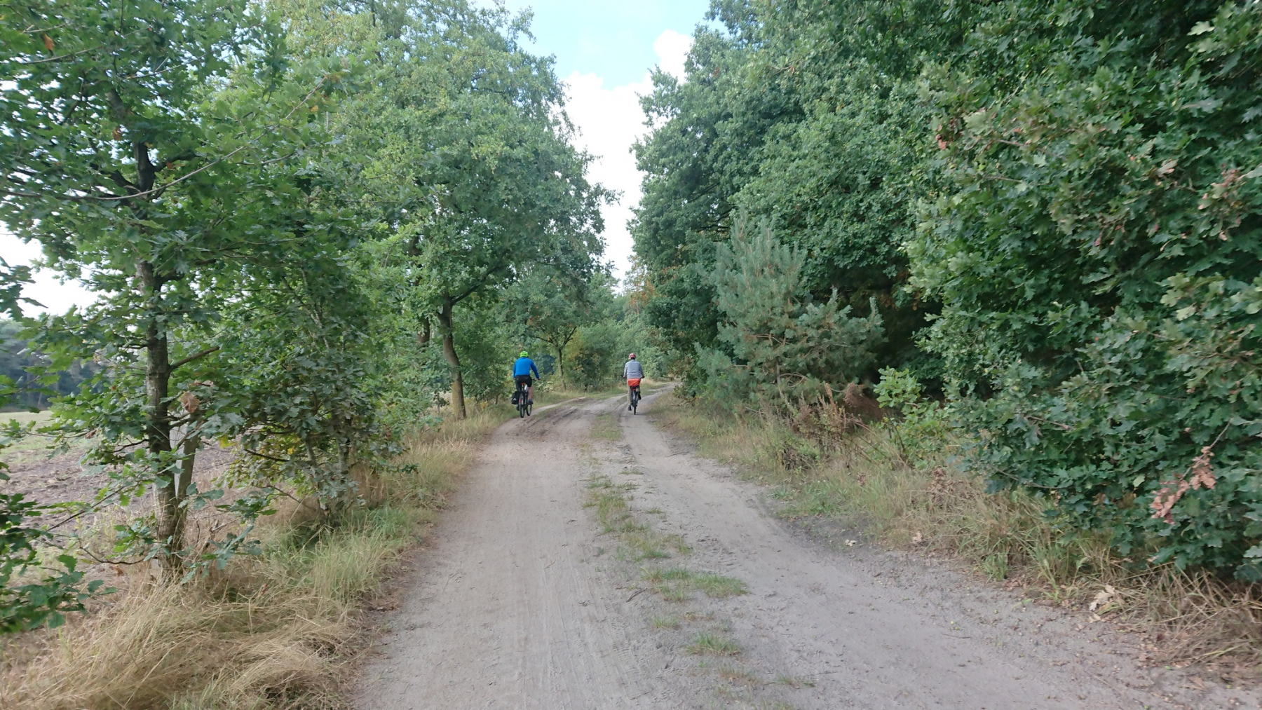 Die nächsten rund 10 km fahren wir auf kleinen Straßen mit nur wenig bis gar keinem Verkehr weit ab der Hunte nach Norden. Der Abschnitt zwischen Sandhatten und Sandkrug sollte man mit beladenen Rädern lieber anderweitig umfahren. Mit unseren bepackten Liegerädern ist die Strecke duch das Naturschutzgebiet Barneführerholz kaum zu bewältigen, die Wege sind unbefestigt. Auch die vor uns fahrenden Personen ausgestattet mit Pedelek und schmalen Reifen haben ihre Mühe auf dem Untergrund.