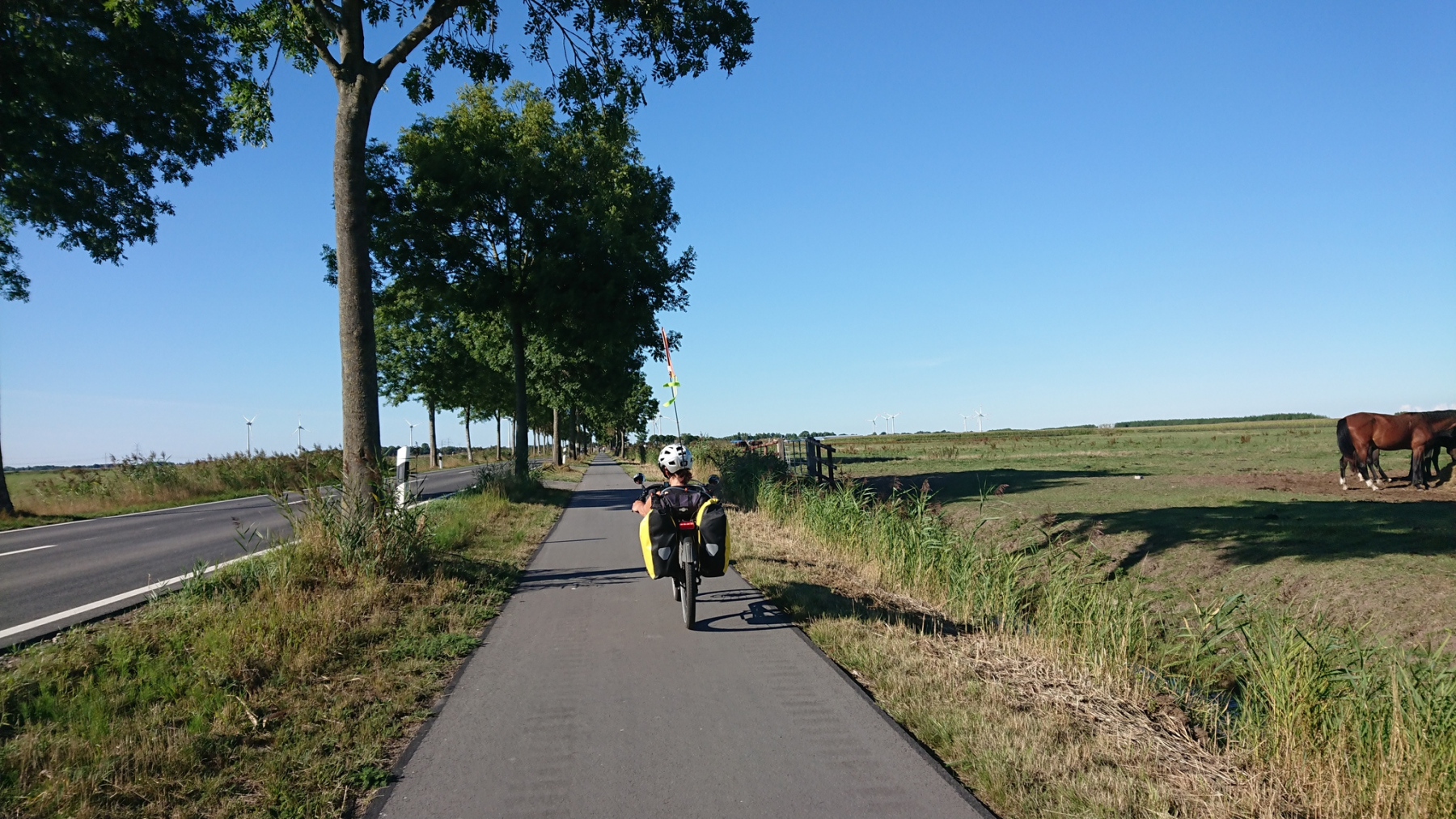 Von Wildeshausen bis nach Dötlingen wird der Hunteradweg entlang der Hunte auf einem sandigen festen Weg geführt. Keine Autos, nur hin und wieder ein Fußgänger mit oder auch ohne Hund, Jogger und Radfahrer. Es geht zwar nicht so schnell voran wie auf Asphalt, läßt sich aber dennoch gut fahren.
