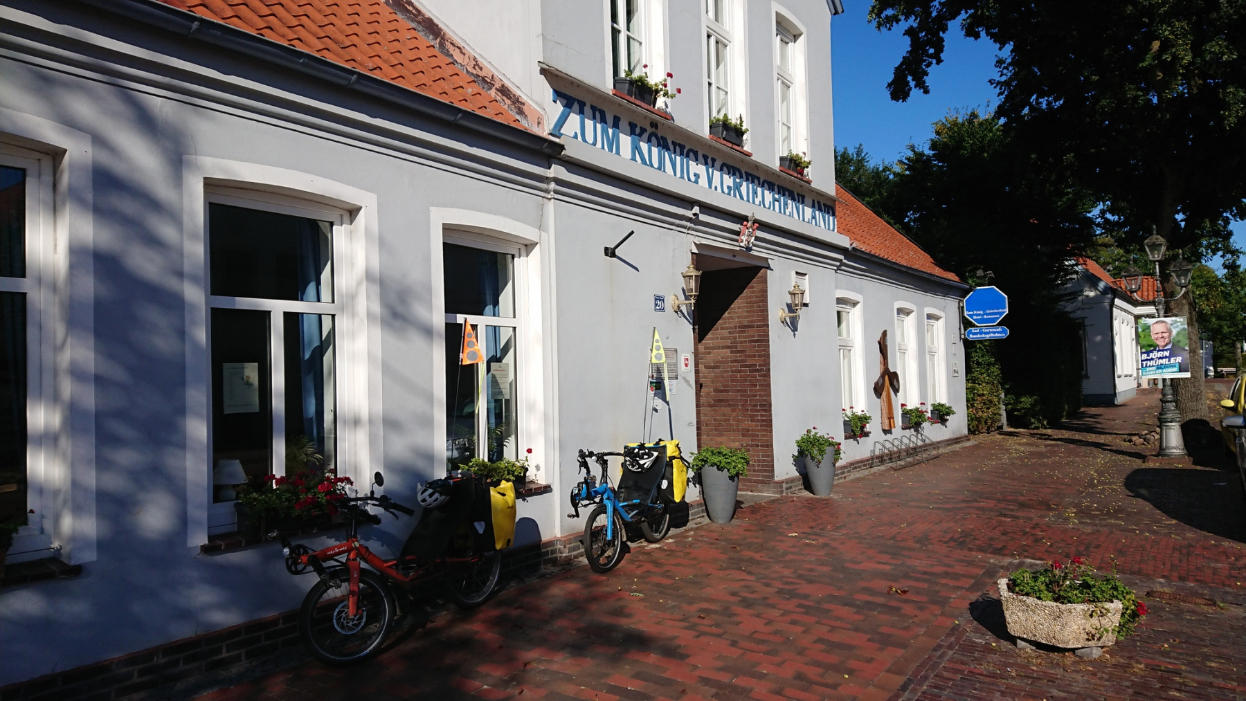 Knapp 100 km haben wir bisher heute zurückgelegt, Bauarbeiten an der Bahnstrecke erfordern eine kleine Umleitung – kein Problem. Ein paar km bleiben wir noch auf dem Weserradweg, biegen dann links ab und fahren nordwärts nach Oevelgönne. Wir nächtigen heute im „König von Griechenland„. Leider ist niemand da, aber nach einem kurzem Telefonat werden wir freundlich eingelassen und können unser Zimmer beziehen. Das Hotel wird von einer Stiftung betrieben, die mit geistig behinderten Menschen arbeitet. Preislich unschlagbar und für den Ort und die behinderten Mitarbeiter eine gute Sache.