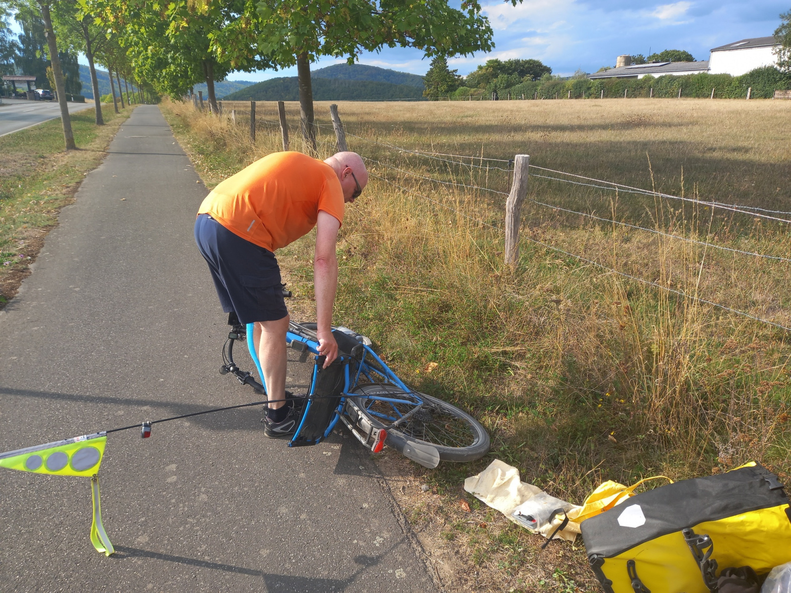 Von Hemfurth geht es mit kräftiger Steigung zwischen 5 und 8 % bergan. Rund 100 Höhenmeter sind so zu überwinden. Und dann passiert es. Als die größte Steigung gerade überwunden ist, geht mir im Vorderrad schlagartig die Luft verloren.