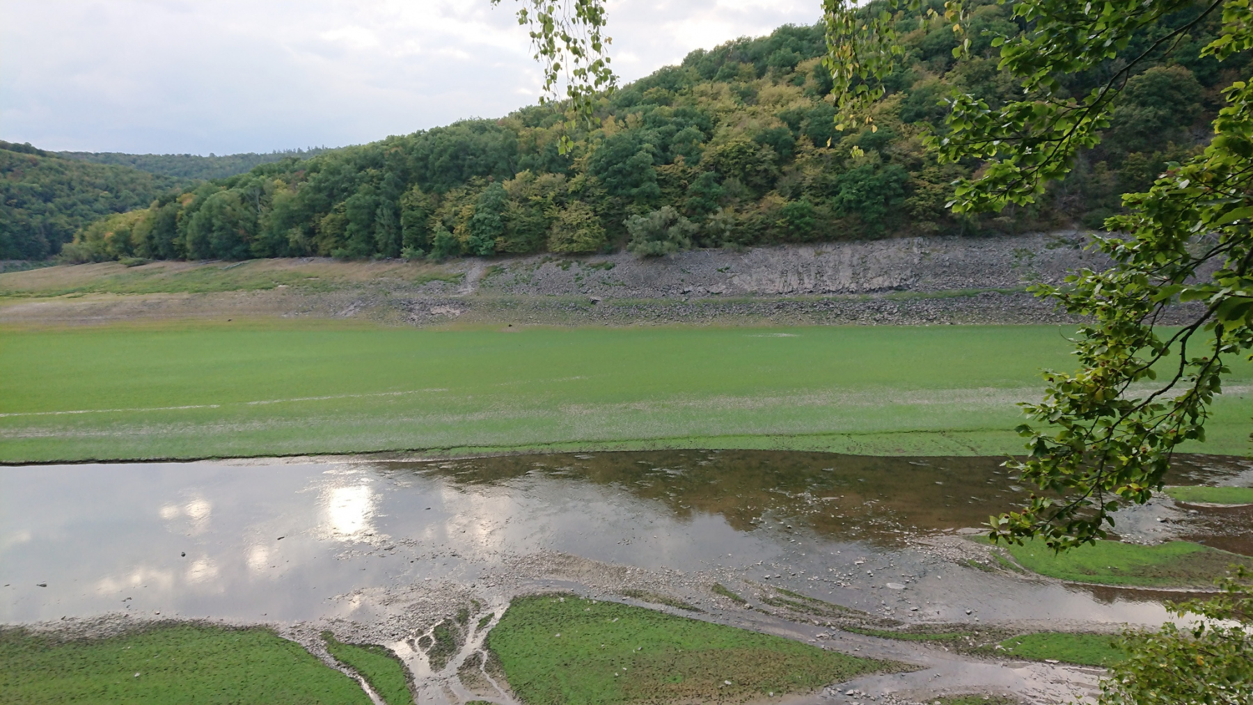 Das wird allerings sich noch ein wenig hinziehen, bis wir das Ziel erreichen. Wir sind nach dem langen Tag und den hohen Temperaturen abgekämpft und die Getränke gehen uns auch noch langsam aus. Der Edersee liegt eingebettet in den Nationlapark Kellerwald-Edersee. Die Wege sind alle nur geschottert und so brauchen wir für die 20 km rund eineinhalb Stunden. Je weiter wir nach Westen kommen, desto weniger Wasser ist im Edersee