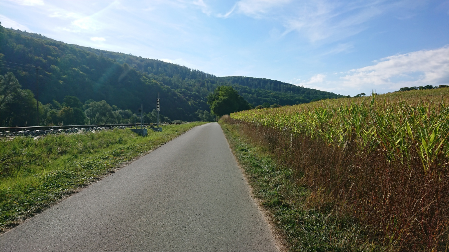 Bei Schmittlotheim verläuft der Eder-Radweg parallel zum Bahngleis, aber nach einigen hundert Metern ist Schluss mit Asphalt – wieder Schotter. Nein Danke sagen wir uns und drehen um und fahren weiter nach Schmittlotheim und nehmen die kleinen Wege neben der B252. Irgendwann ist auch damit Schluss und uns bleibt nur, auf die B252 mit viel Verkehr zu wechseln. Das macht aber nichts, denn die Bundesstraße hat bis Frankenberg auf beiden Seiten je einen Mehrzweckstreifen.