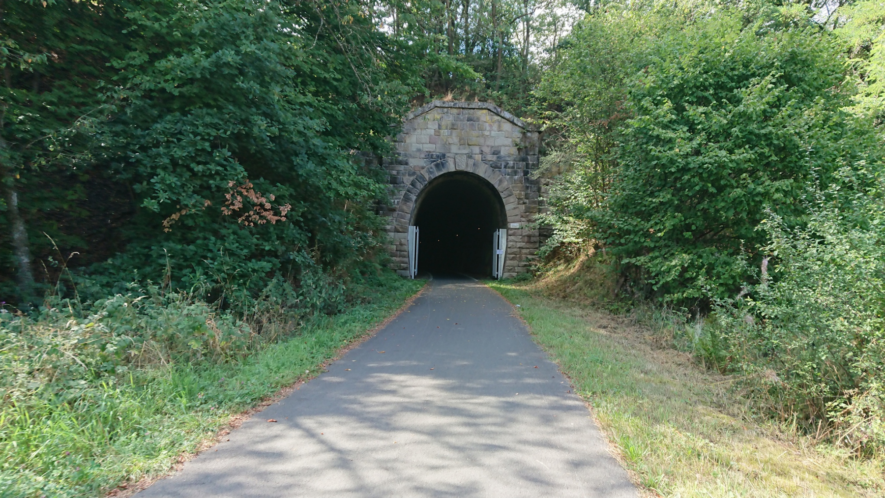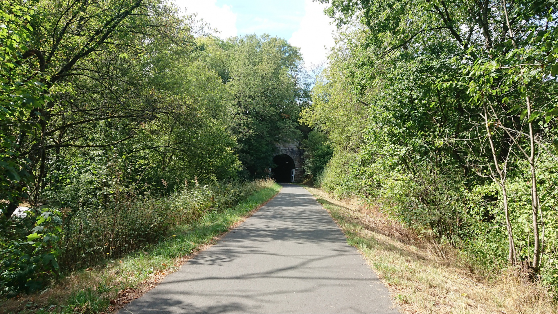 Die Bahnlinie, die auch im Edertal verläuft, wird nur noch bis Frankenberg betrieben. Hin und wieder kommen wir schon mal auf den alten Streckenverlauf und zwischen Battenberg und Dodenau beginnt ein herrliche Abschnitt. Der alte Bahndamm ist als Radweg hergerichtet und in einem sehr gutem Zustand. Rund 12 km ist der Radweg derart ausgebaut und nutzt auch den alten Bahntunnel bei Dodenau.
