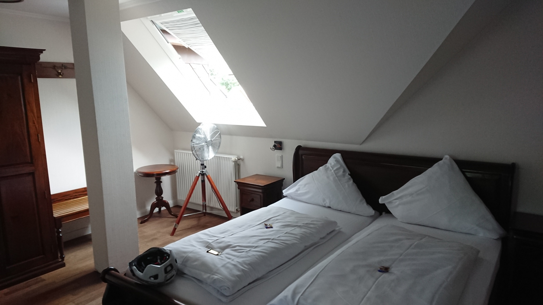 Wir haben ein Zimmer im ersten Stock, direkt über dem Eingang, das Bad geht nach hinten raus, das Badfenster direkt neben der Abluft der Küche. Öffnen ? nein besser nicht, sonst sind alle Küchengerüche im Zimmer. Dass heute Freitag ist, merken wir an den 3-4 Feiern, die im Gasthaus stattfinden. Ein ständiges kommen und gehen und eine Eingangstür, die permanent zuknallt und Gäste die sich lautstark und angeheitert auf dem Vorplatz unterhalten, ob und wie sie denn nun das Taxi nach Hause nutzen wollen. (Die letzten Gäste verlassen uns gegen 3:00 Uhr).