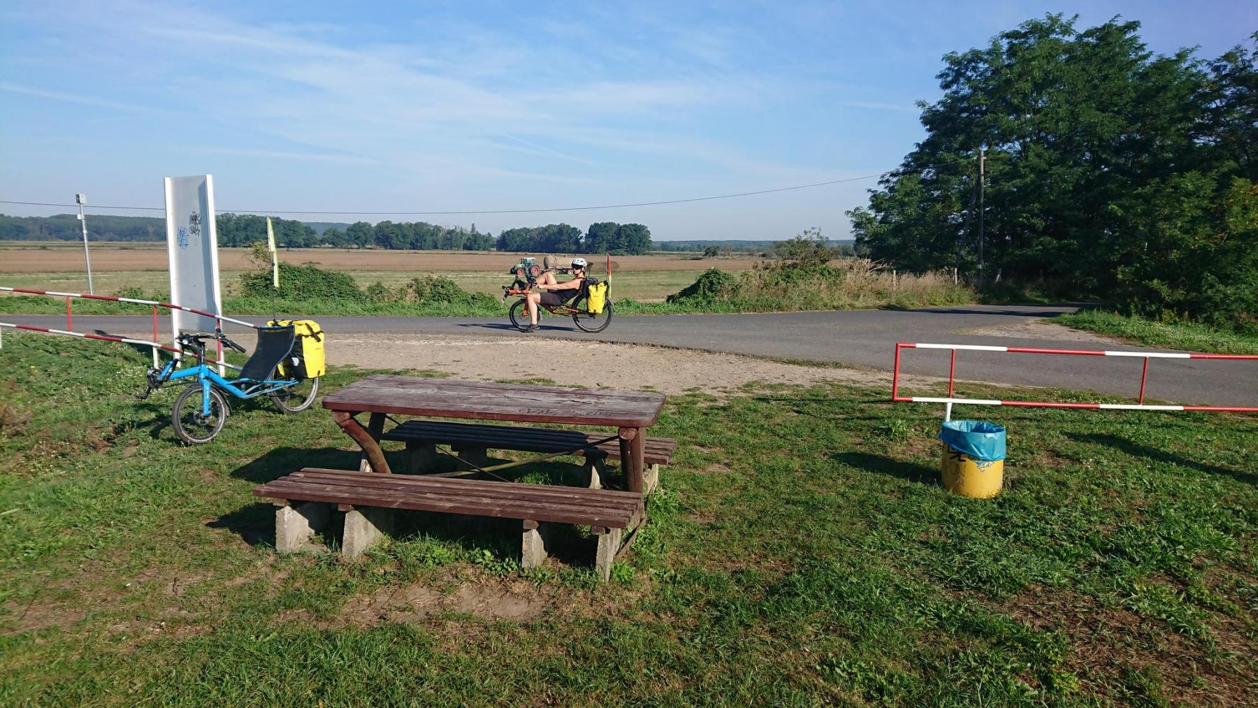 Wir verzehren zum Frühstück das gestern eingekaufte Müsli und Obst und Joghurt, waschen noch kurz ab, damit alles so ist, wie wir es vorgefunden haben, holen die Räder und bepacken sie und starten gegen kurz nach 9:00 Uhr. Schon morgens sind es heute 22°C, und wir haben uns wieder gut mit Sonnencreme eingeschmiert.