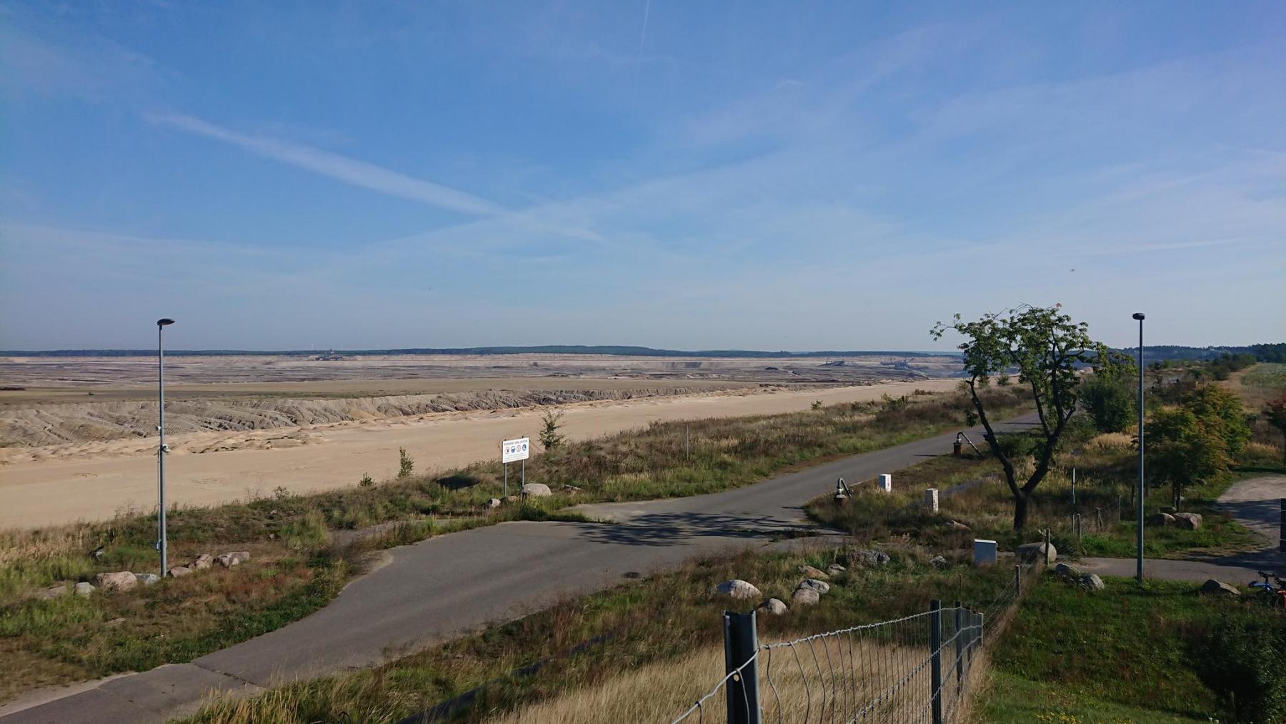 Unser erster Zwischenstopp soll der ehemalige Tagebau Jänschwalde sein. Nach nur 8 km verlassen wir für kurze Zeit das Tal der Neiße. Steil geht es hinauf zum ehemaligen Tagebau.