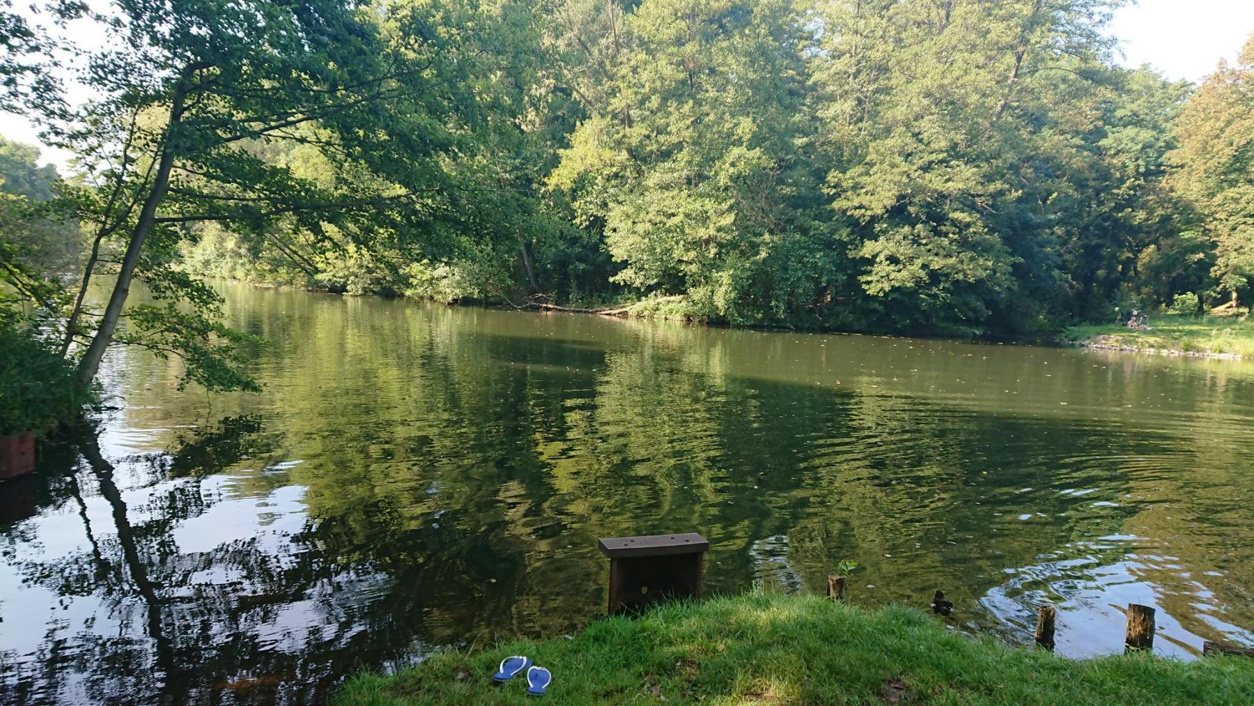 Einen Abstecher nach Cottbus machen wir nicht, aber im Süden von Cottbus komme wir wieder auf den Spreeradweg und die Tour Brandenburg. Unsere Pause nach rund 40km machen wir in der Nähe von Branitz direkt am Stauwehr der Spree. Kinder baden und springen vom Steg, Erwachsene gehen in der Spree schwimmen. Wir machen einfach nur Pause, denn hier am Wasser und im Schatten der großen Bäume ist es nicht so heiß – das Thermometer zeigt nun schon 27°C.