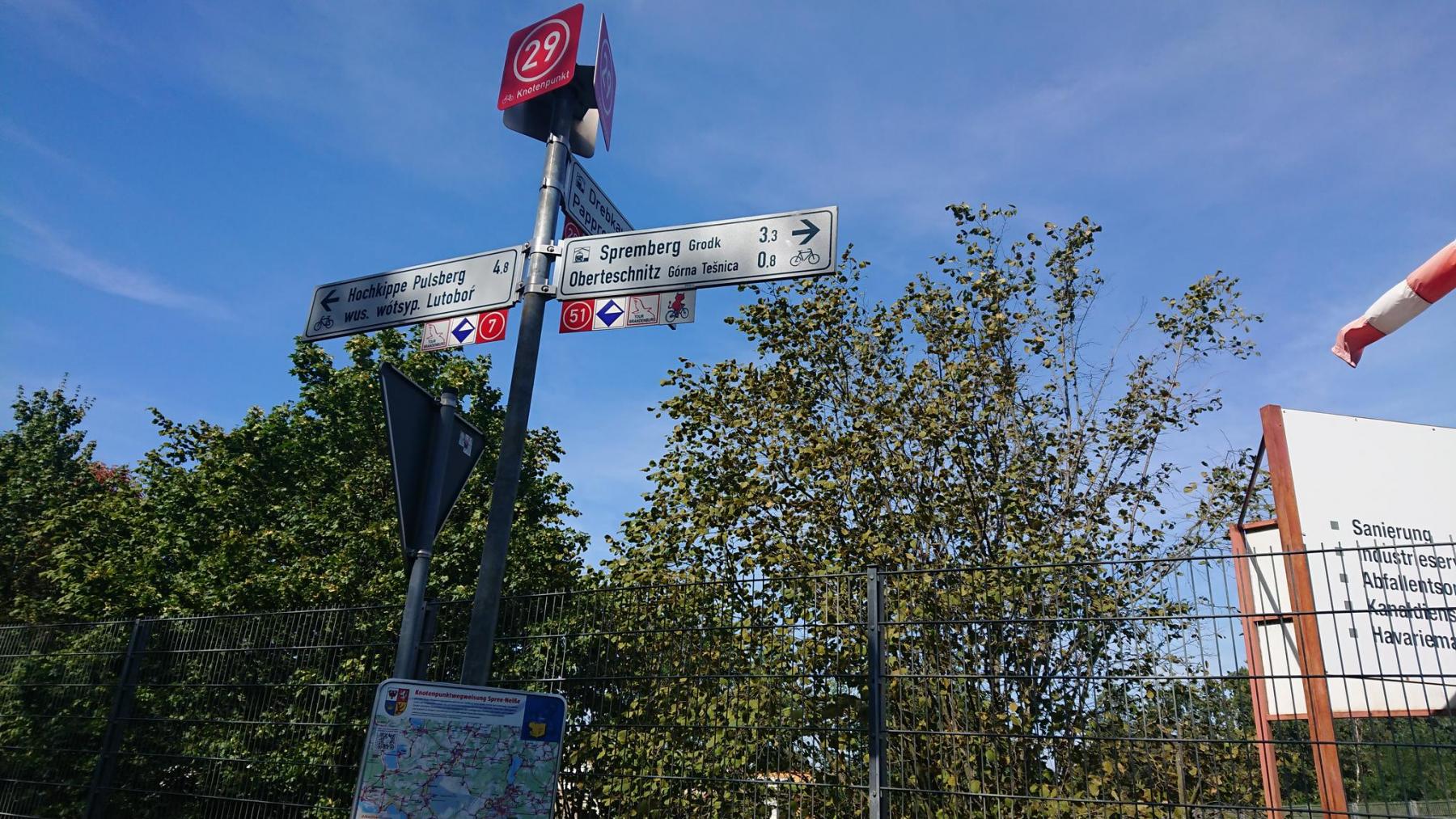 Noch ein kurzes Stück begleiten wir die Neiße bevor wir kurz vor Forst in der Lausitznach Westen in Richtung Cottbus abbiegen. Es geht wieder viel durch Wälder und kleine Orte. Alle Straßenschilder und Orte sind hier zweispraching beschildert. Die Sorben sind eine nationale Minderheit in Deutschland.