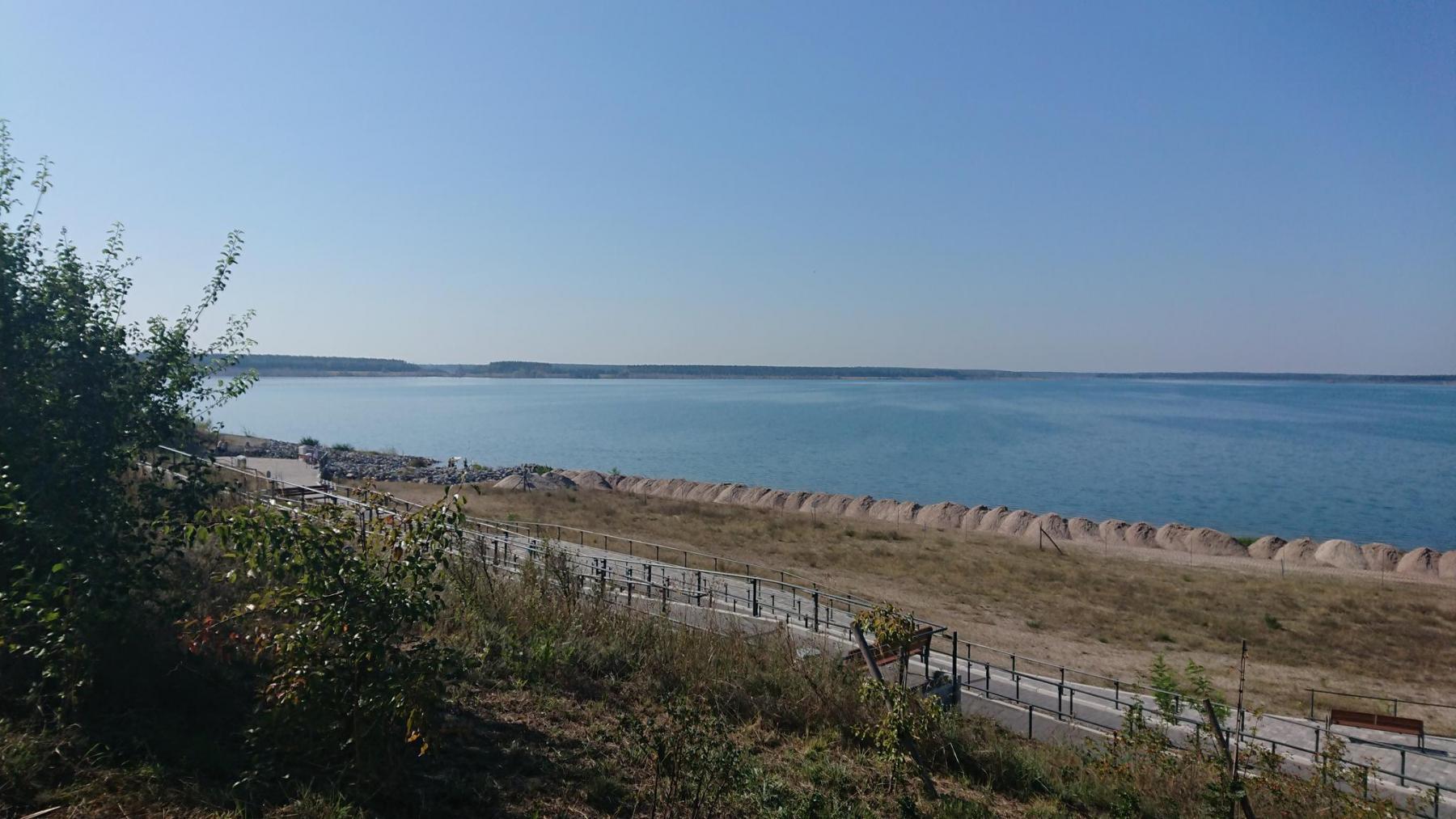 Nach einem guten Frühstück in der Pension starten wir gegen kurz vor 10 Uhr Richtung Nord-Osten. Ziel: das Südufer des Großräschener Sees. Dort begegnen wir anderen Radfahrern und auch Einheimische und es entwickelt sich ein interessantes Gespräch über früher – als noch Tagebau war und wie drecking es war und heute und auch die Probleme und Folgen der Flutung der Tagebaue. Und der See ist echt riesig. Na ja, wenn man bedenkt, wie viel Kohle dort herausgenommen wurden.