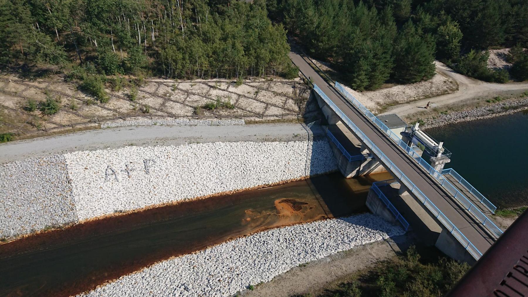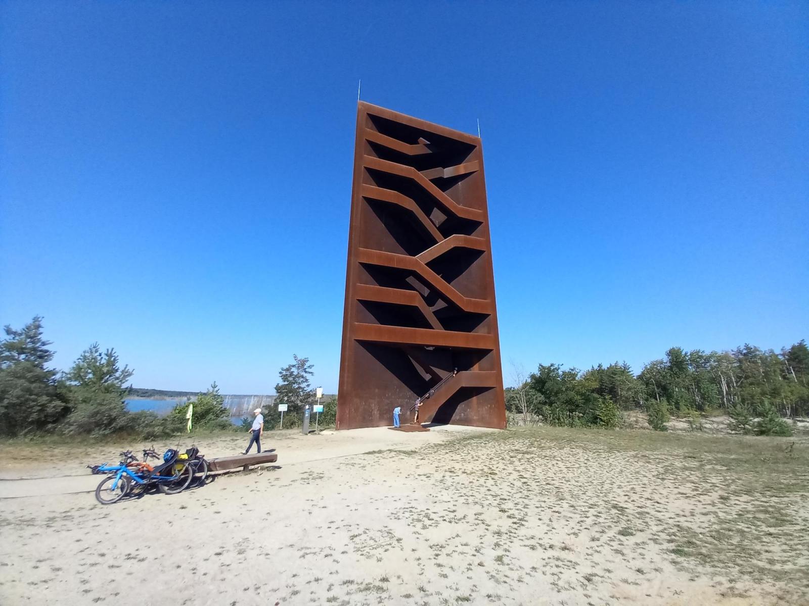 Unser nächster Halt: die Landmarke im lausitzer Seenland : „Rostiger Nagel“ am Sedlitzer See und dem Sornoer Kanal, der den Sedlitzer mit Geierswalder See verbindet.