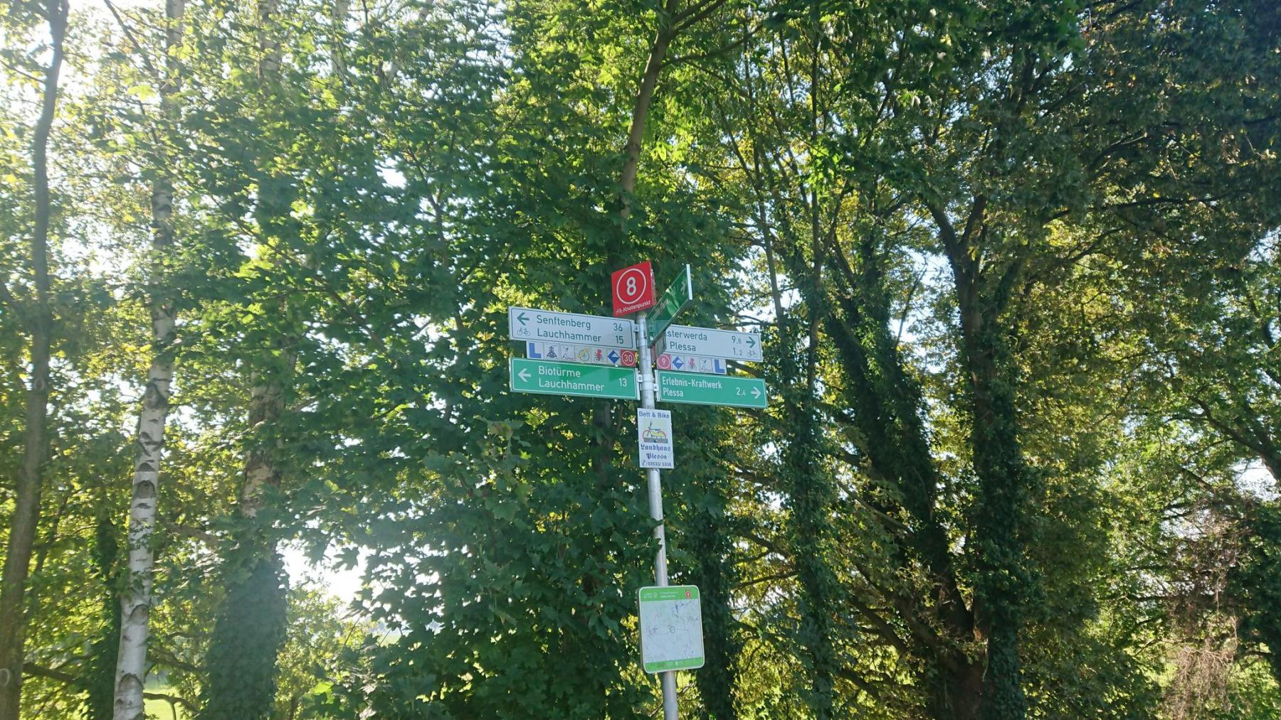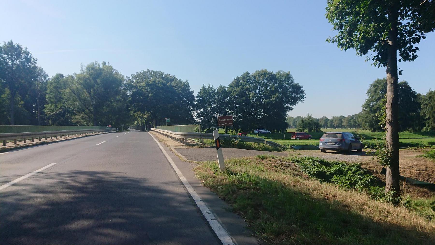 Vom Lausitz-Ring geht es parallel zu Autobahn direkt am Gelände von BASF Schwarzheide vorbei, bis wir bei Lauchhammer direkt an der Elster entlangfahren können. Die Elster ist mehr ein Kanal – auf langen Abschnitten gerade und auf beiden Seiten eingedeicht. Nur selten kann man das Wasser sehen. Meist verhindert das hoher Bewuchs