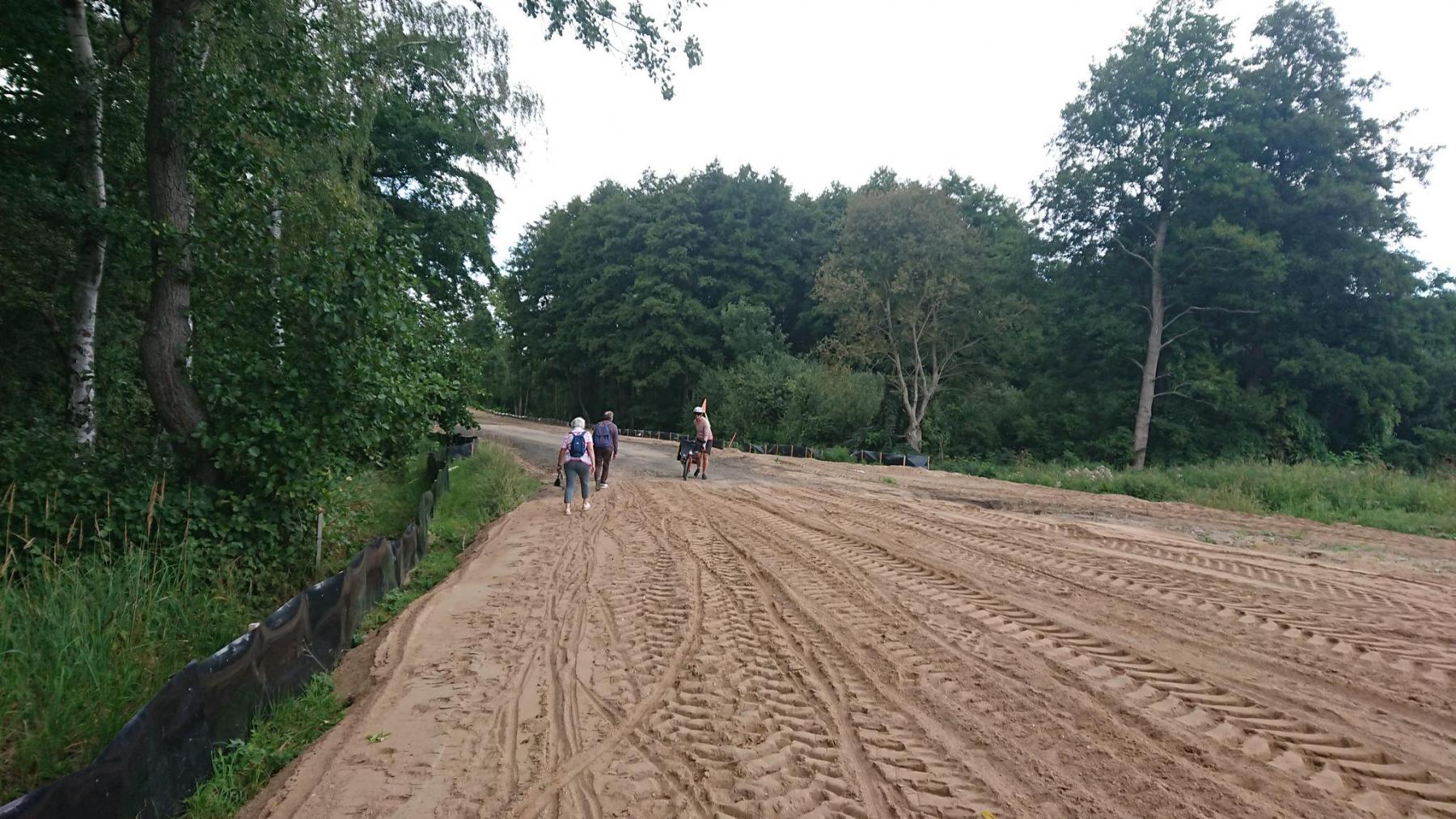 Die Landesstraße L204, der wir weiter folgen wollen ist für den Fahrzeugverkehr wegen einer Baustelle gesperrt. Uns kommen Fußgänger und Radfahrer entgegen und da wirkliche Alternativstrecken fehlen wagen auch wir uns in die Baustelle. Uns erwartet eine Sandpiste. 600 m schieben…