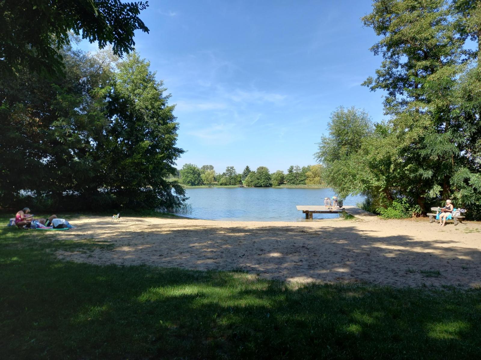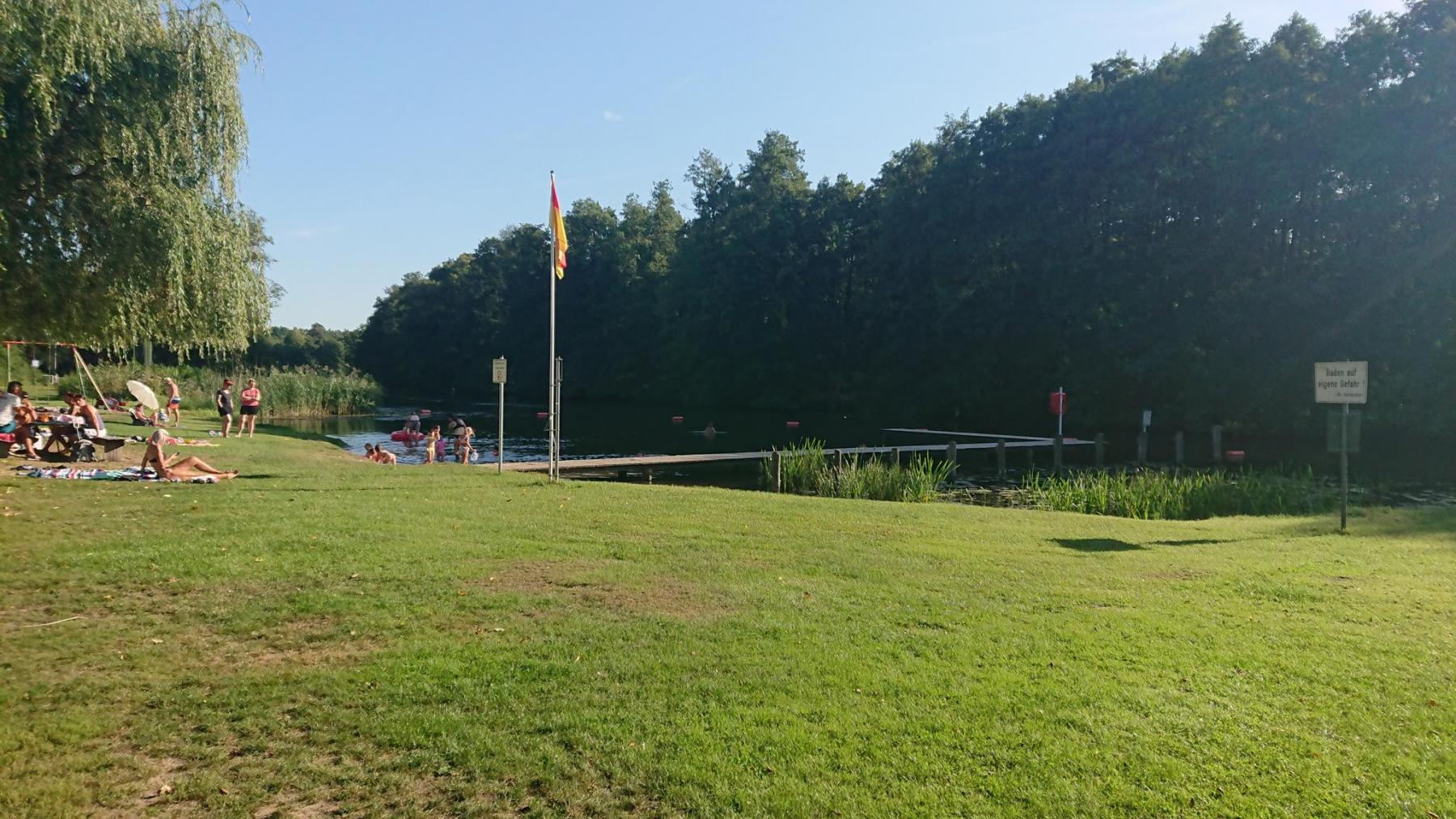 Es ist Mittag geworden und wir suchen nach einer Möglichkeit zu rasten. In Kagel finden wir einen Zugang zum Bauernsee. Eine Badestelle. Aber lange bleiben wir nicht dort, denn das scheint ein Treffpunkt der FKK-Liebhaber zu sein. Sitzen und liegen doch gar nicht bekleidetet ältere Menschen auf der Liegewiese oder dem Badesteg. So viele nackte Tatsachen, da wollen wir lieber nicht stören – und das, obwohl das Wetter zum Baden einlädt.
