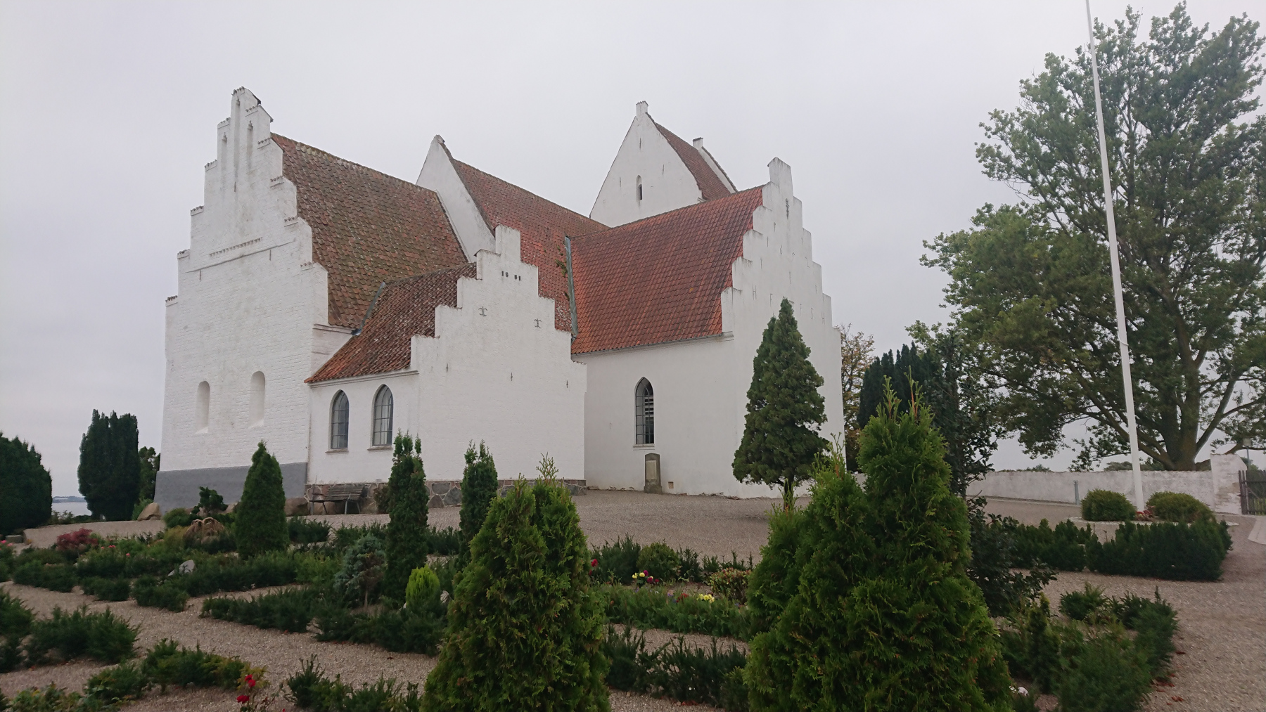 Unser nächstes Ziel und gleichzeitig die erste Pause ist die Kirche in Gammel Kalvehave. Es ist eine typisch dänische Kirche in weiss mit rotem Dach, aber bedeutend größer als die sonstigen Dorfkirchen.