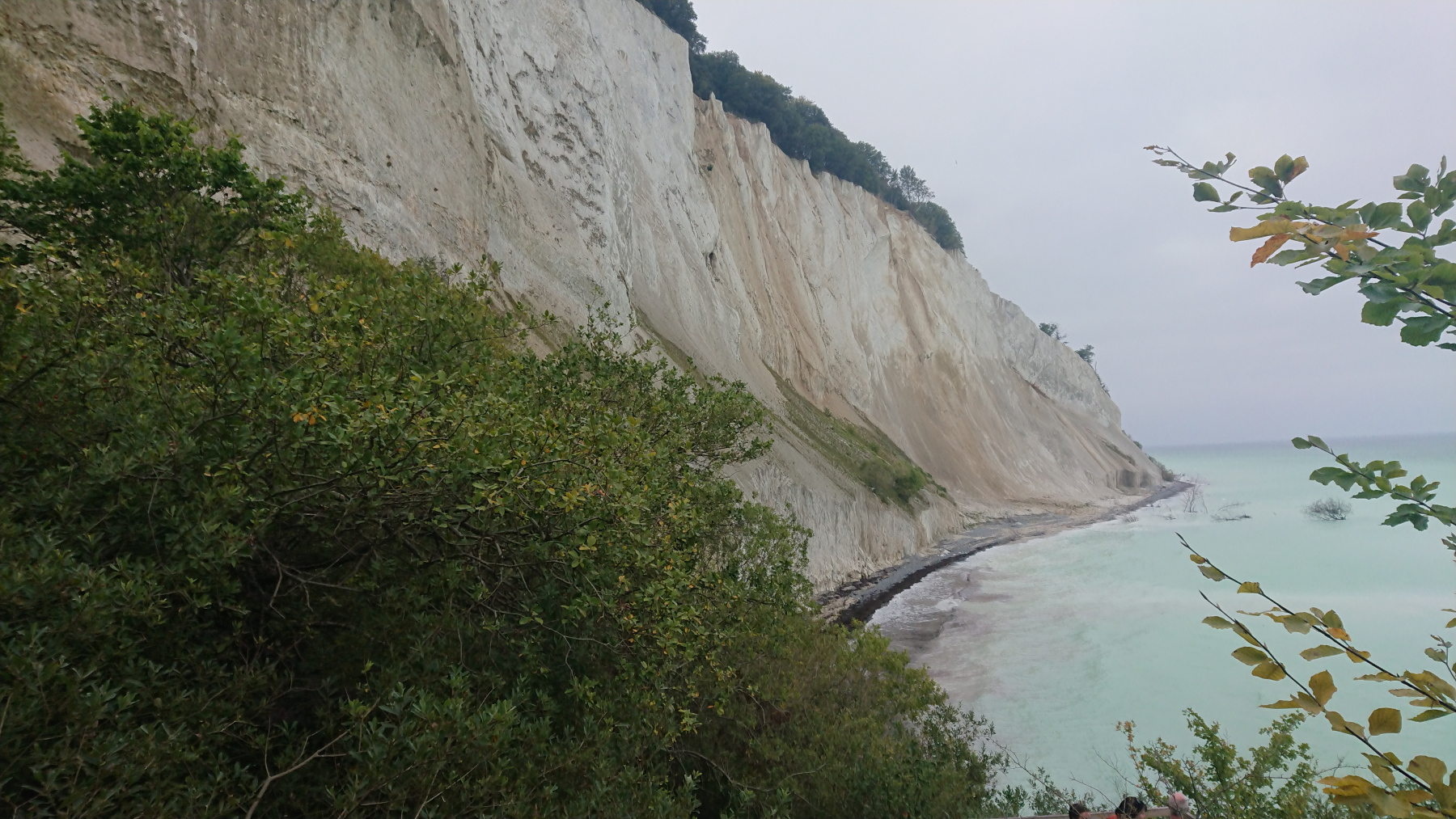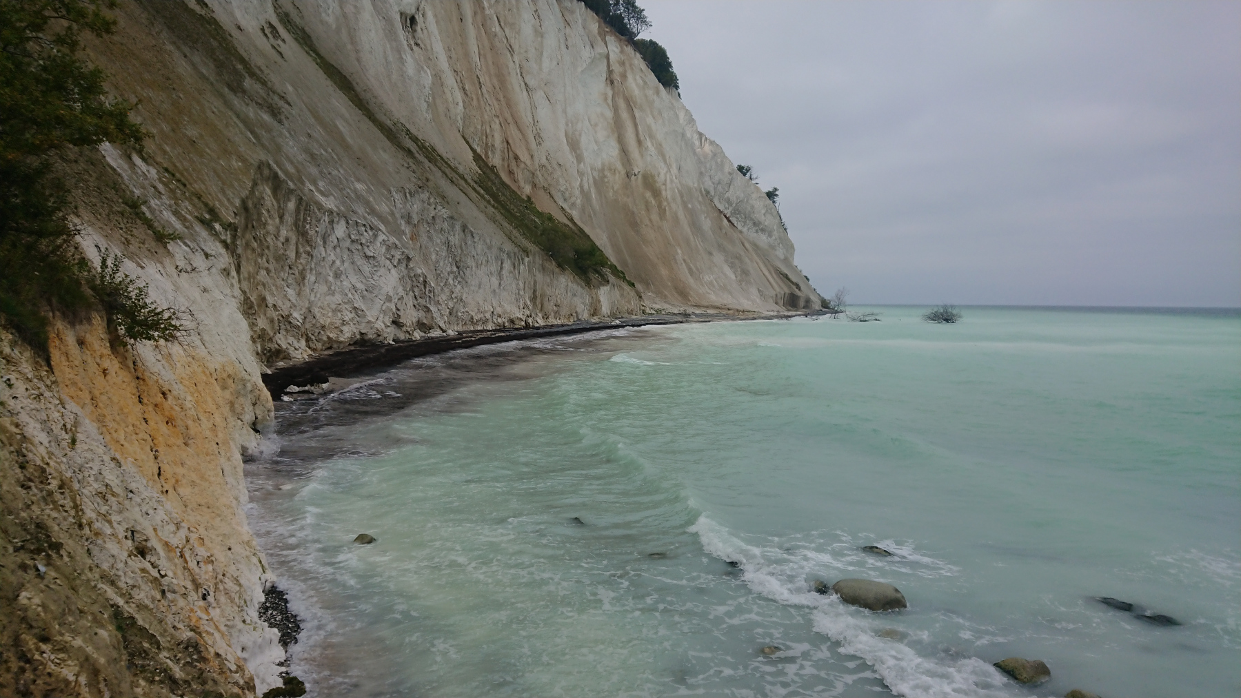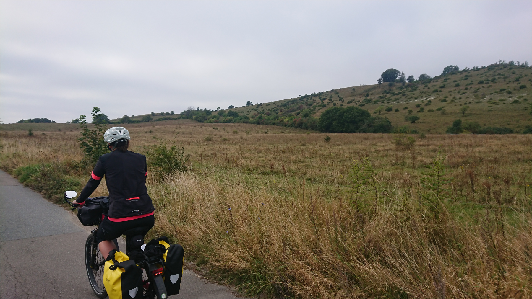 Kurz vor den Klippen verläßt dann der ausgeschilderte Radweg die Straße. Es geht auf einen Wanderweg weiter, der aber aufgrund der vergangenen Regenfälle nicht wirklich fahrbar ist. Bei der ersten Gelegenheit wechseln wir wieder auf die Straße, die hier aber nur noch ein Schutterweg aus feinem Kreidegranulat ist. Es geht auch hier immer wieder rauf und runter – wie gut, dass wir die e-Unterstüzung haben.