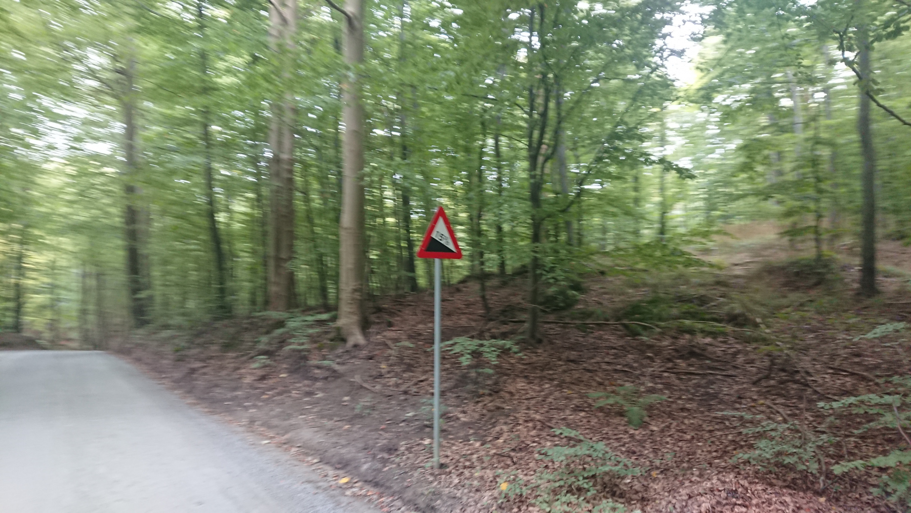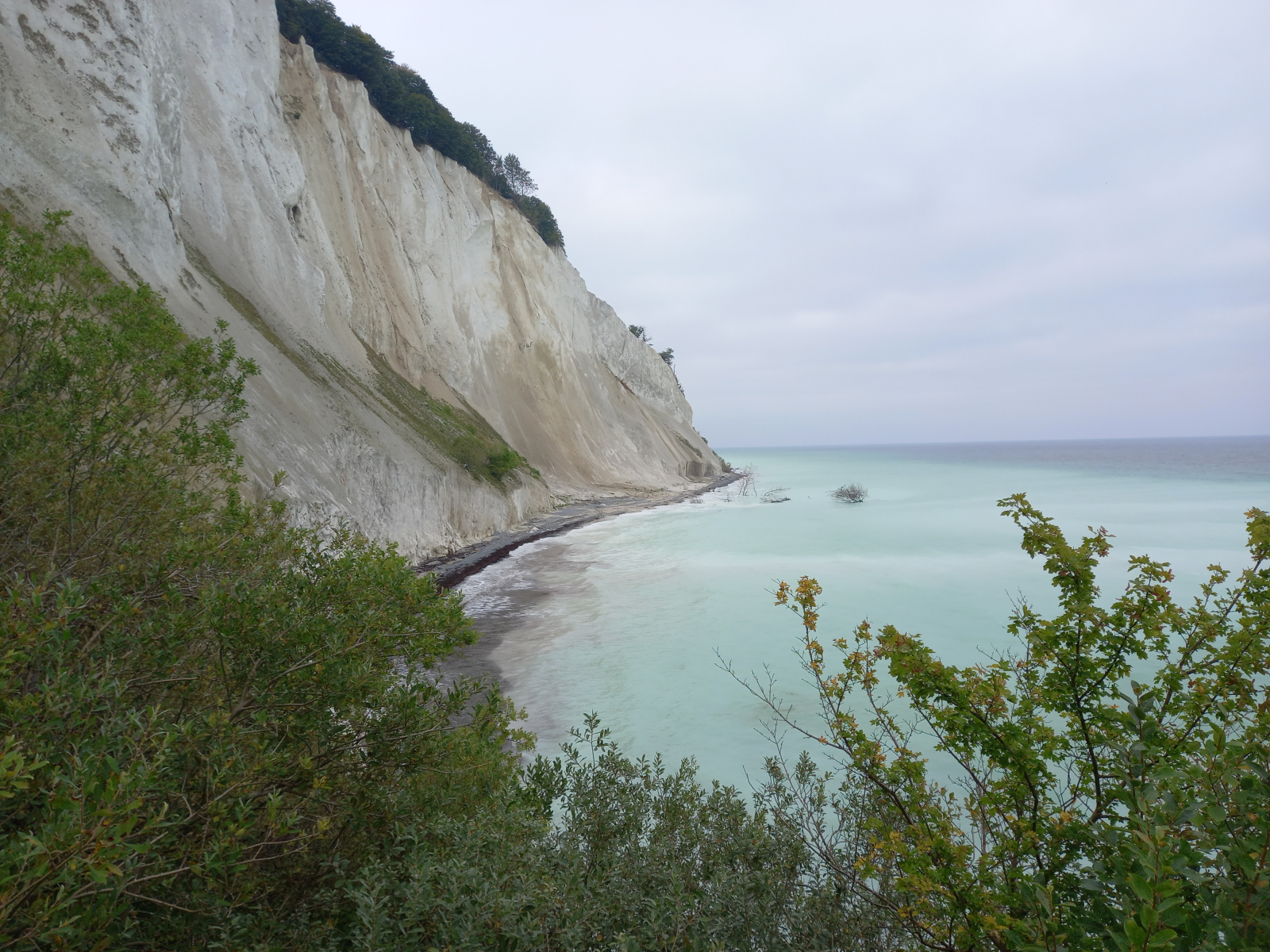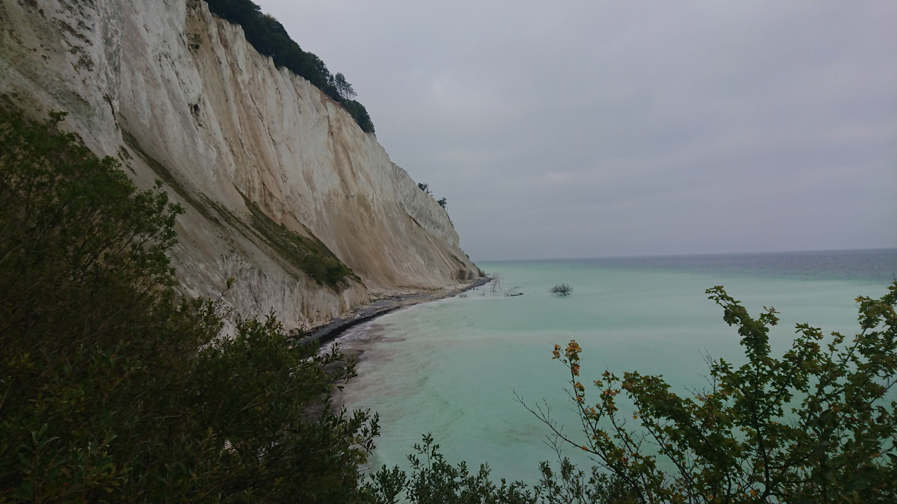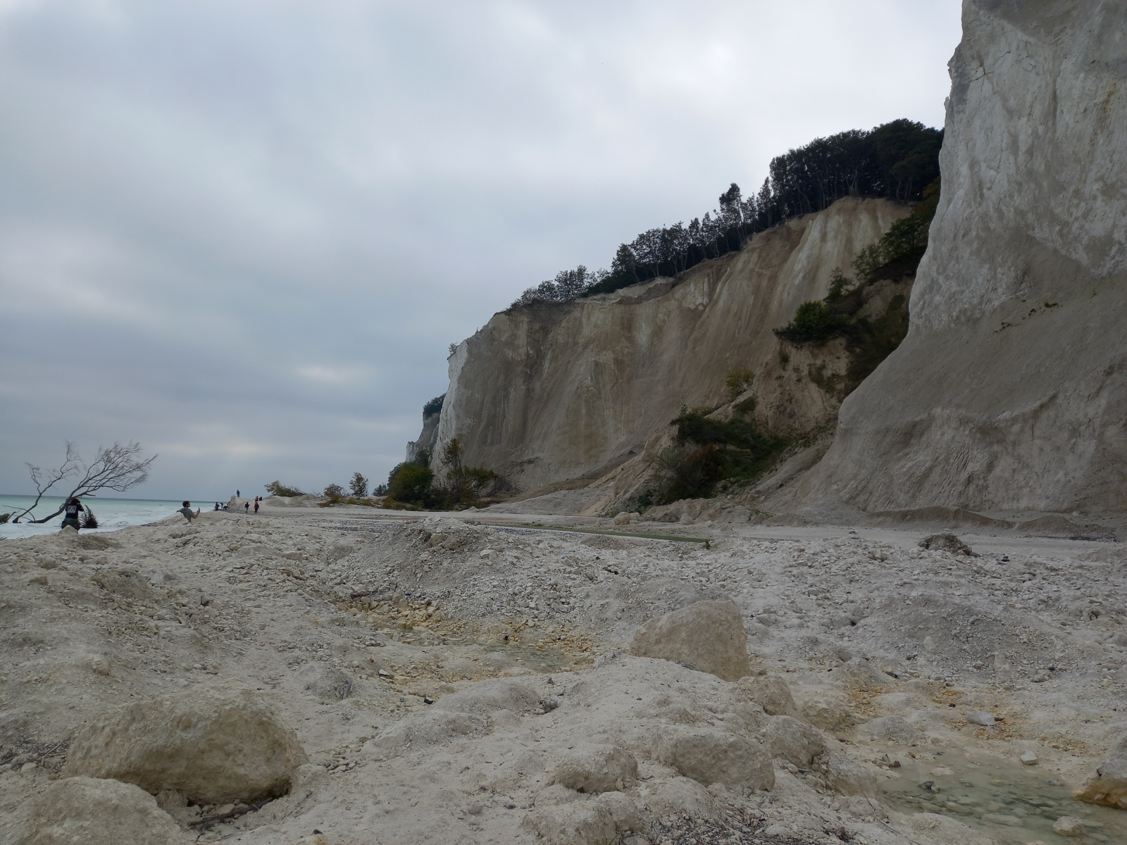 Kurz vor den Klippen verläßt dann der ausgeschilderte Radweg die Straße. Es geht auf einen Wanderweg weiter, der aber aufgrund der vergangenen Regenfälle nicht wirklich fahrbar ist. Bei der ersten Gelegenheit wechseln wir wieder auf die Straße, die hier aber nur noch ein Schutterweg aus feinem Kreidegranulat ist. Es geht auch hier immer wieder rauf und runter – wie gut, dass wir die e-Unterstüzung haben.