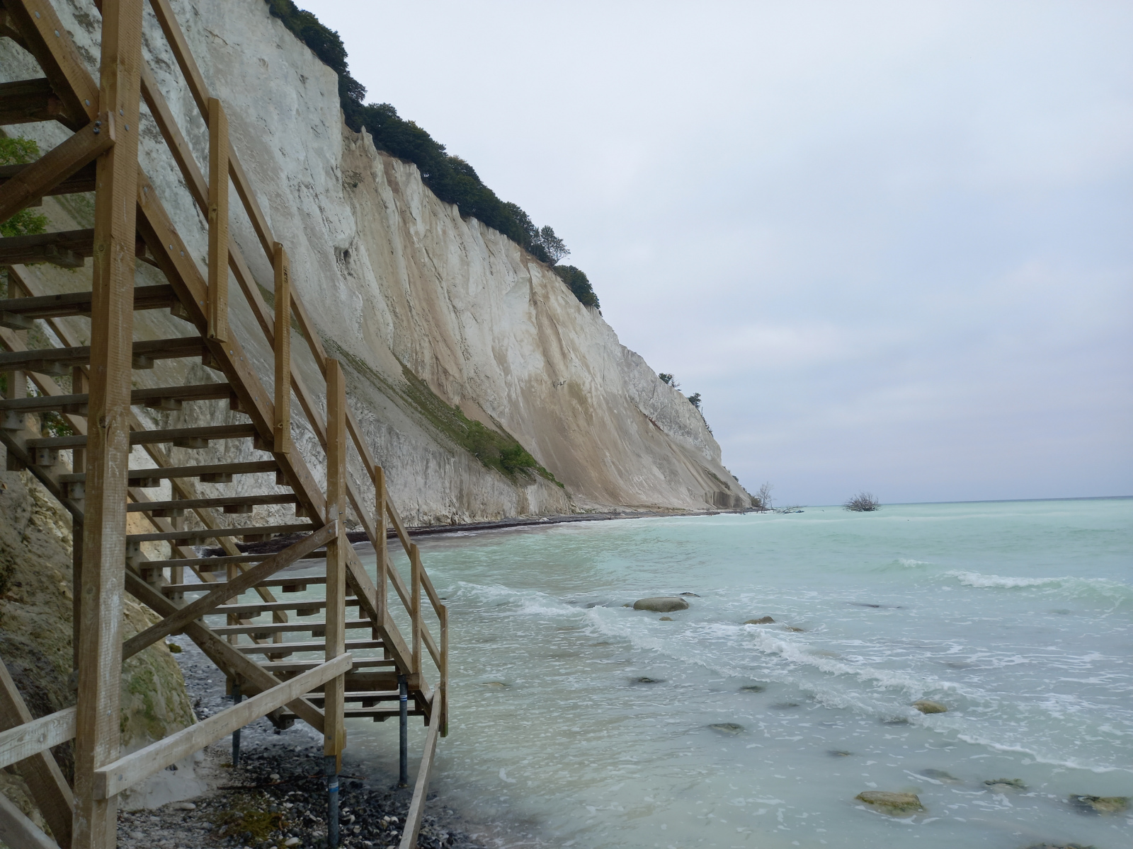 Unten endet die Treppe am Strand, der eigentlich gar nicht mehr da ist. Man muss abwarten, bis die Welle zurückläuft, dann runter an den Strand und schnell an die Klippe gehen, sonst gibt es nasse Füße.