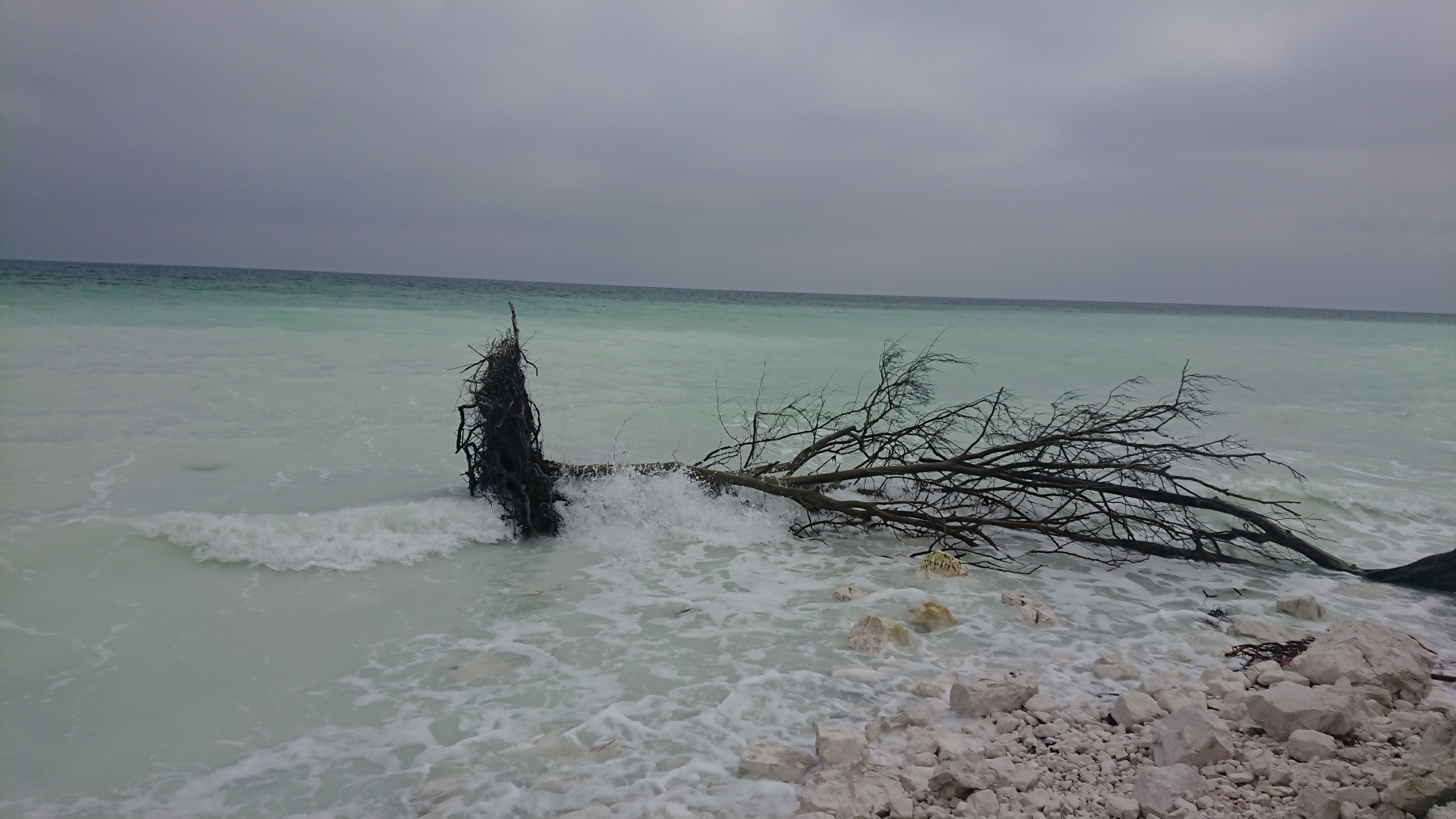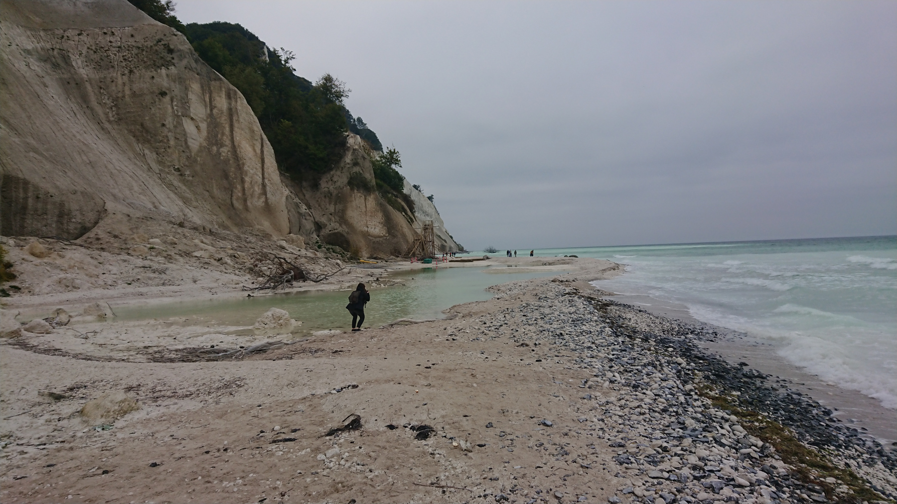Danach müssen wir uns zwischen zwei Wellen durch das Gestell der Treppe zwängen, um an den Strand zu kommen. Überall sind die Folgen der letzen Abbrüche zu sehen. Ganz in der Nähe liegt schon das Baumaterial für eine neue Treppe bereit.