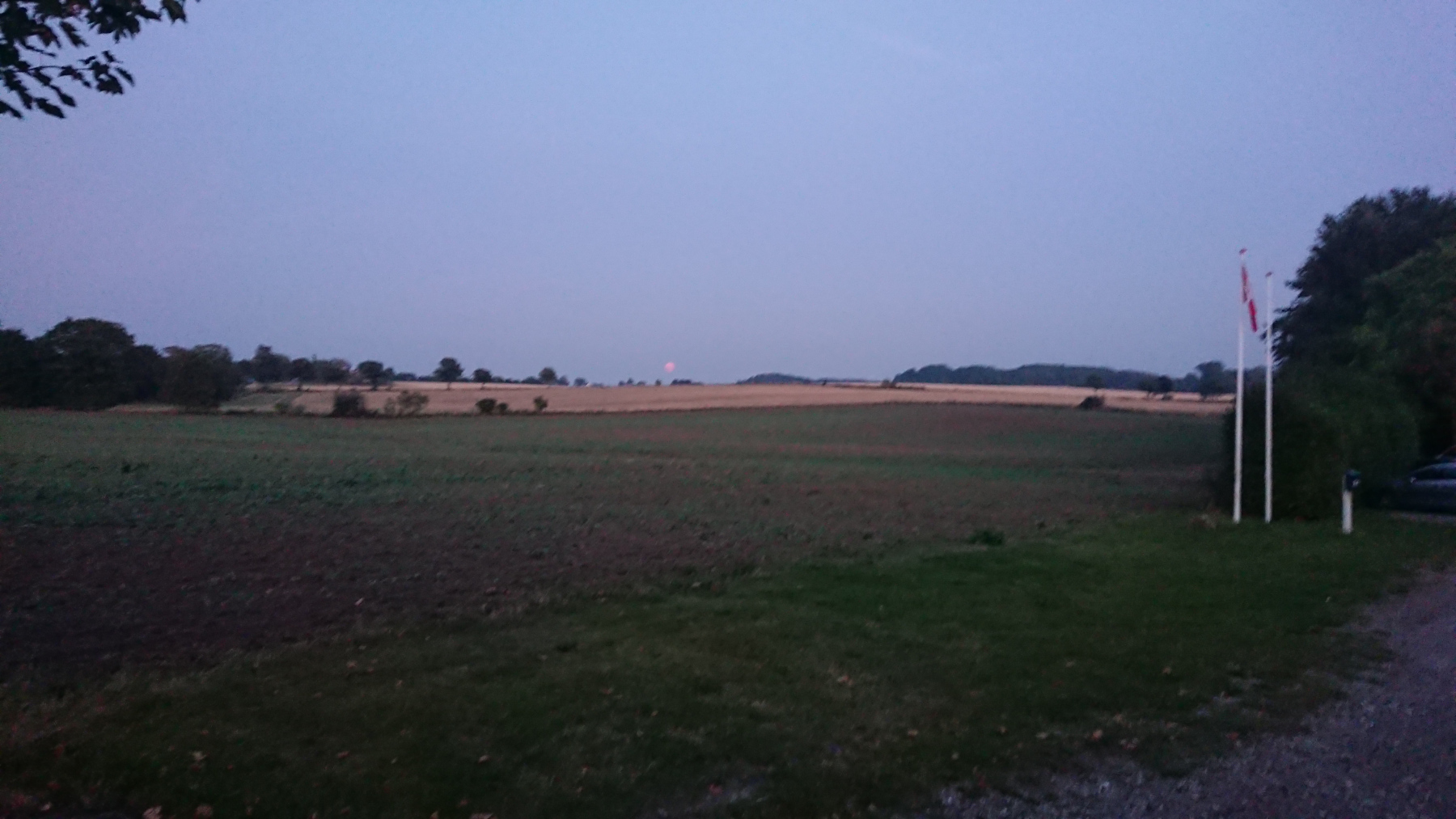 Spät am Abend verziehen sich dann auch endlich die Wolken und grau weicht anderen Farben. Sonnenuntergang und Mondaufgang fallen fast zusammen, wir brauchen uns nur um 180° zu drehen.