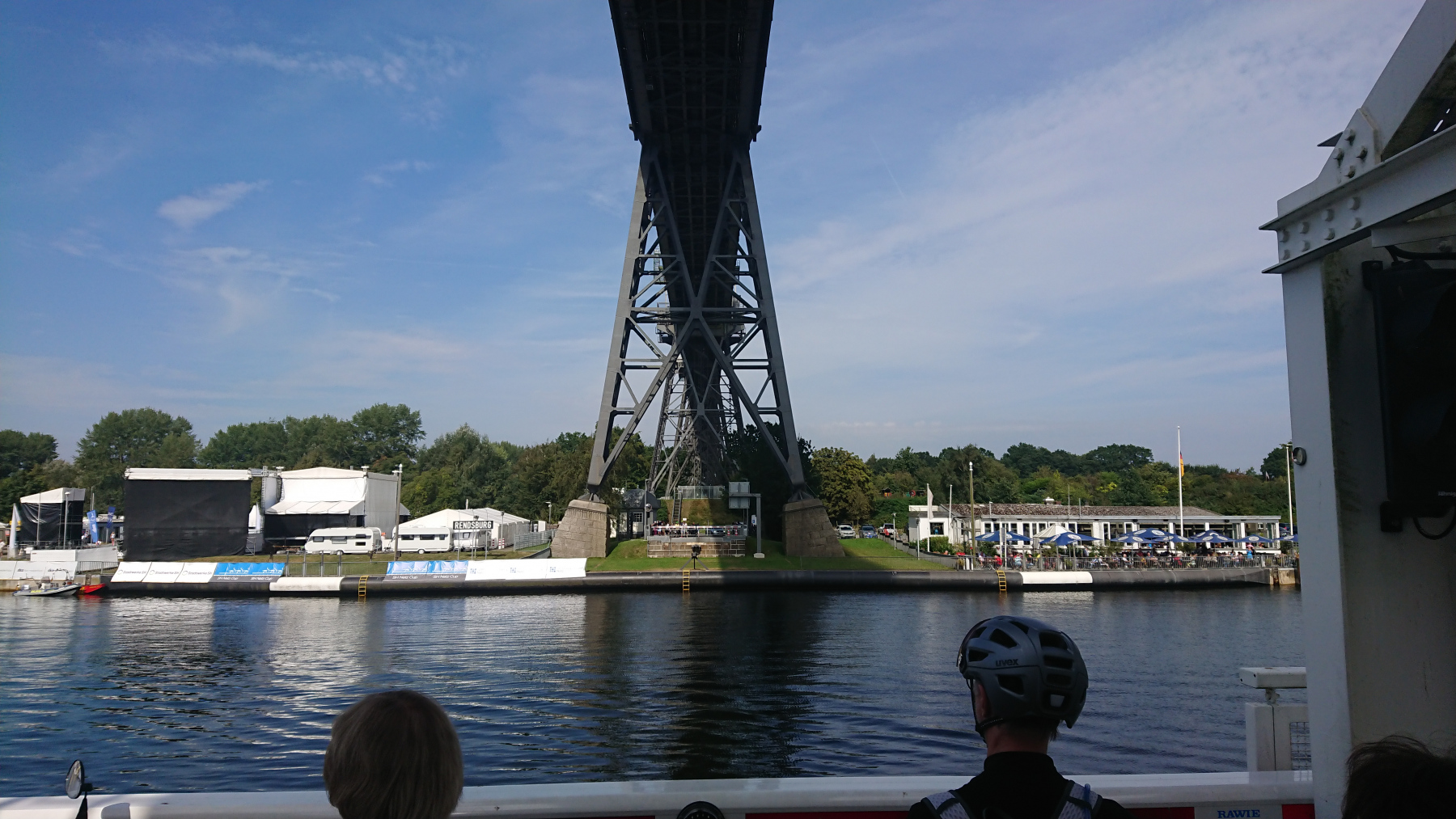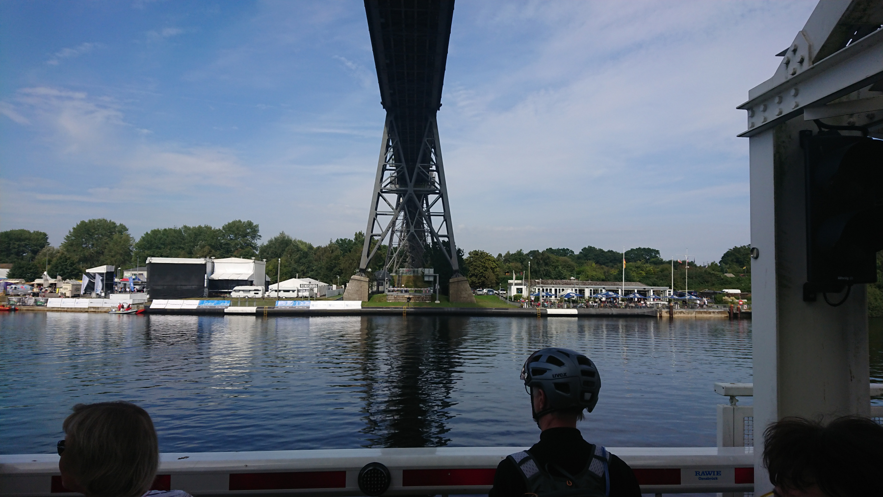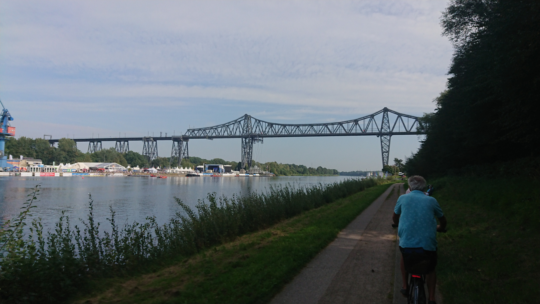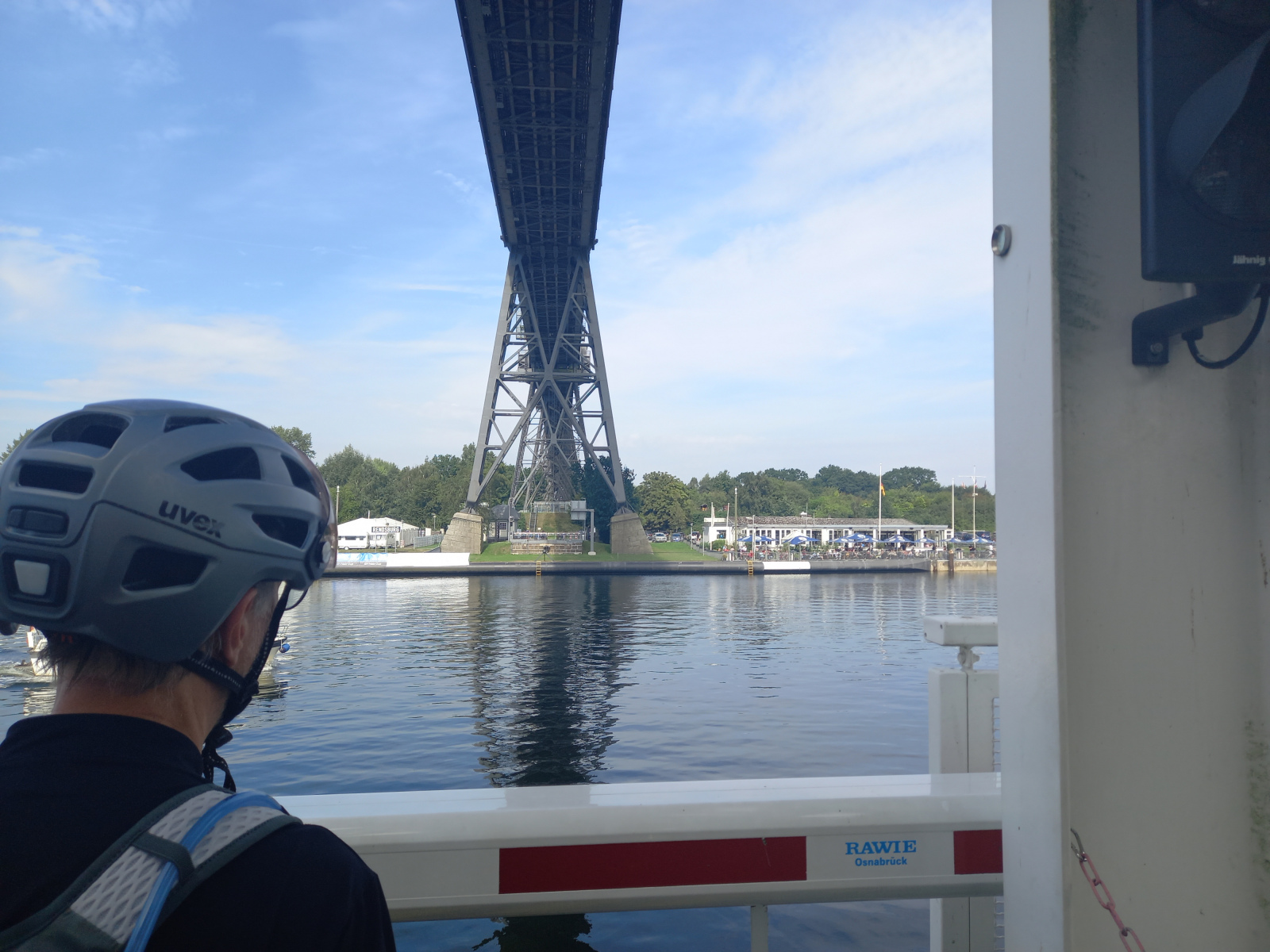 Schon von Weitem können wir die Hochbrücke sehen und bald haben wir sie auch dann erreicht. Die Schwebefähre ist grad auf der Nordseite und so müssen wir ein wenig warten, bis wir auf die andere Kanalseite gebracht werden.