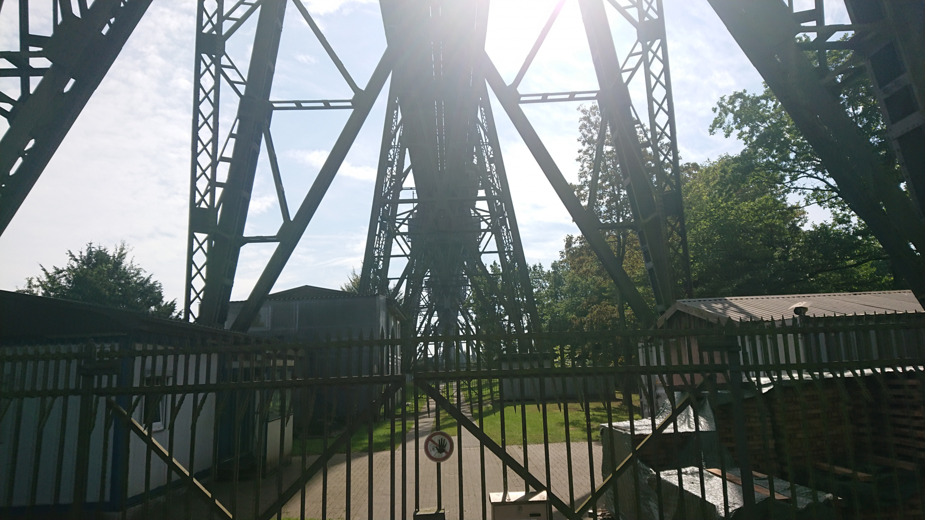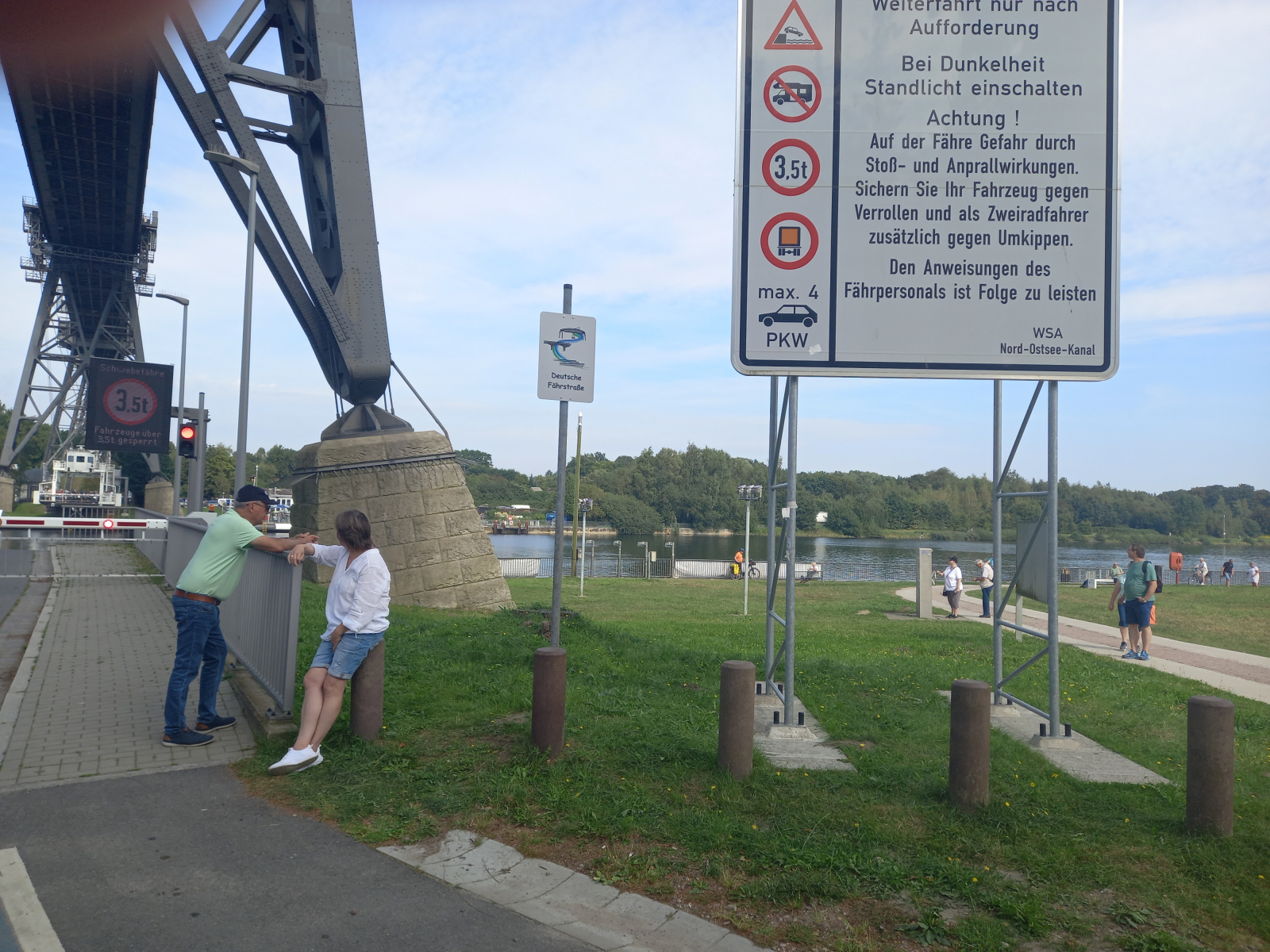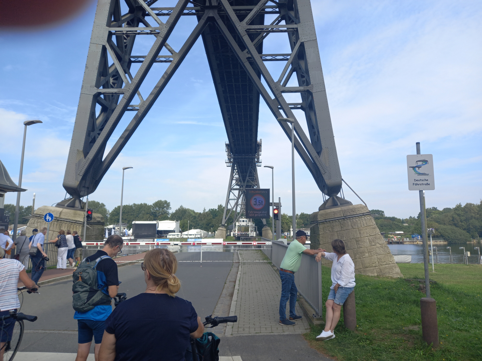 Schon von Weitem können wir die Hochbrücke sehen und bald haben wir sie auch dann erreicht. Die Schwebefähre ist grad auf der Nordseite und so müssen wir ein wenig warten, bis wir auf die andere Kanalseite gebracht werden.