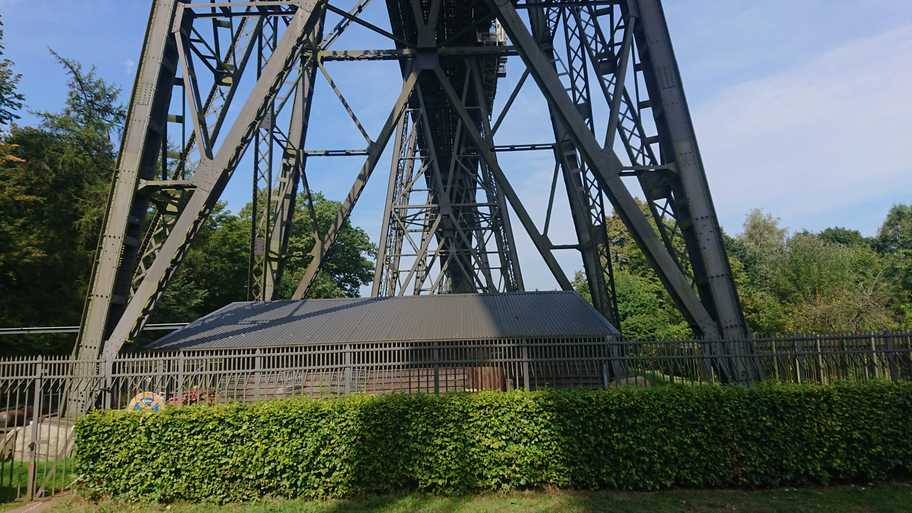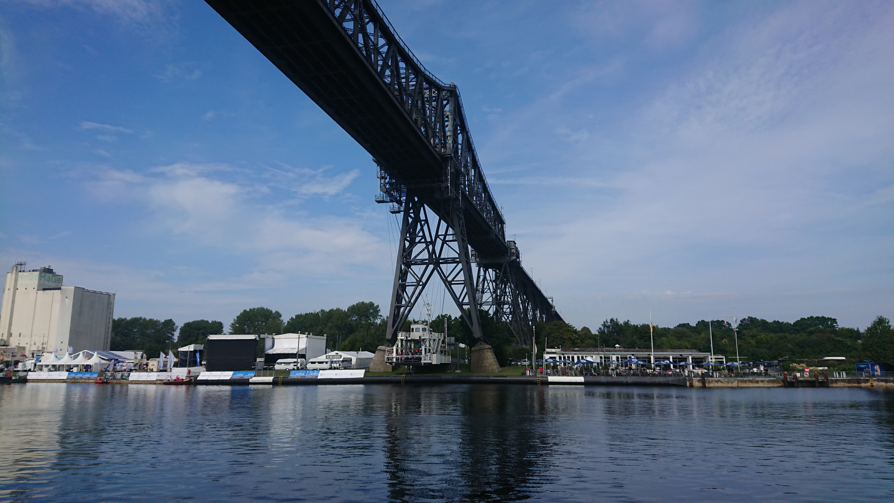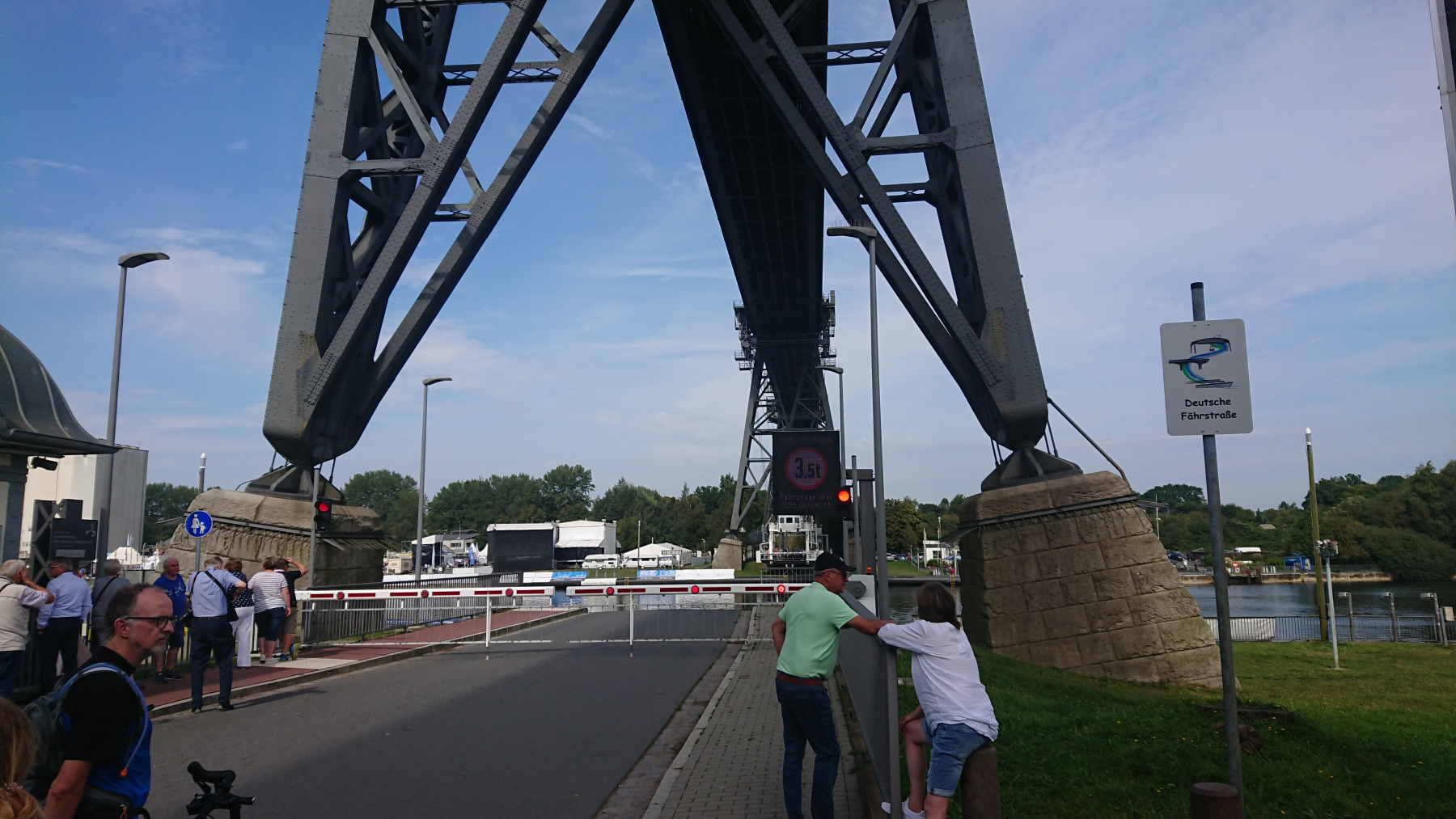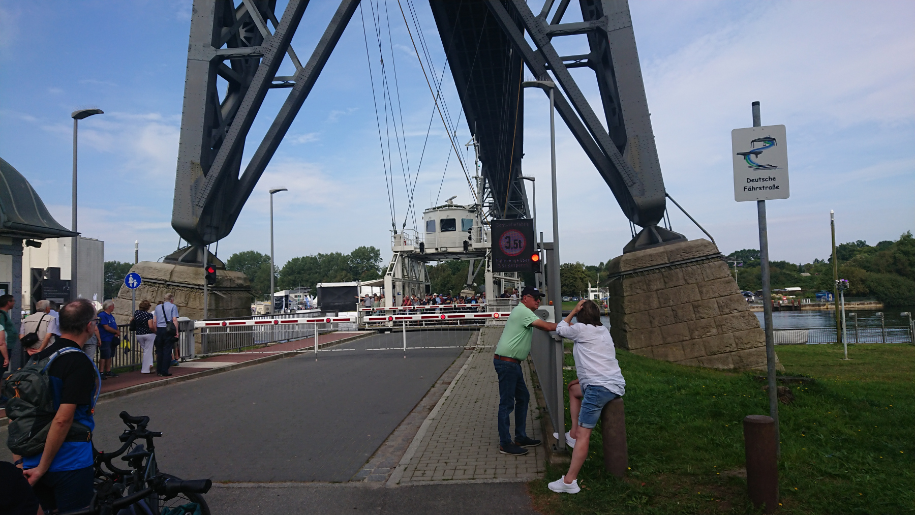 Schon von Weitem können wir die Hochbrücke sehen und bald haben wir sie auch dann erreicht. Die Schwebefähre ist grad auf der Nordseite und so müssen wir ein wenig warten, bis wir auf die andere Kanalseite gebracht werden.