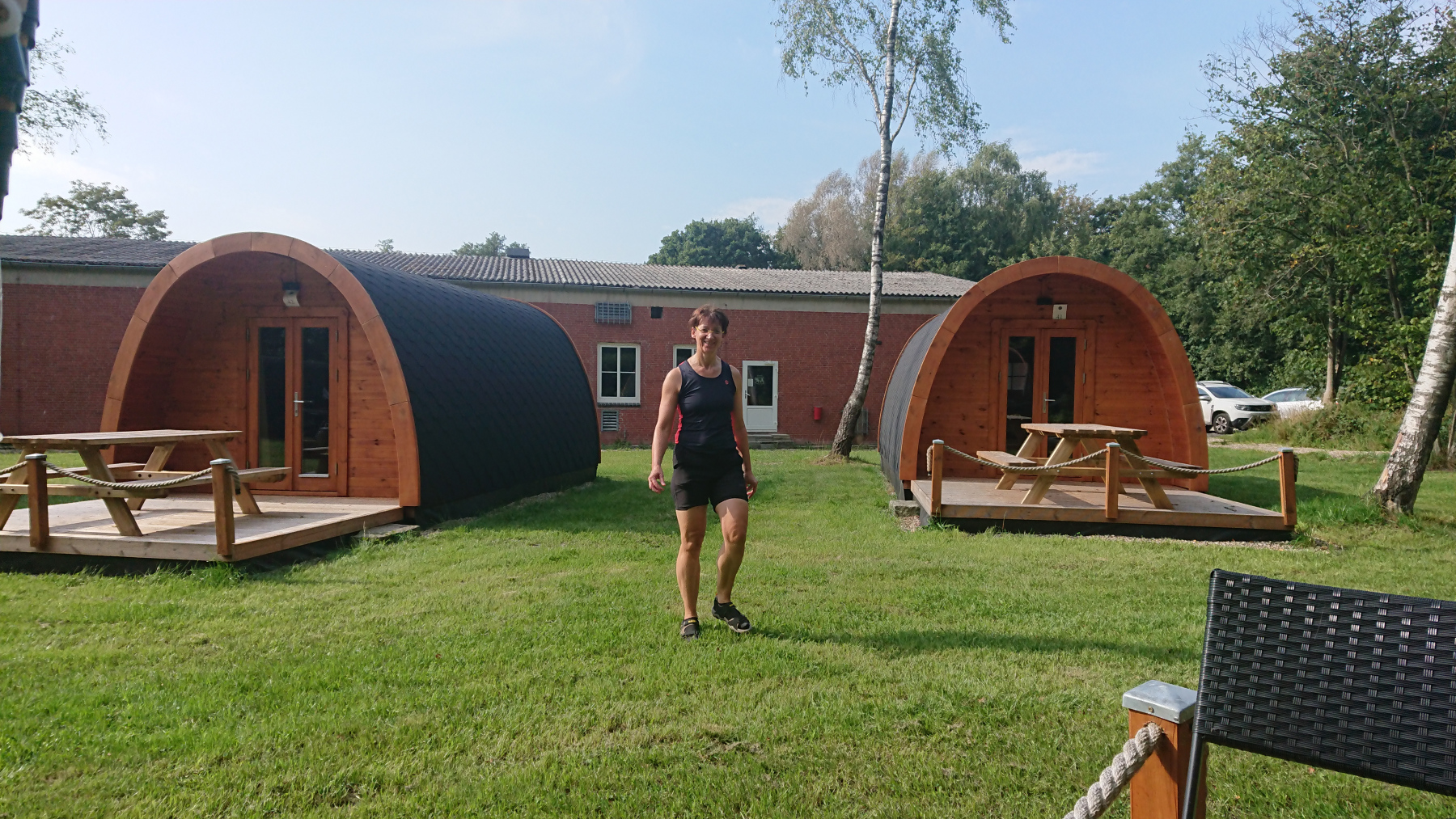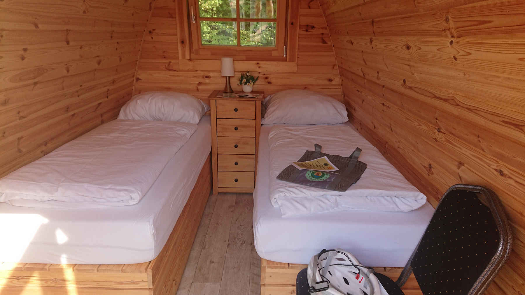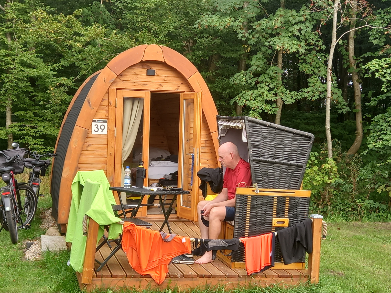 Heute schlafen wir im CampHotel auf einem ehemaligen Bundeswehrgelände in einem Fass. Die Fässer sind recht neu, die Sanitäranlagen sauber und okay, die Gemeinschaftsküche sauber. Außer uns sind aber nur 3 oder 4 weitere Fässer belegt.