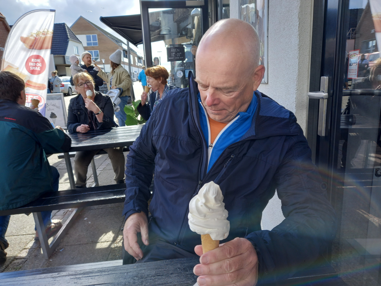 In Hvide Sande dann erfüllen wir, nachdem wir beim lokalen Fischladen geräuchtern Fisch für das Abendbrot und beim Supermakrt Brot und Joghurt gekauft haben, dann die Aufgabe Nr 2 „Eis essen in Hvide Sande“.