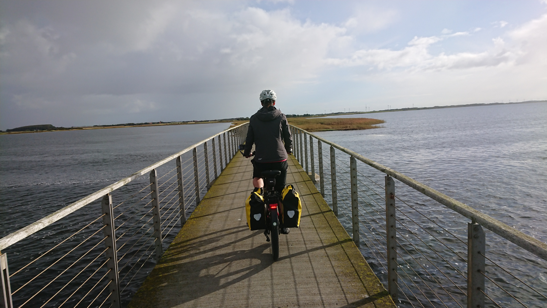 Zunächst fahren wir auf einer schmalen Landzunge und dann auf einer kleine Brücke über den Fjord.