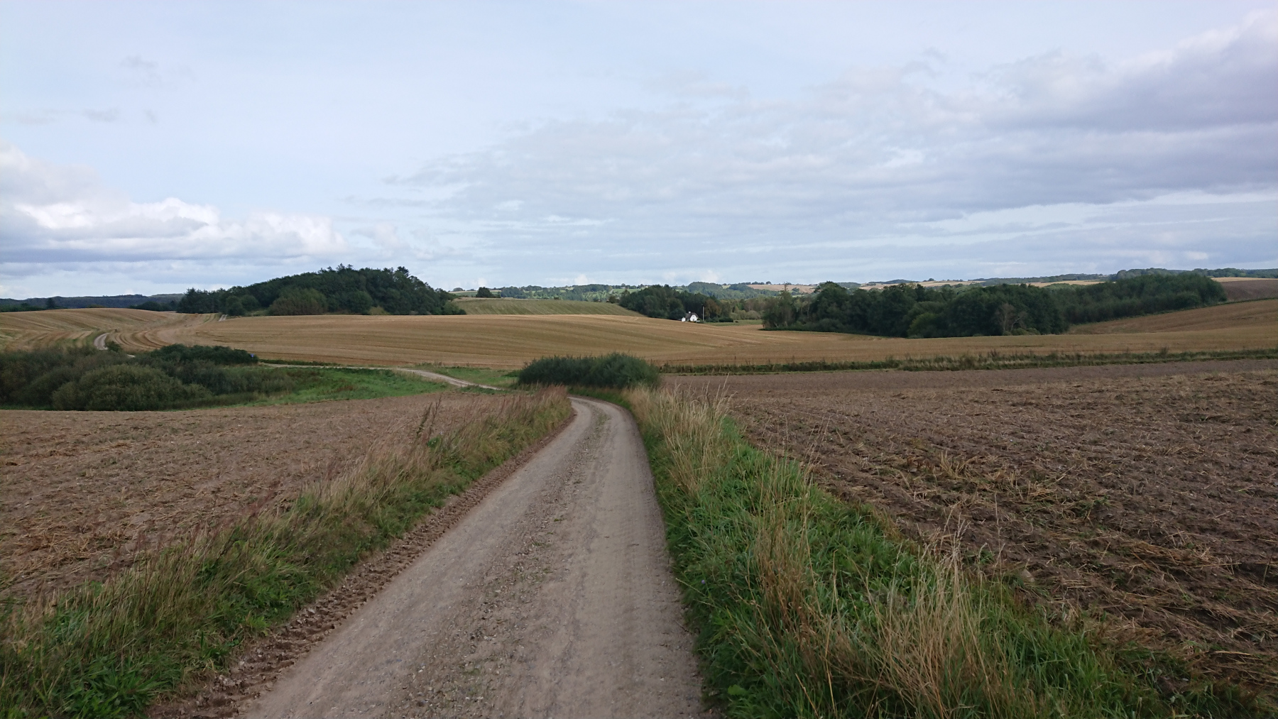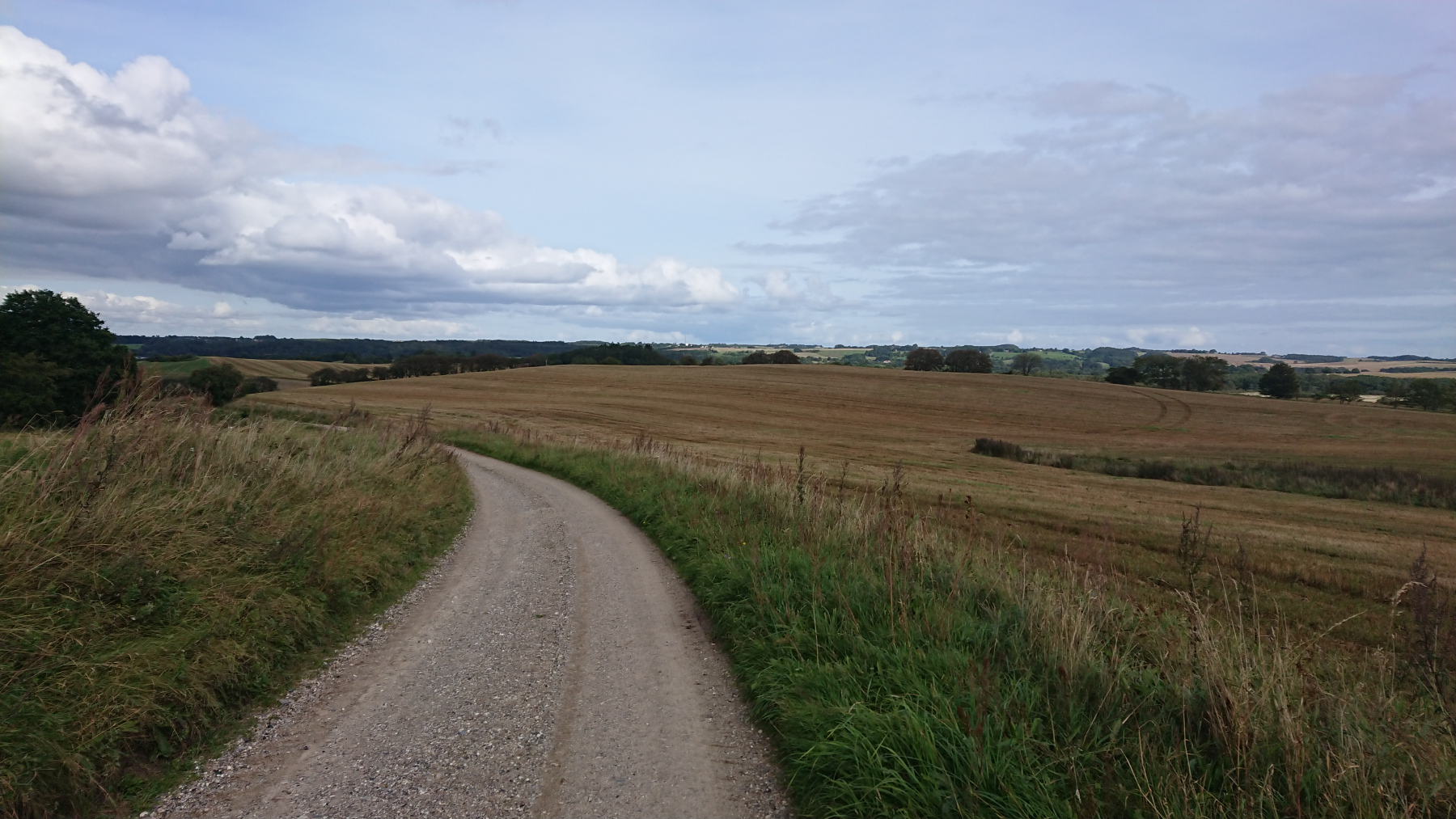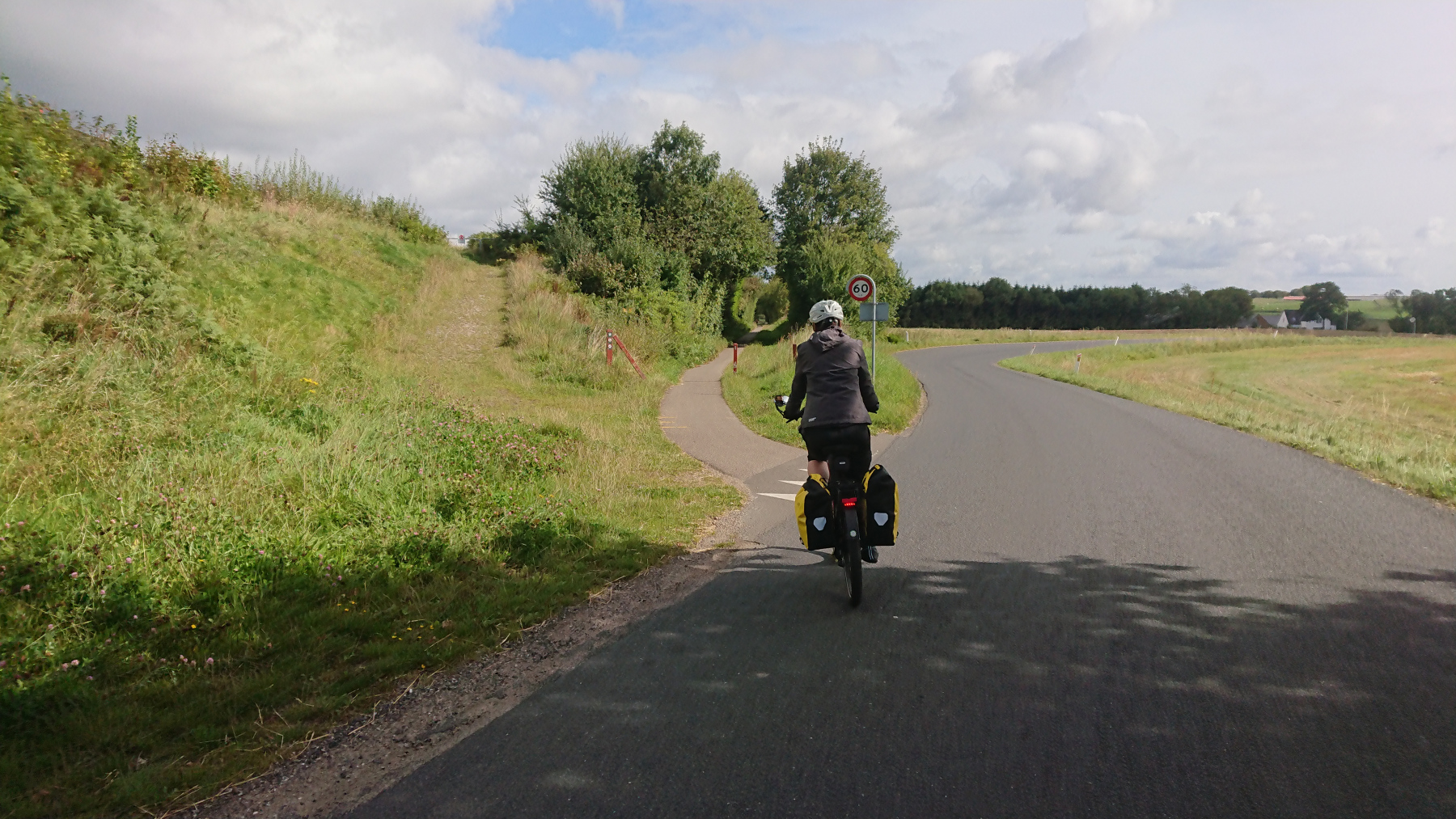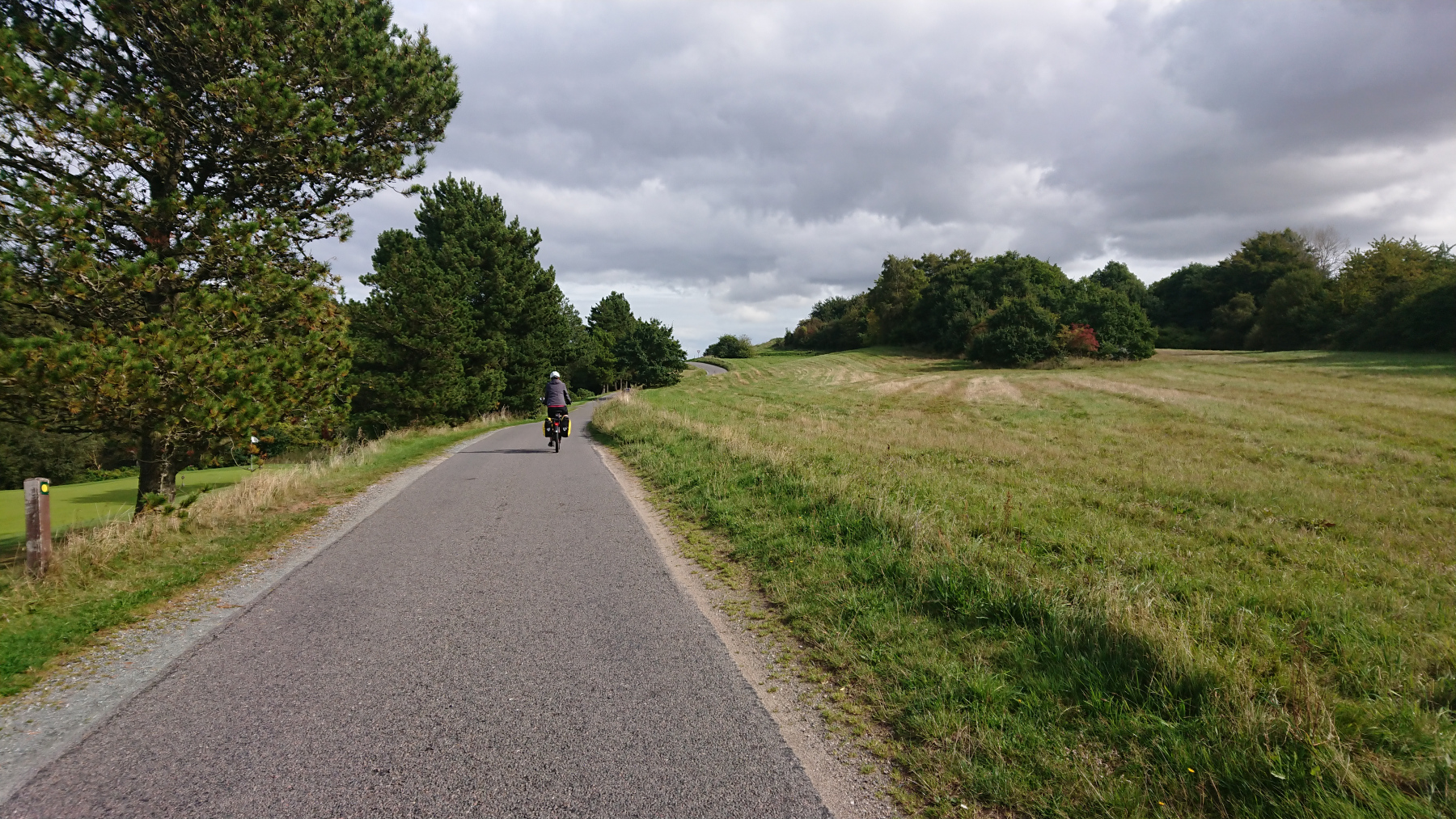 Ab Bædstrup folgen wir einer alten Bahntrasse. Leider zieht sich auch der Himmel weiter zu. Heute werden wir die Jacken wohl nicht los.