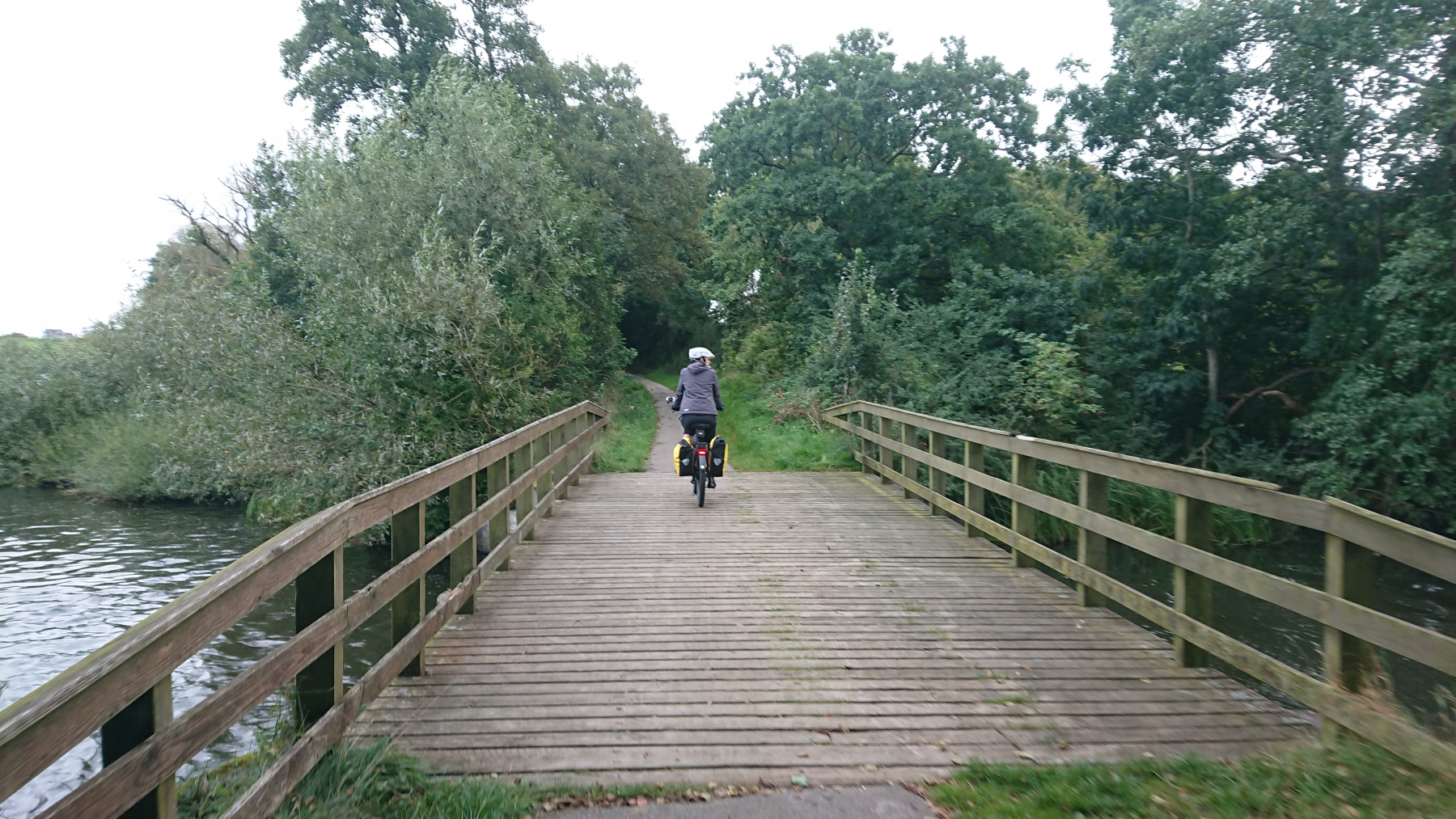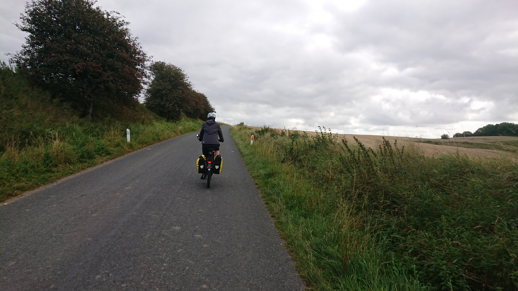 Auf dem Bahndamm ist gut fahren, die Steigungen und das Gefälle sind moderat. Aber es ist anders als mit dem Liegerad. Das E-Bike will auch bei 1-2% Gefälle nicht viel schneller als 27km/h fahren. Das Liegerad fängt bei 2% an, immer schneller zu werden.