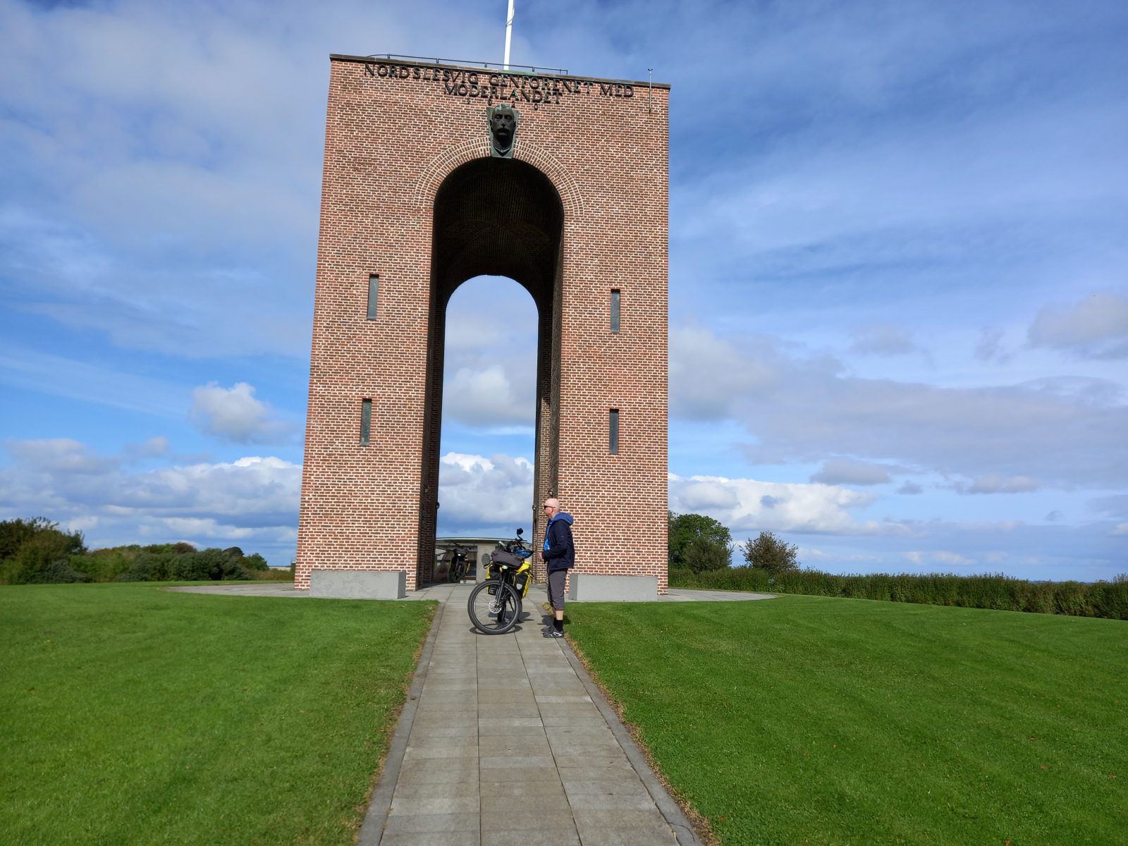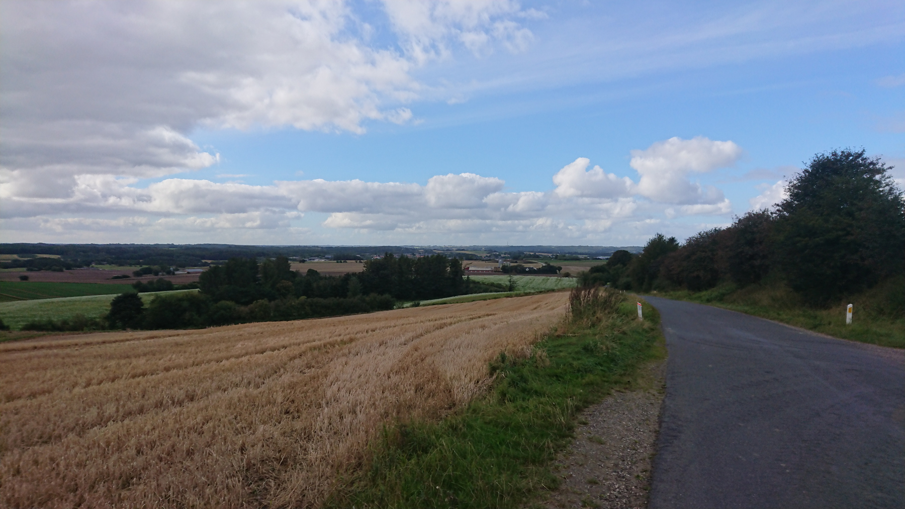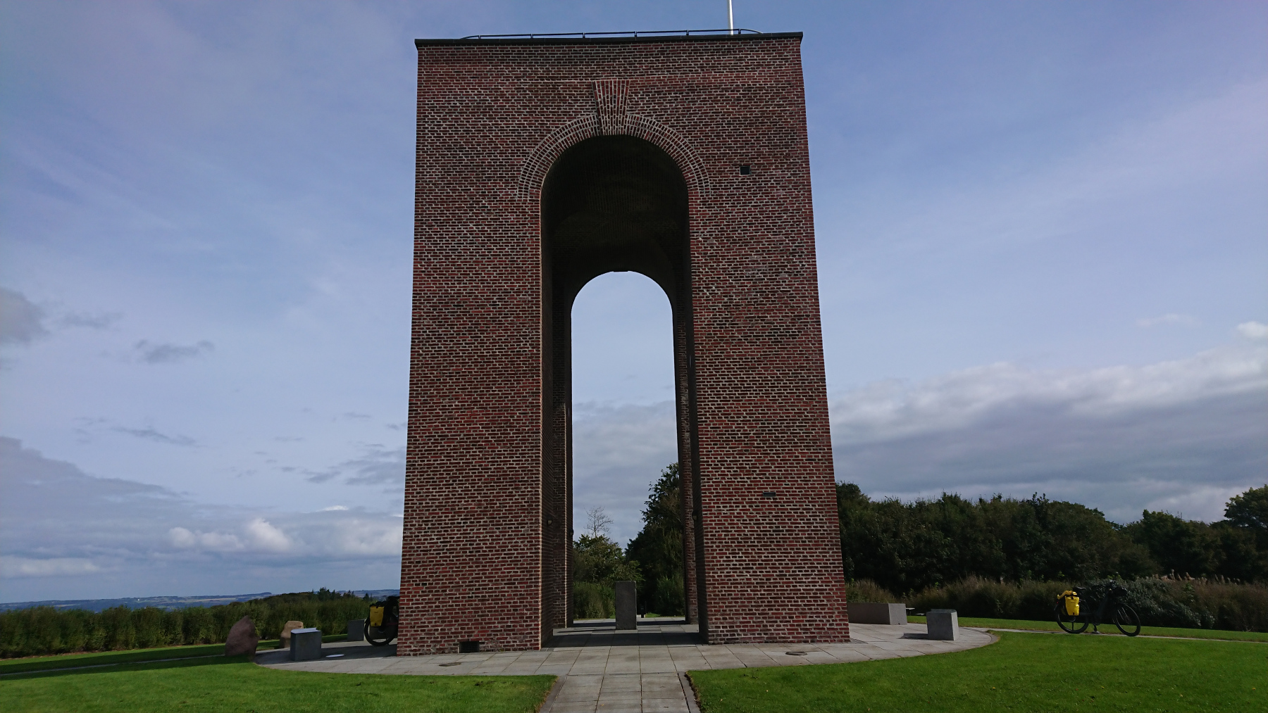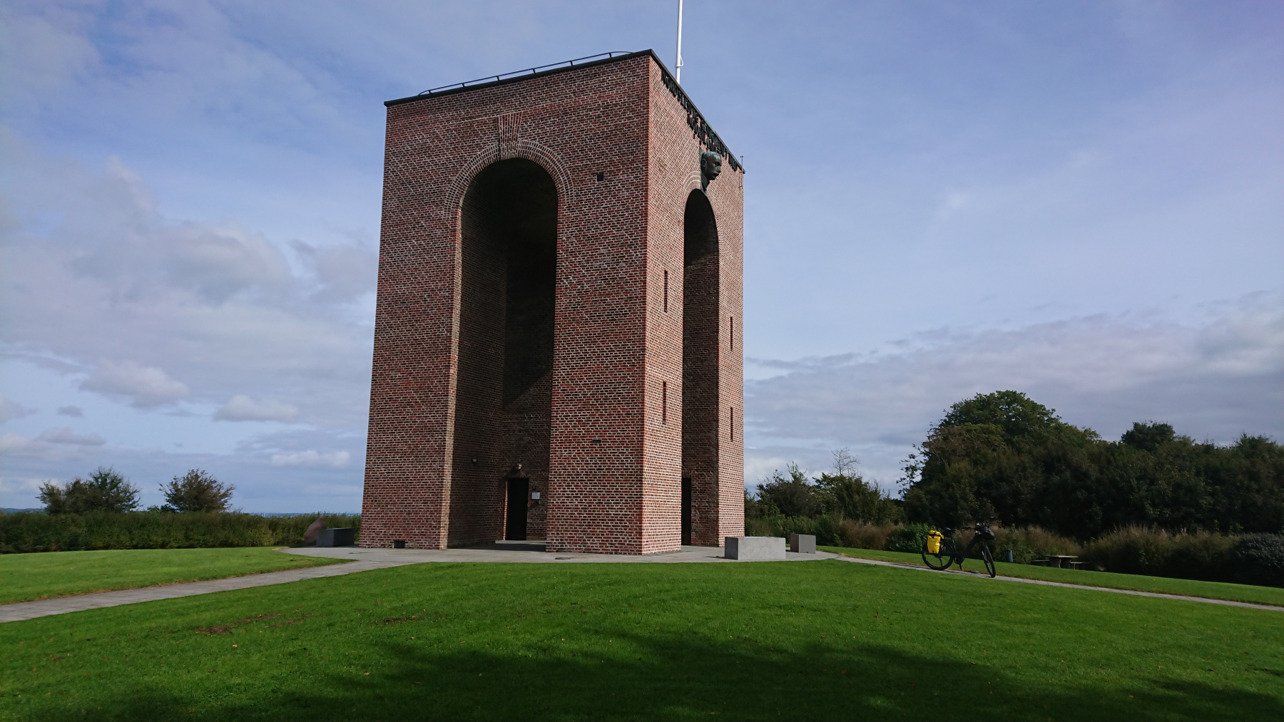 Und dann nach rund 60 km erreichen wir Østbirk. In der Nähe liegen die höchsten Hügel in Dänemark. Berg darf man das wohl nicht nennen, erheben sich die Hügel auf rund 170m ü.NN. Von nun an geht es recht hügelig zu. Møllehøj ist der höchste „Berg“ in DK, auf diesem befindet sich ein Bauernhof. Nebenan ist der Ejer Bavnehøj; dieser ist nur unwesentlich niedriger und man kann ganz nach oben, denn oben ist der „Wiedervereinigungsturm“ errichtet worden.