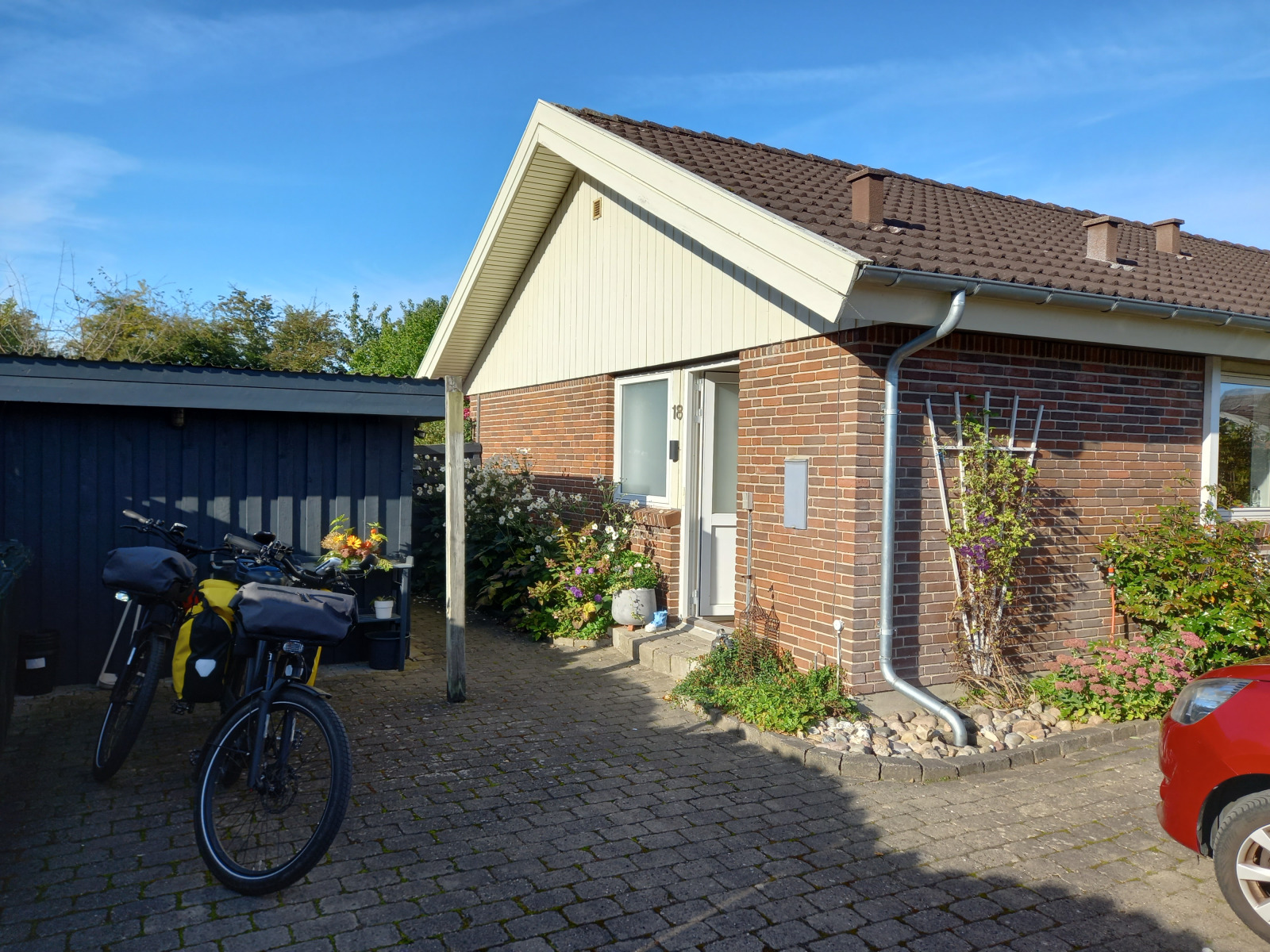 Und dann stehen wir vor einem Privatgrundstück mit großem Tor. Der Mann, der grade das Tor für seinen PKW aufschließt erklärt uns, dass hier kein Durchkommen sei und dass wir zurück müßten und in Richtung Grevinge weiterfahren sollten. Der Weg am Kanal sein nicht für Fahrräder geeignet. Okay, dann also zurück. Also fahren wir die 6km Umweg, kommen hinter Grevinge wieder auf unseren Track und könne weiterfahren.