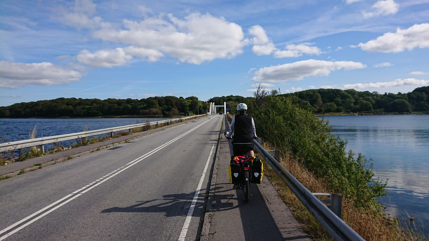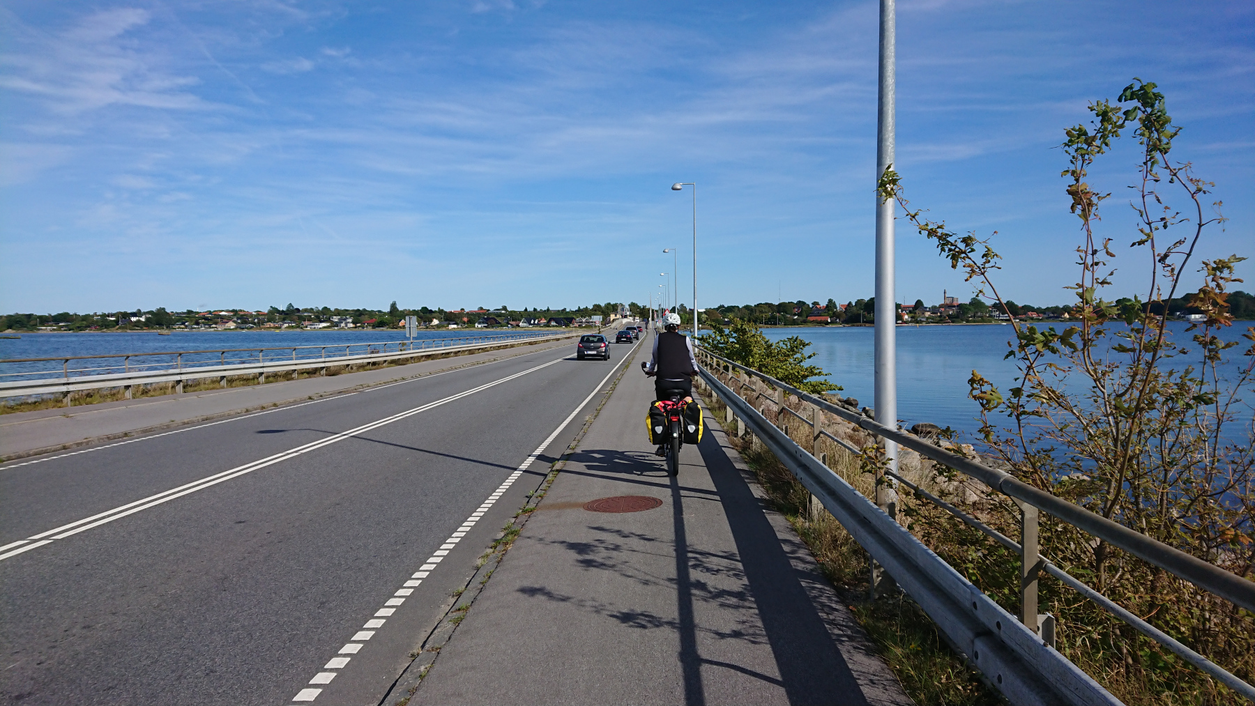 Da wir im Folgenden überwiegend nicht auf Radrouten unterwegs sind, erleben wir noch viele solche Momente an diesem Tag. Wenn möglich meiden wir daher die großen Straßen ohne Radwege, aber manchmal ist es auf den kleine Straßen auch nicht besser. So schlängeln wir uns nordostwärts nach Frederikssund. Bis wir bei km 72 die Frederiks Bro passieren und auf die andere Seite des Roskilde Fjordes gelangen.