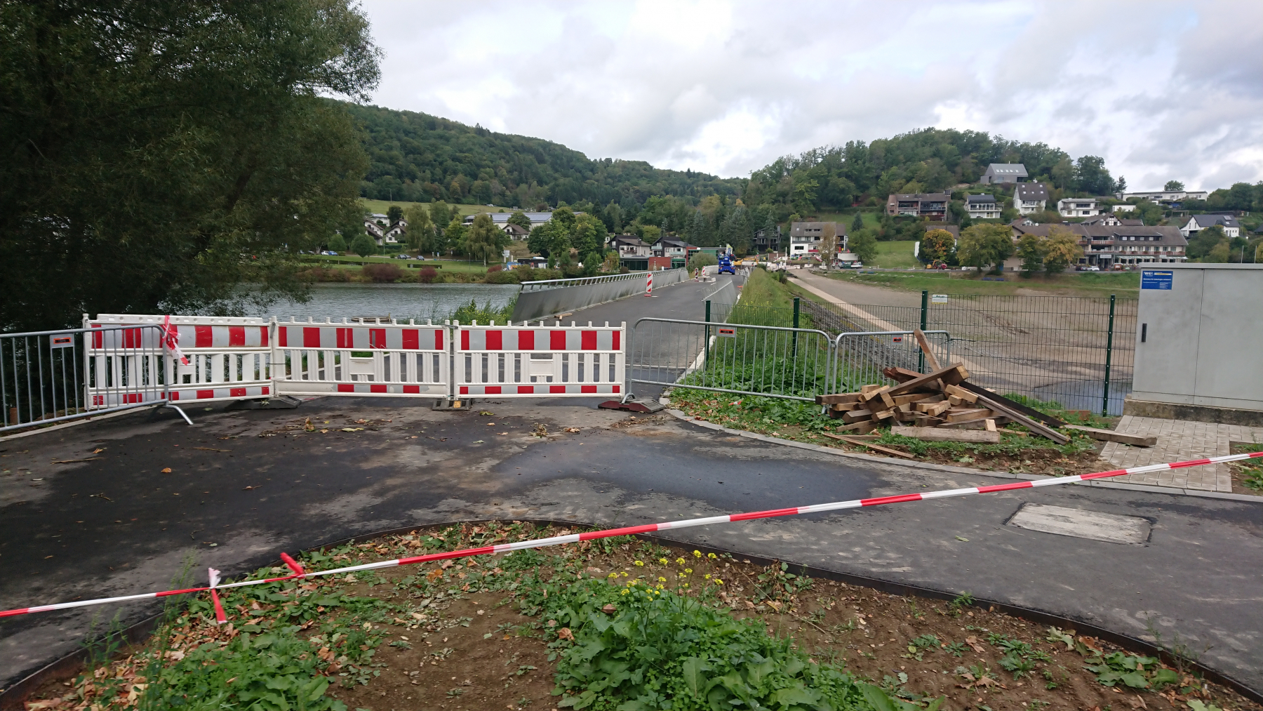 Der Rurtalradweg ist hier gesperrt, Umleitung Fehlanzeige – den Weg müssen wir uns selber suchen und uns dann auch noch an den Baustellenfahrzeugen am Rande der Baustelle vorbeiquetschen.