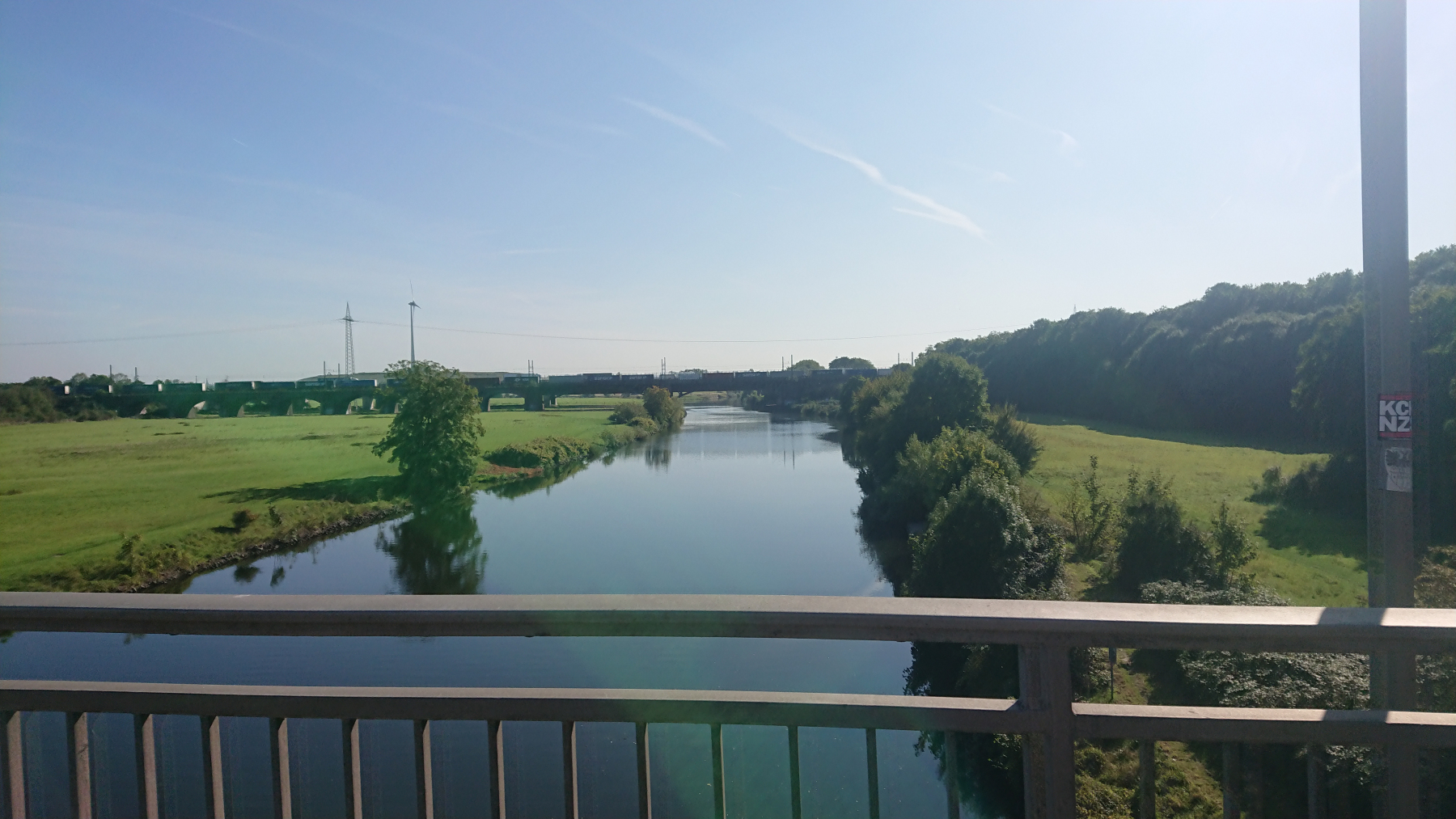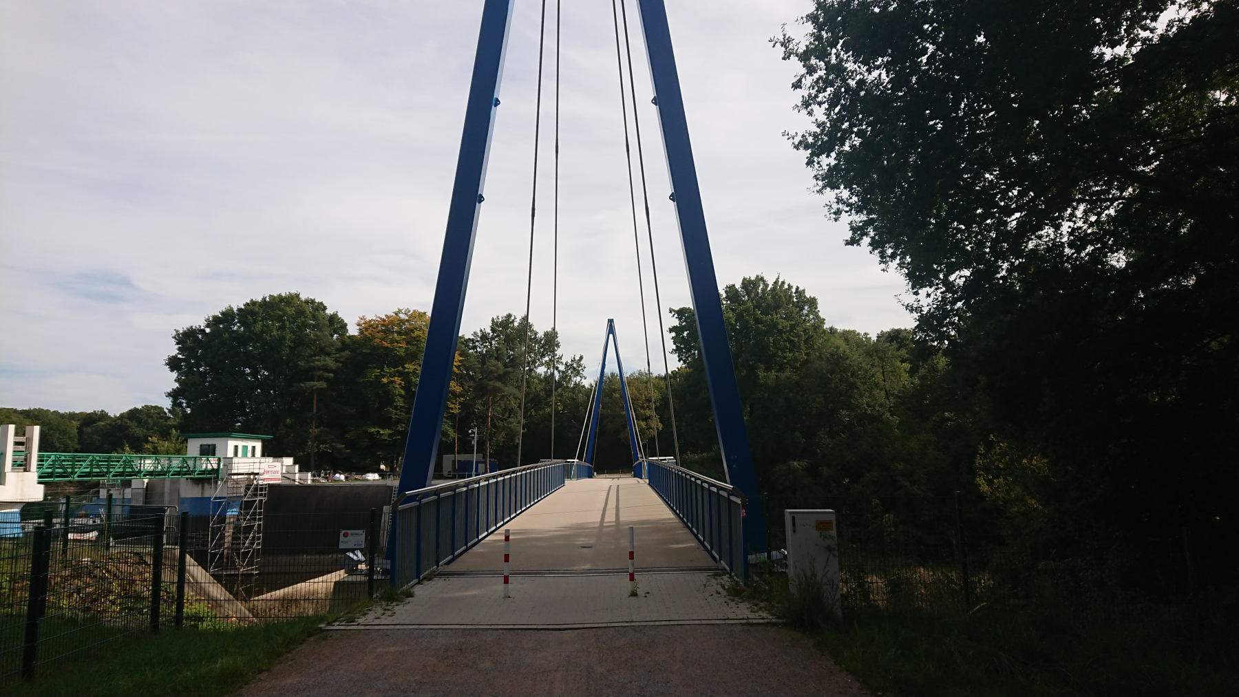 Vorbei an der Halde Haniel ( 184m hoch) kommen wir hinaus aus dem gewusel des Ruhrgebietes. Die Orte werden wieder kleiner, es gibt Wald und Wiesen. Bei Dorsten überqueren wir auf einer alten Brück mit wackeligen Gitterplatten die Lippe.
