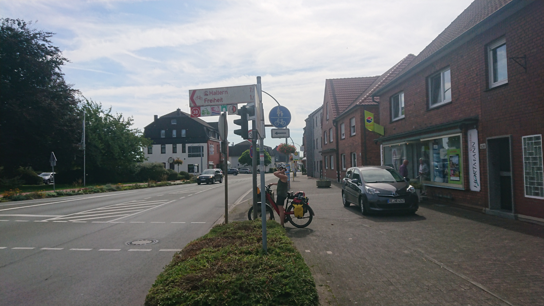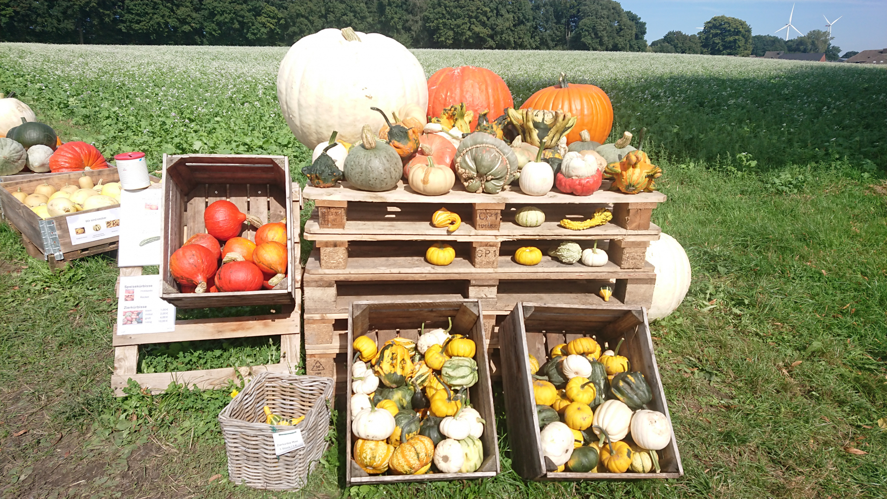 Bis zu unserem heutigen Ziel in Haltern am See sind es nun noch rund 10 km. Am Straßenrand ein Verkaufsstand mit Kürbissen zeigt uns, dass wir nicht mehr im Sommer sind, auch wenn der heutige Tag noch mal einen Hauch von Sommer in den Herbst schickt.