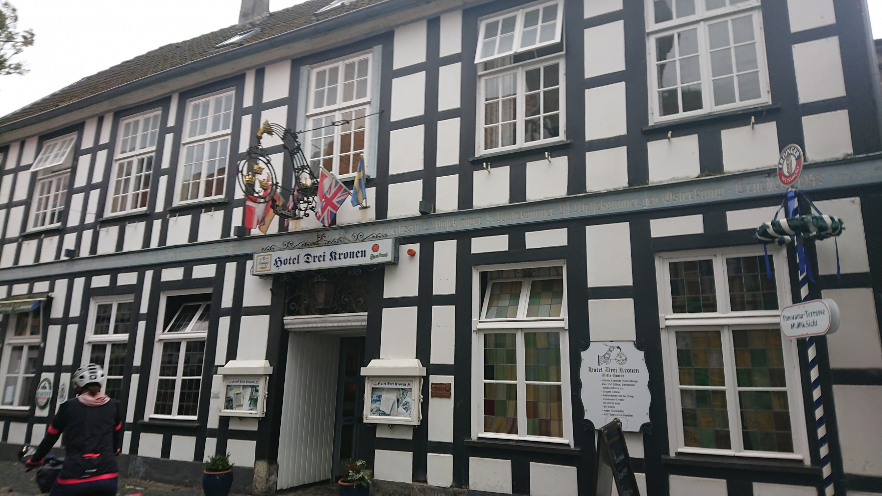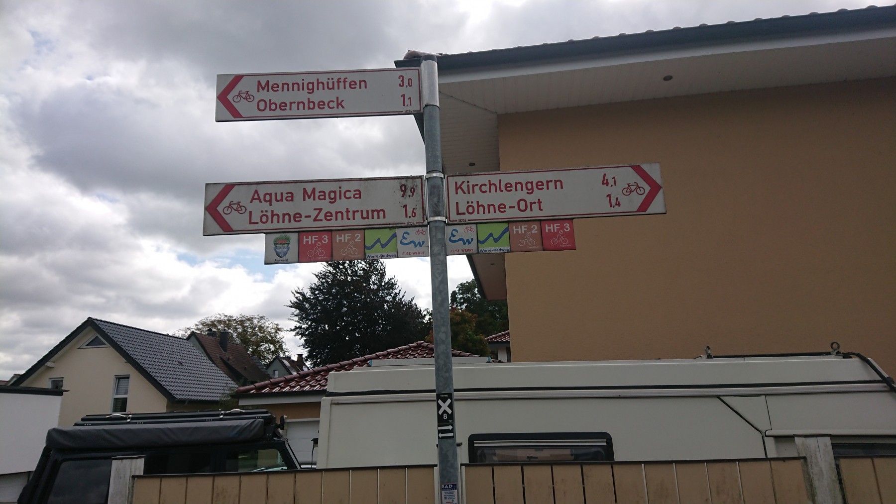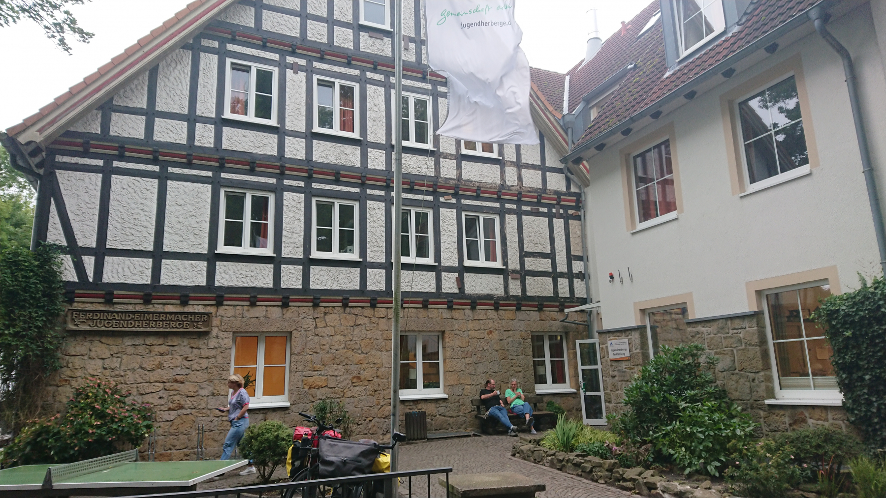 Nun sind es nur noch ein paar km entlang der Weser bis nach Porta Westfalica. Ein kleiner Anstieg zur Jugendherberge denn auch hier haben wir kurzfristig keine bessere Unterkunft bekommen. Da heute Sonntag ist, ist die DJH nicht von Schulklassen oder anderen Gruppen bevölkert, die reisen erst am Montagmorgen wieder an. Wir werden gebeten, das Zimmer bis 9:30 Uhr am nächsten Morgen zu verlassen. Okay – das ist für uns leicht machbar. Und da wir mit nur noch drei anderen Gästen hier heute übernachten gibt es auch kein Abendbrot. Der erste Lieferdienst hat geschlossen, der andere benötigt mehr als 1:30 Std, um uns unsere Nudeln zu bringen, und das obwohl wir kurz nach Öffnung um 17:00 Uhr die Bestellung aufgegeben haben.