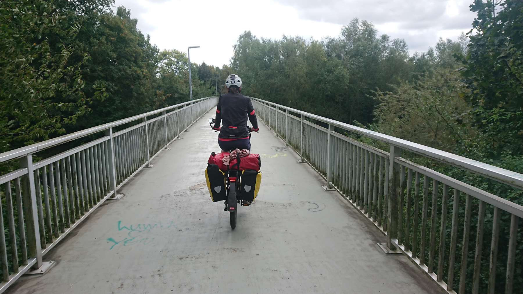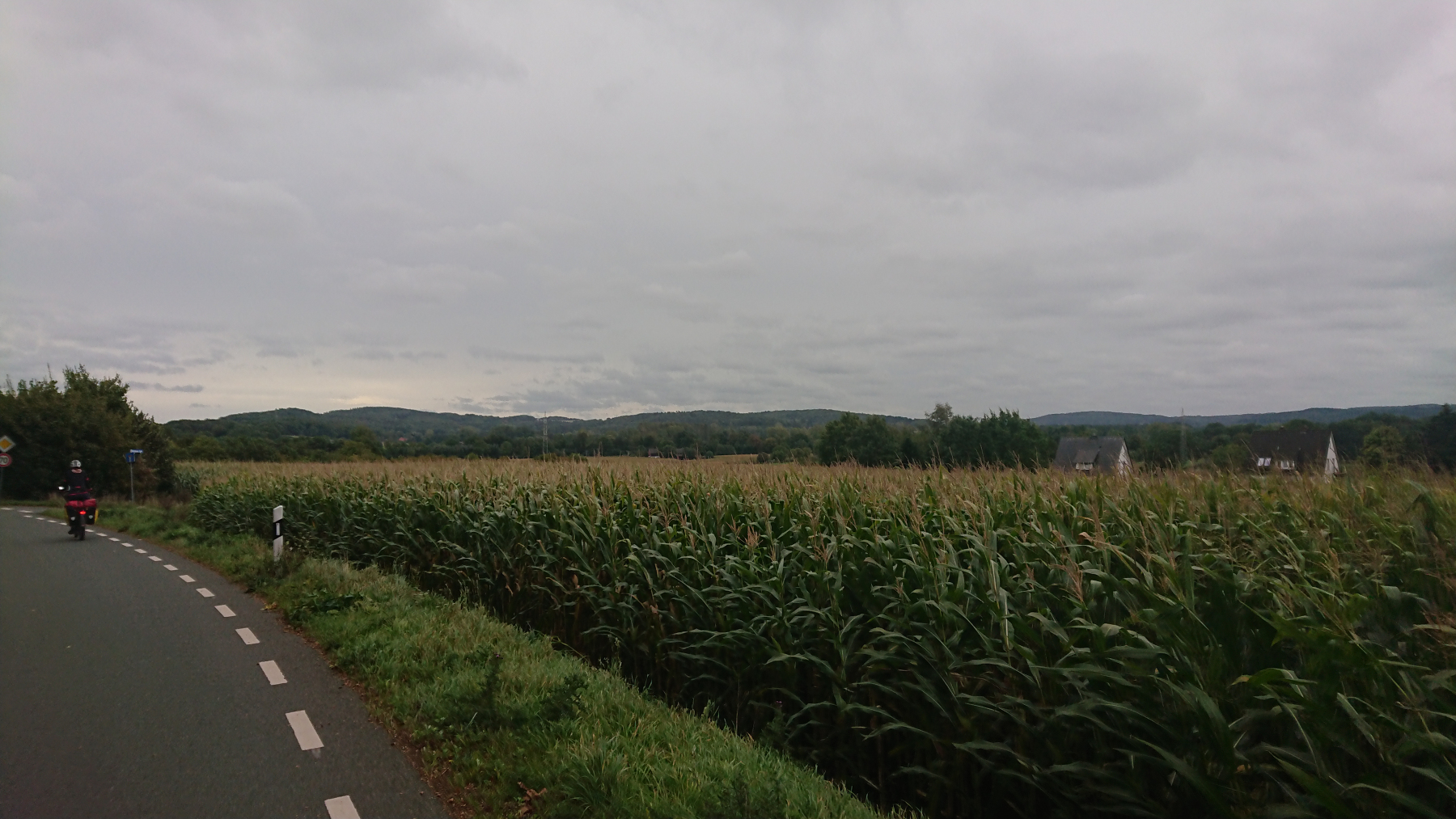Erst gegen Mittag kommt für 1-2 Stunden noch mal die Sonne raus und es wird dann auch was wärmer. Wir folgen dem Else-Radweg, der aber meistens nicht an der Else entlangführt sondern uns durch Wiesen und Weiden oder auch mal dicht an der A30 entlangführt.