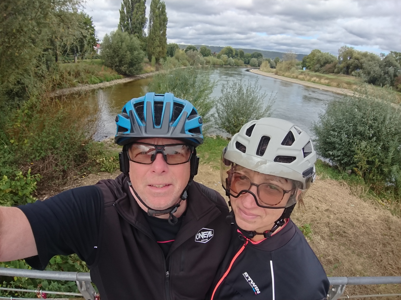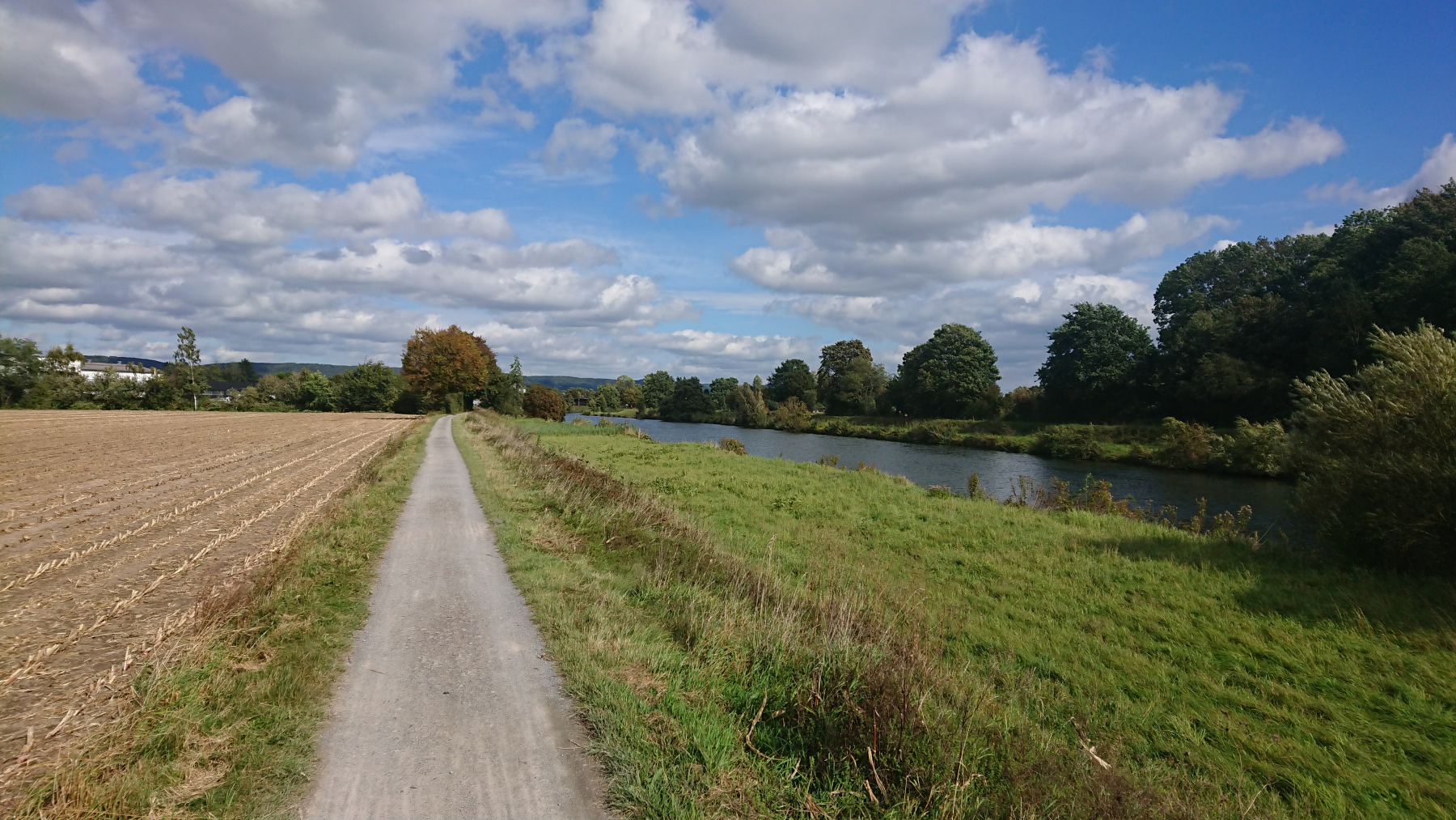 Unsere zweite heutige Pause machen wir bei kräftigem Wind am Tunierpark im Sielpark. Auf einer Bank sitzend schauen wir auf die Werre, der Wind pfeift uns kühlend um die Ohren, so dass wir so schnell wie möglich wieder weiterfahren.