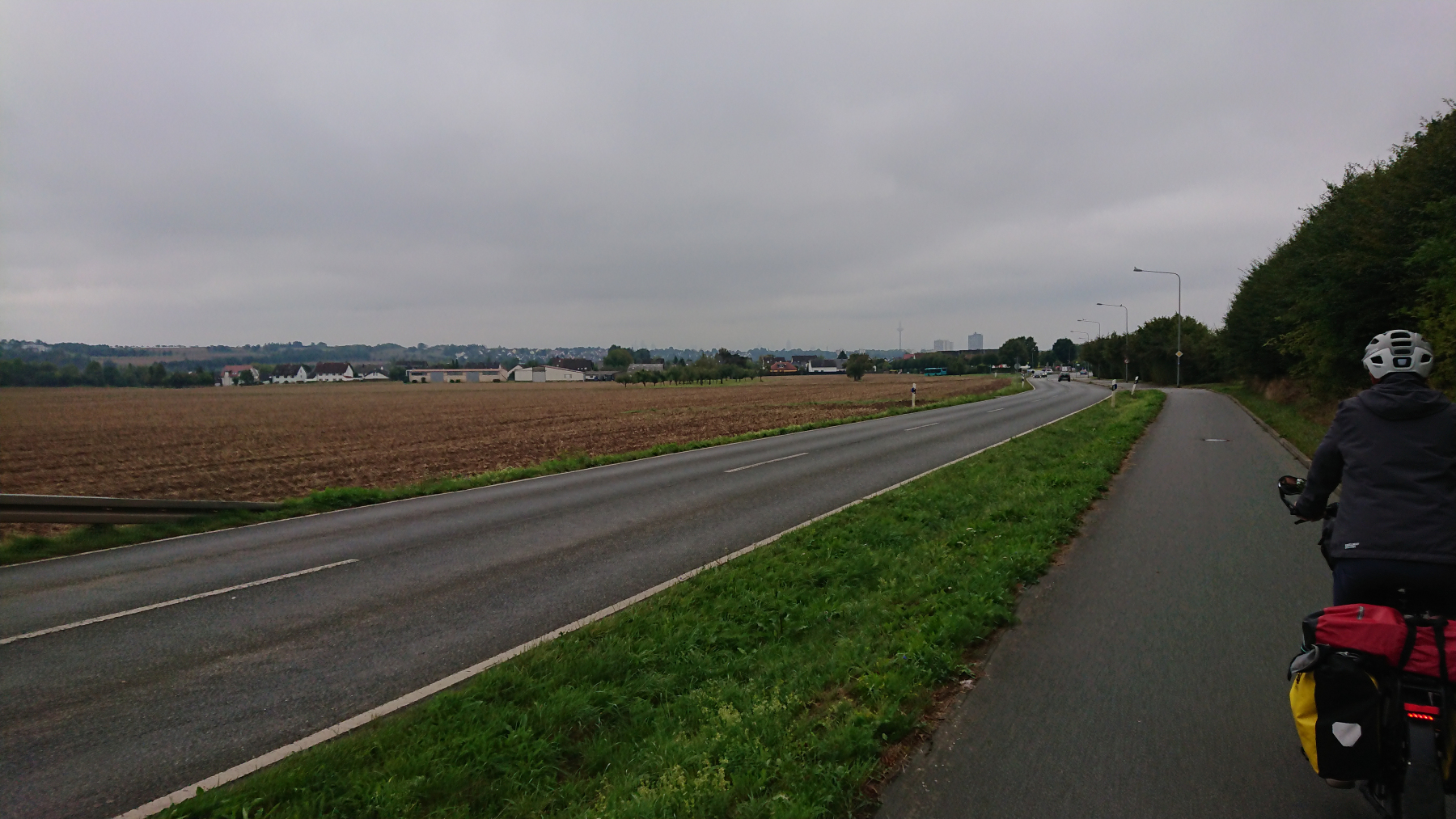 Von Obbornhofen geht es südwärt immer Richtung Frankfurt, vorbei an Bad Nauheim geht es immer durch Felder. Nach gut zwei Stunden sehen wir die Skyline von Frankfurt im Dunst.