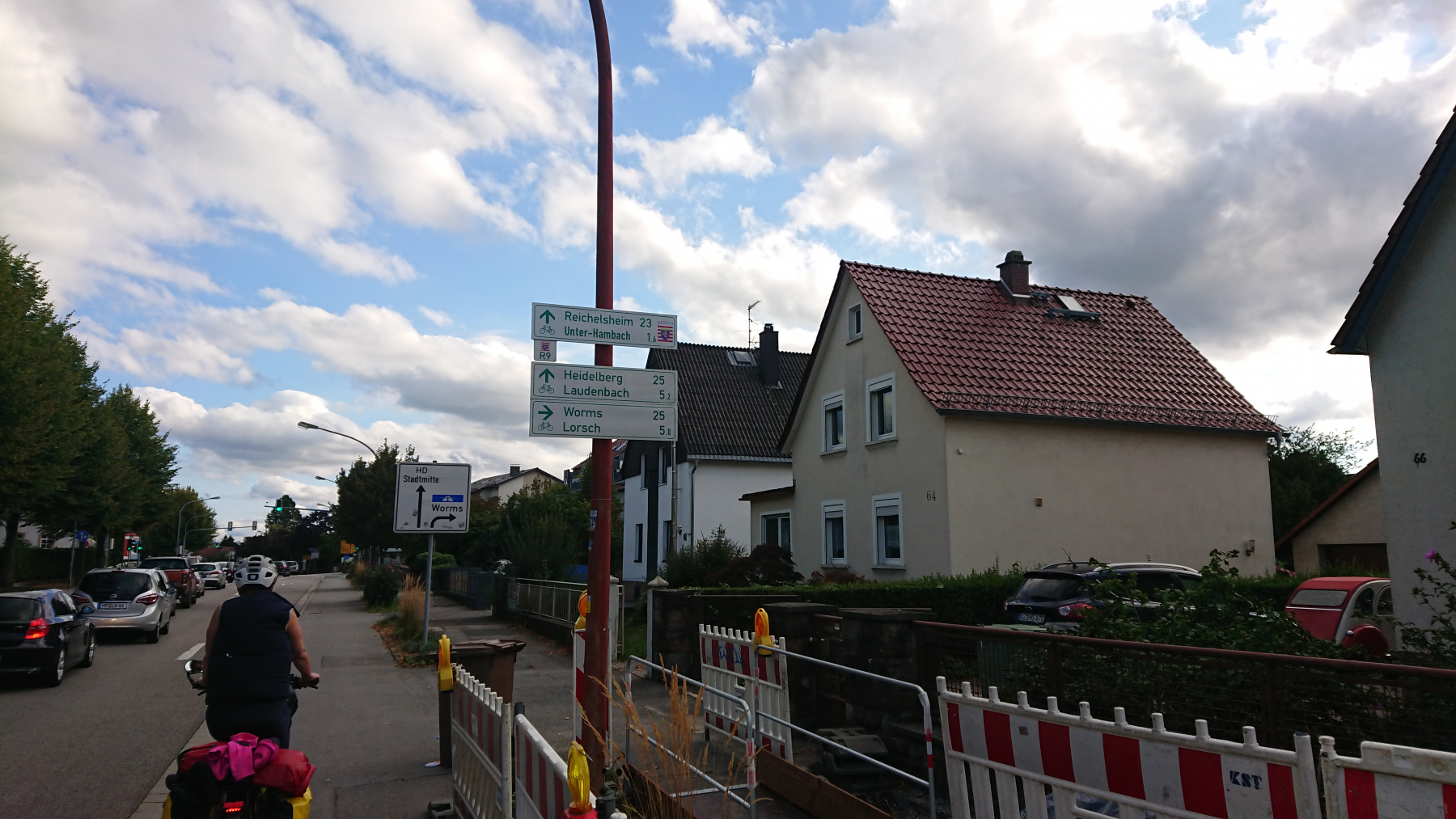 Wir fahren einen kleinen Umweg, kommen zurück auf die Route und fahren km um km nach Süden. Seeheim, Zwingenberg, Bansheim, Heppenheim – alle diese Orte müssen wir durchqueren. Hier ist das Radfahren meist nicht so schön, oder wir haben die falsche Route durch die südliche Weinstraße. Entsprechend mäßig wird unsere heutige Durchschnittsgeschwindigkeit sein.