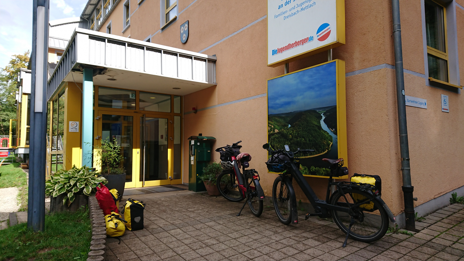 In Merzing geht es einmal auf die andere Saar-Seite zum einkaufen und dann wieder zurück, gut 15 km sind es noch bis Dreisbach. Auch dort haben wir wieder die Jugendherberge gebucht, die aber bei weitem nicht an die Ausstattung von Homburg herankommt. Wir haben ein Zimmer mit Doppelstockbett und Dusche und WC. Alles okay. Und auch wenn die Jugendherberge nicht so modern ist, wir würden hier auch noch mal übernachten.
