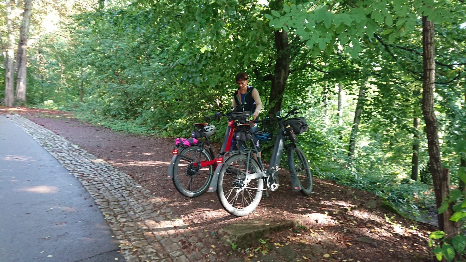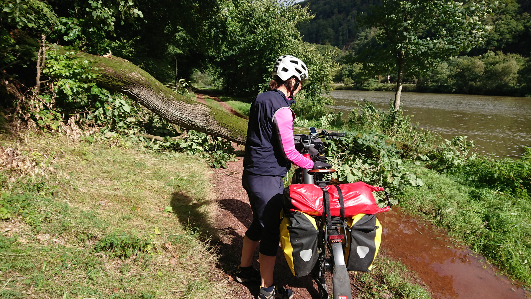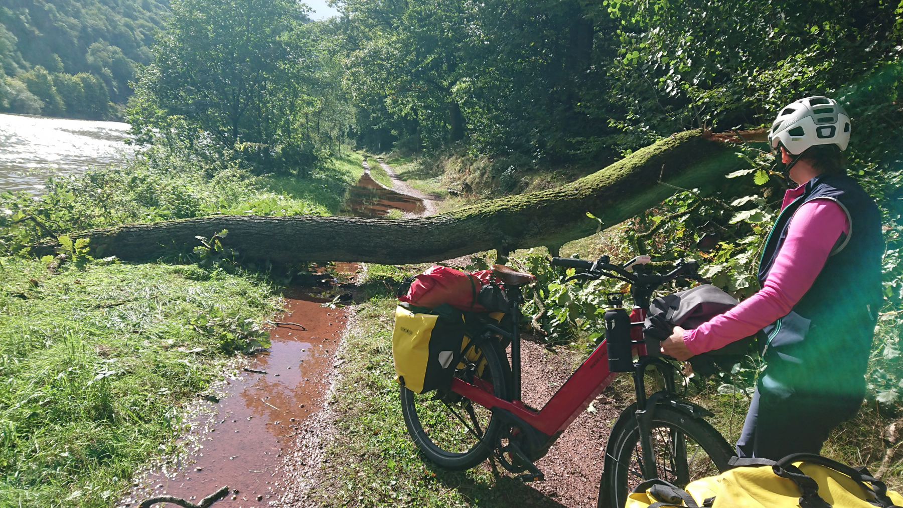 - Wegsperren durch einen umgestürzten Baum, über den wir die Räder hinwegtragen müssen.