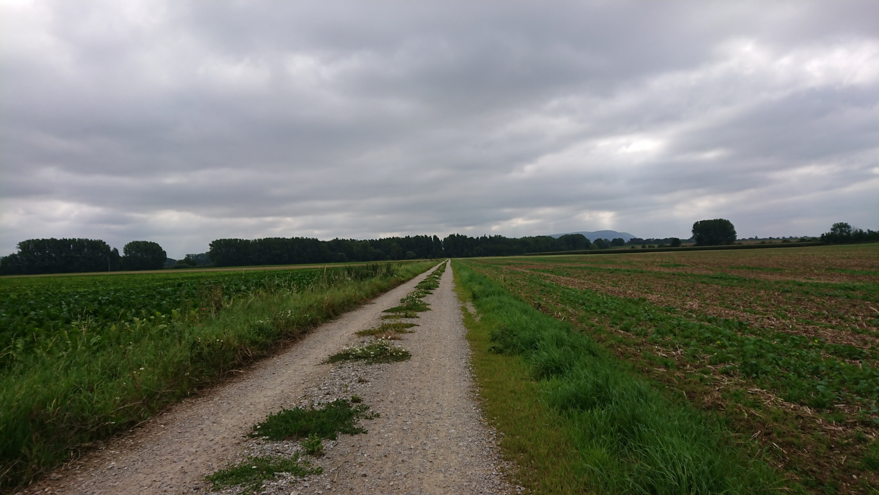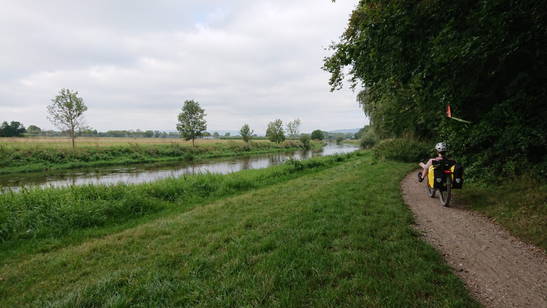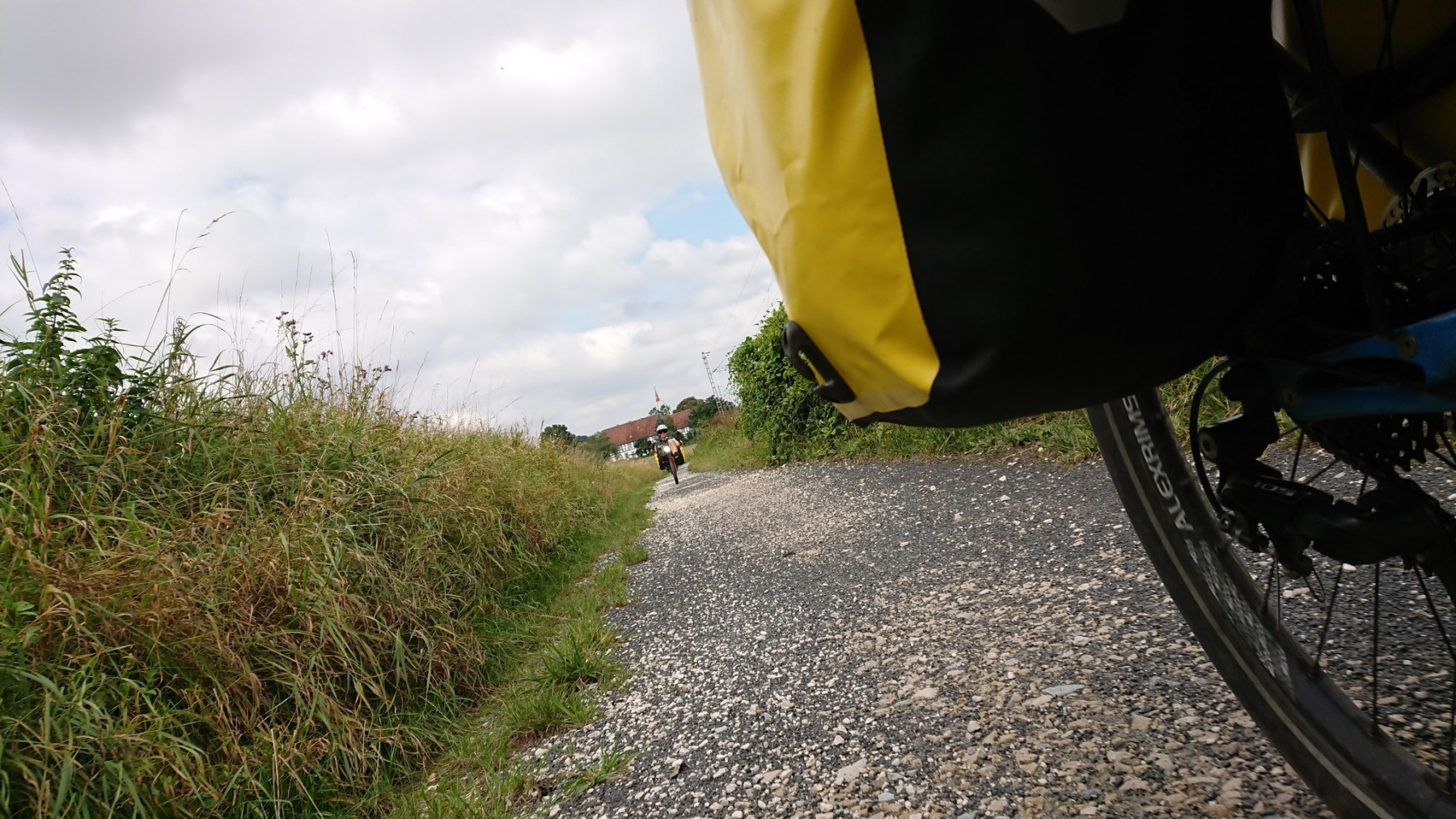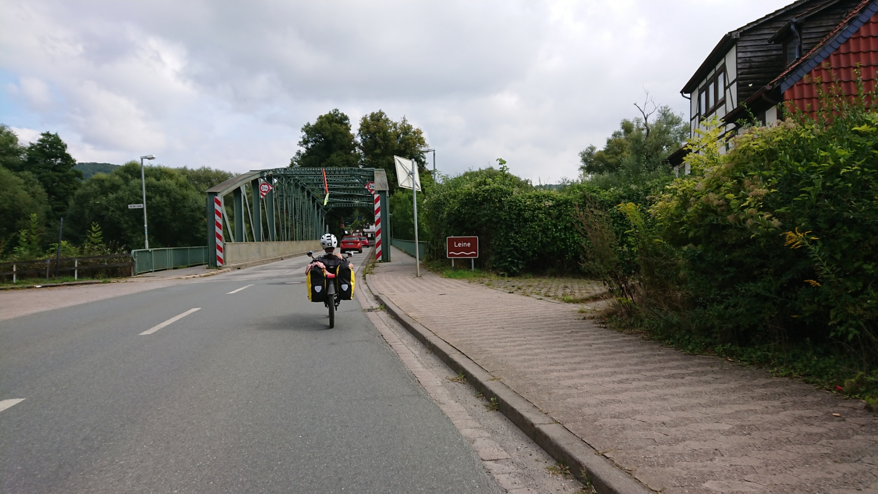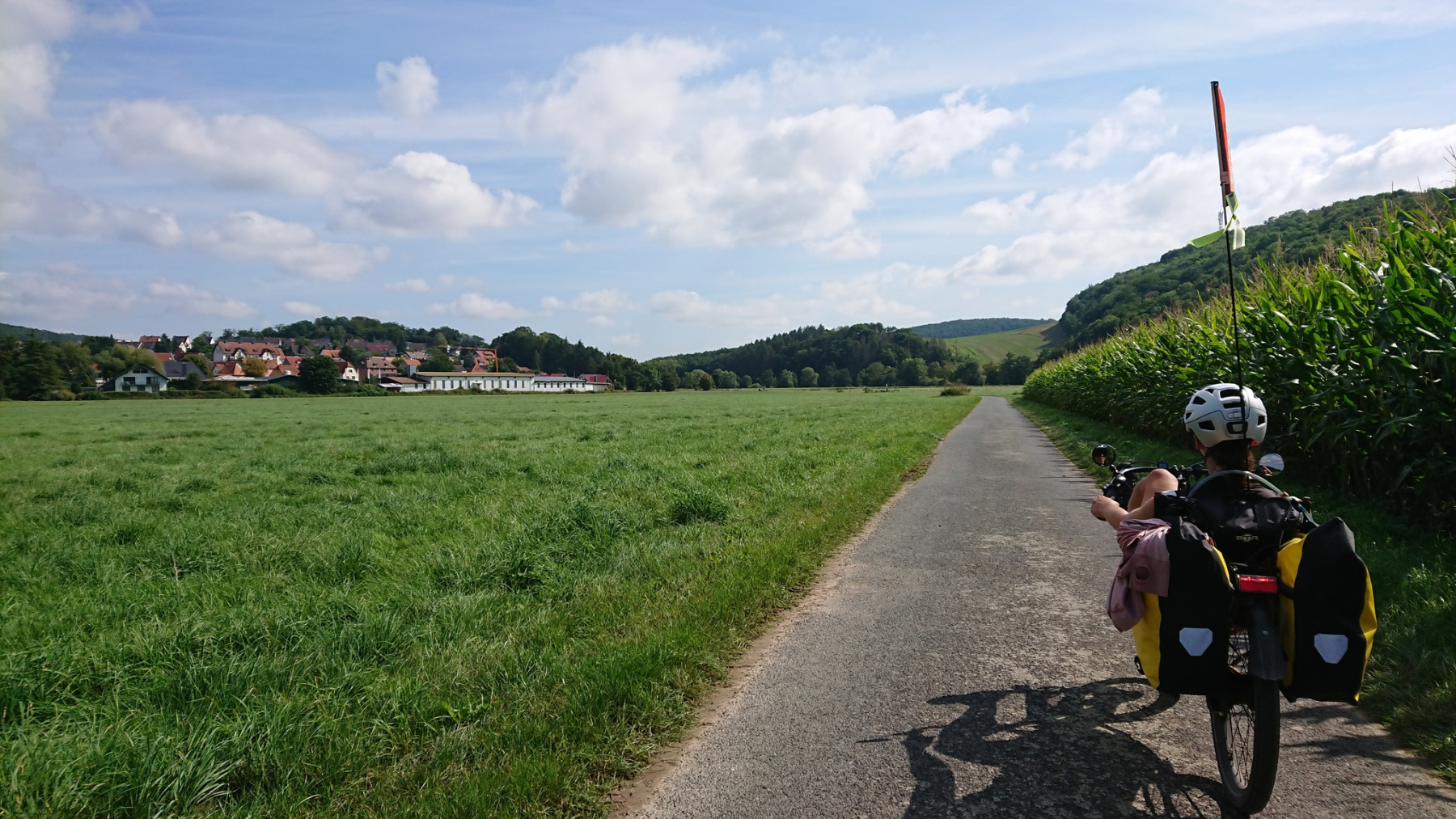 Das Frühstück in der Bäckerei ist ausgesprochen lecker. Danach noch schnell die Taschen gepackt und dann kann es auch schon losgehen. Schon bald nach der Abfahrt sehen wir am Horizont die ersten richtigen Hügel auftauchen. Zuerst noch leicht im Dunst des Morgens aber wir kommen ihnen mit jeder Kurbelumdrehung näher. Ab heute sind wir auf dem Leine-Radweg unterwegs. Dieser führt zunächst meistens über kleine Straßen oder gute landwirtschaftliche Wege mal nah an der Leine und auch ein wenig entfernt davon durch kleine Orte Richtung Süden.