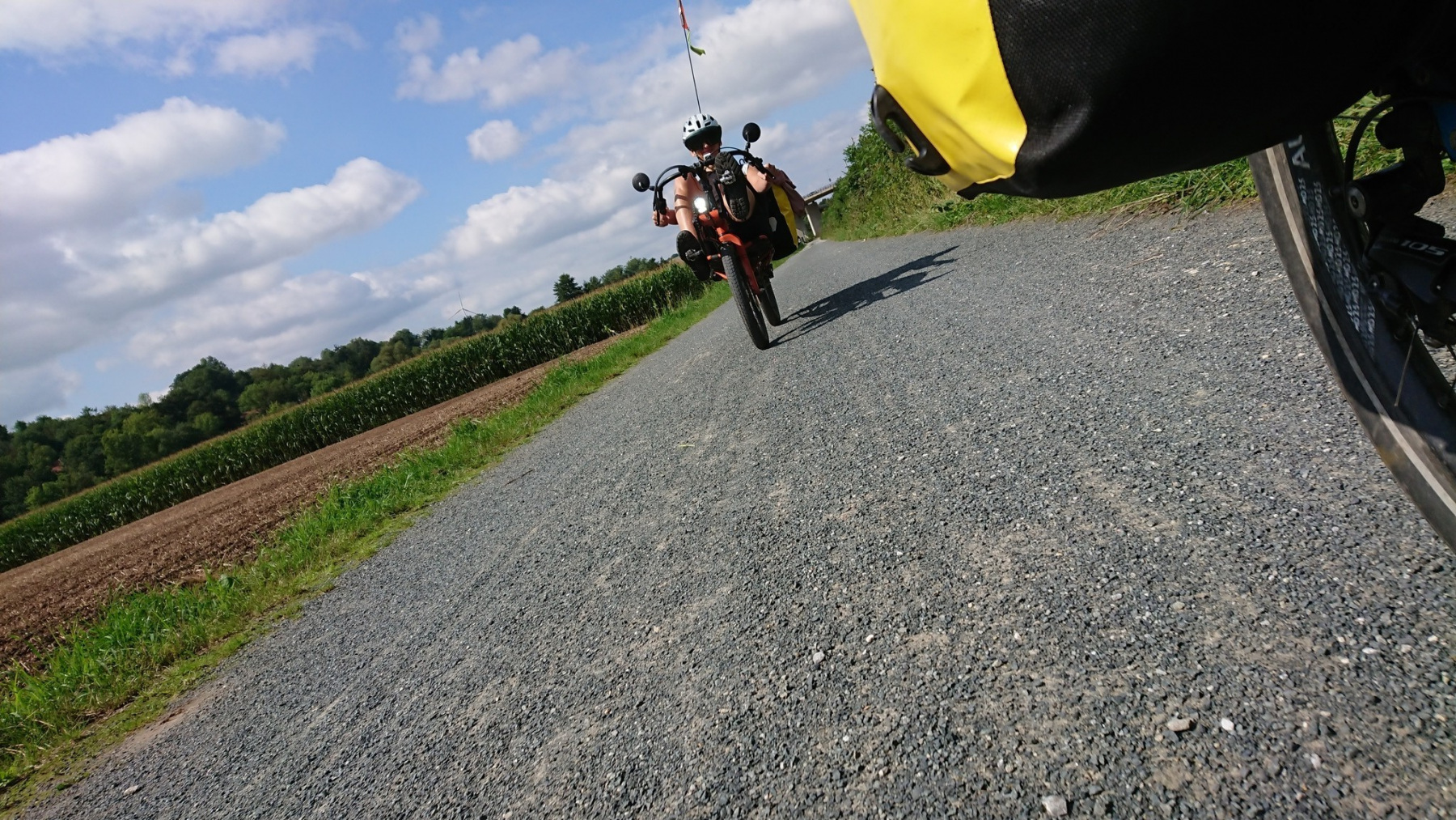 Der Belag wechselt häufig zwischen Asphalt und festem Split/Sand, auf beiden Untergründen kommen die Wölfe gut voran. Wir fahren am Pumpspeicherwerk in Erzhausen vorbei, sehen aber nur die dicken Rohleitungen und den Deich vom unteren Speichersee.